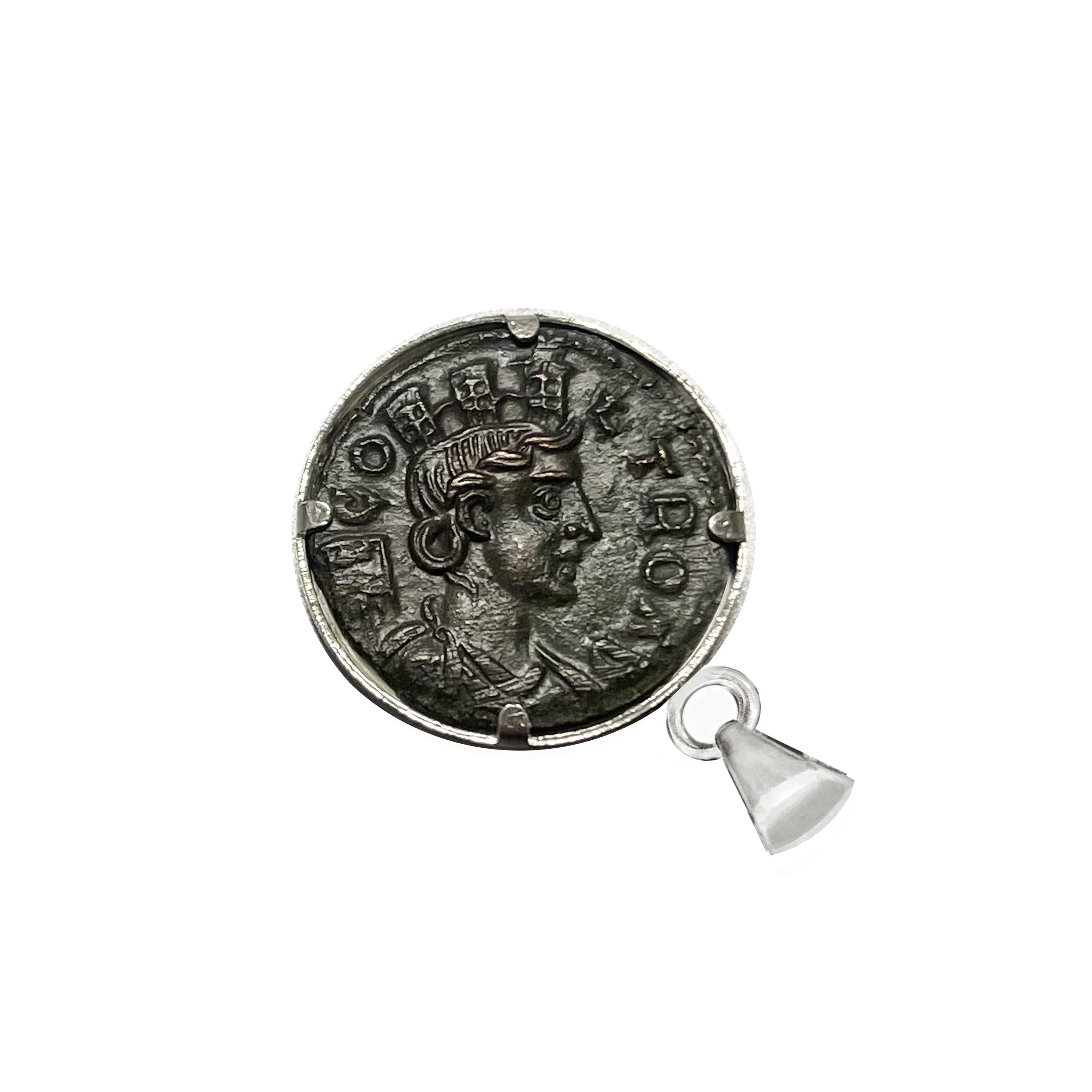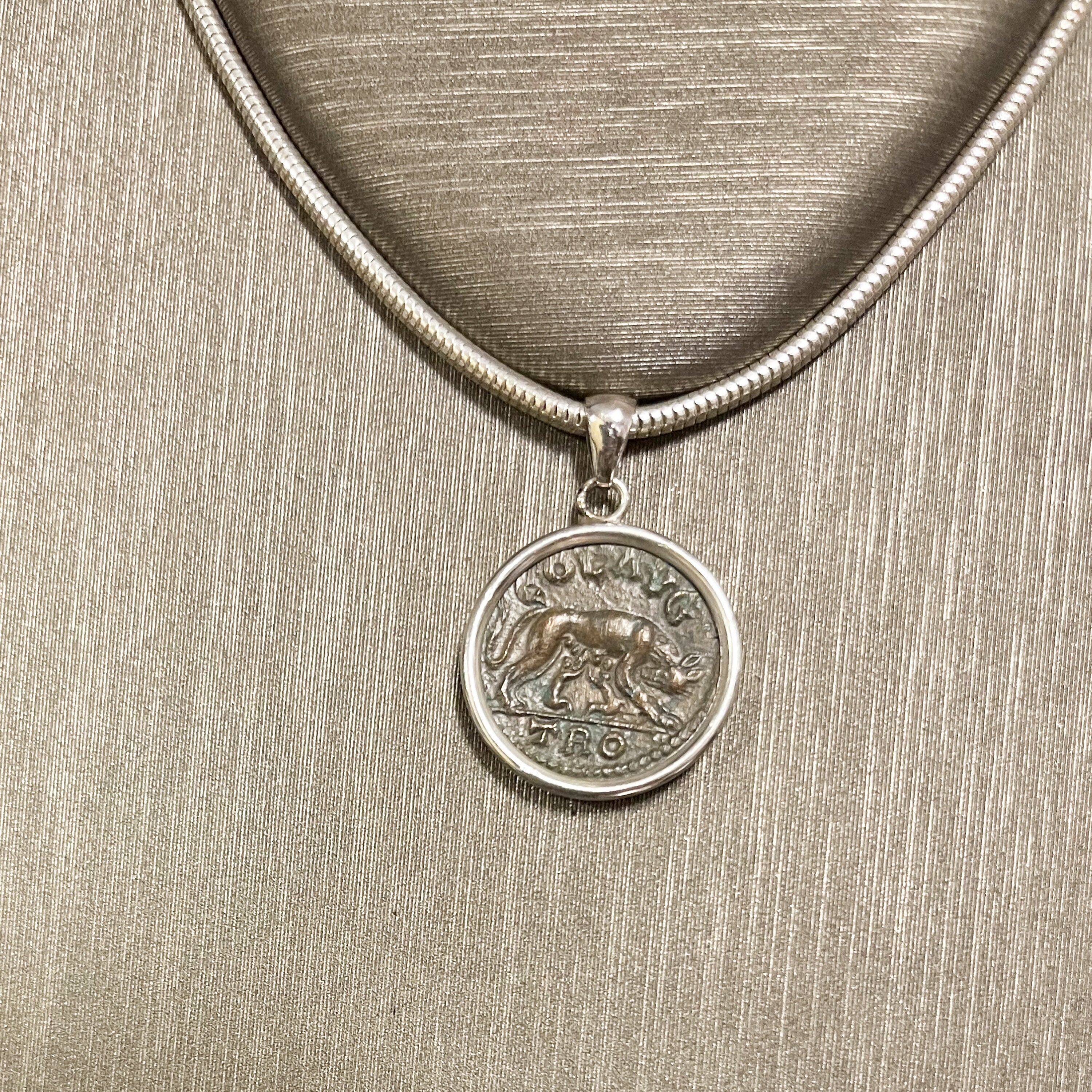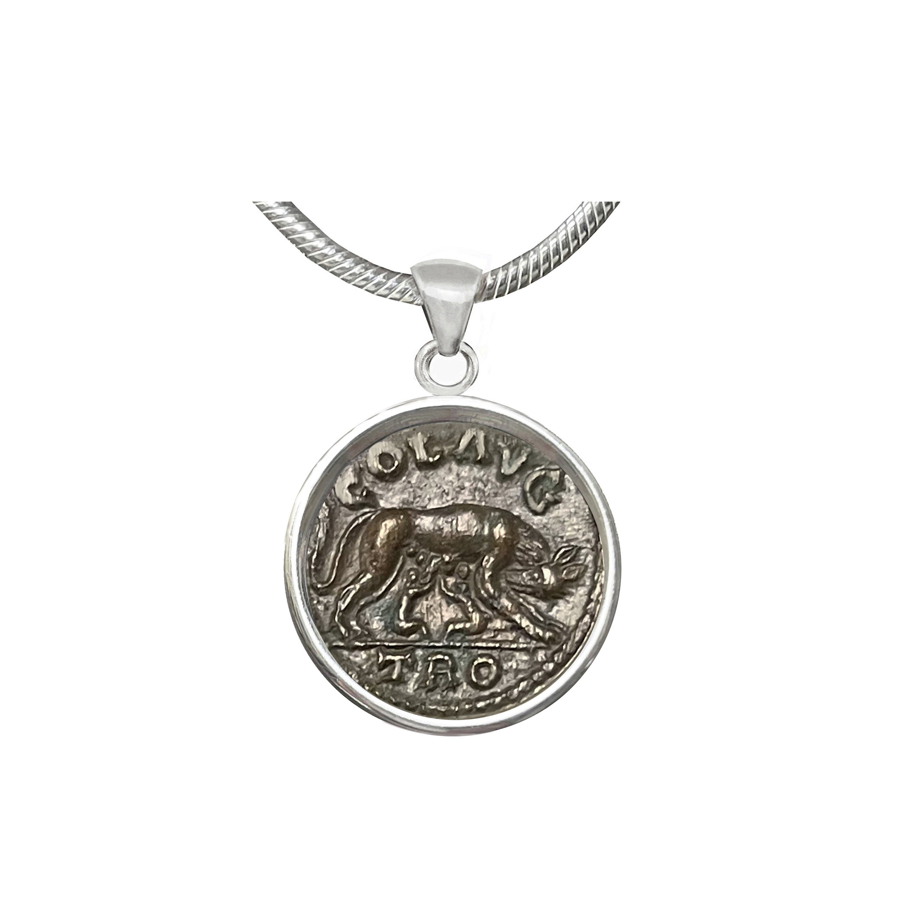 This sterling silver pendant proudly showcases an authentic Roman bronze coin featuring the iconic imagery of the Capitoline Wolf nurturing the twins Romulus and Remus. On the reverse side, a depiction of Tyche (Fortuna) facing right graces the coin.