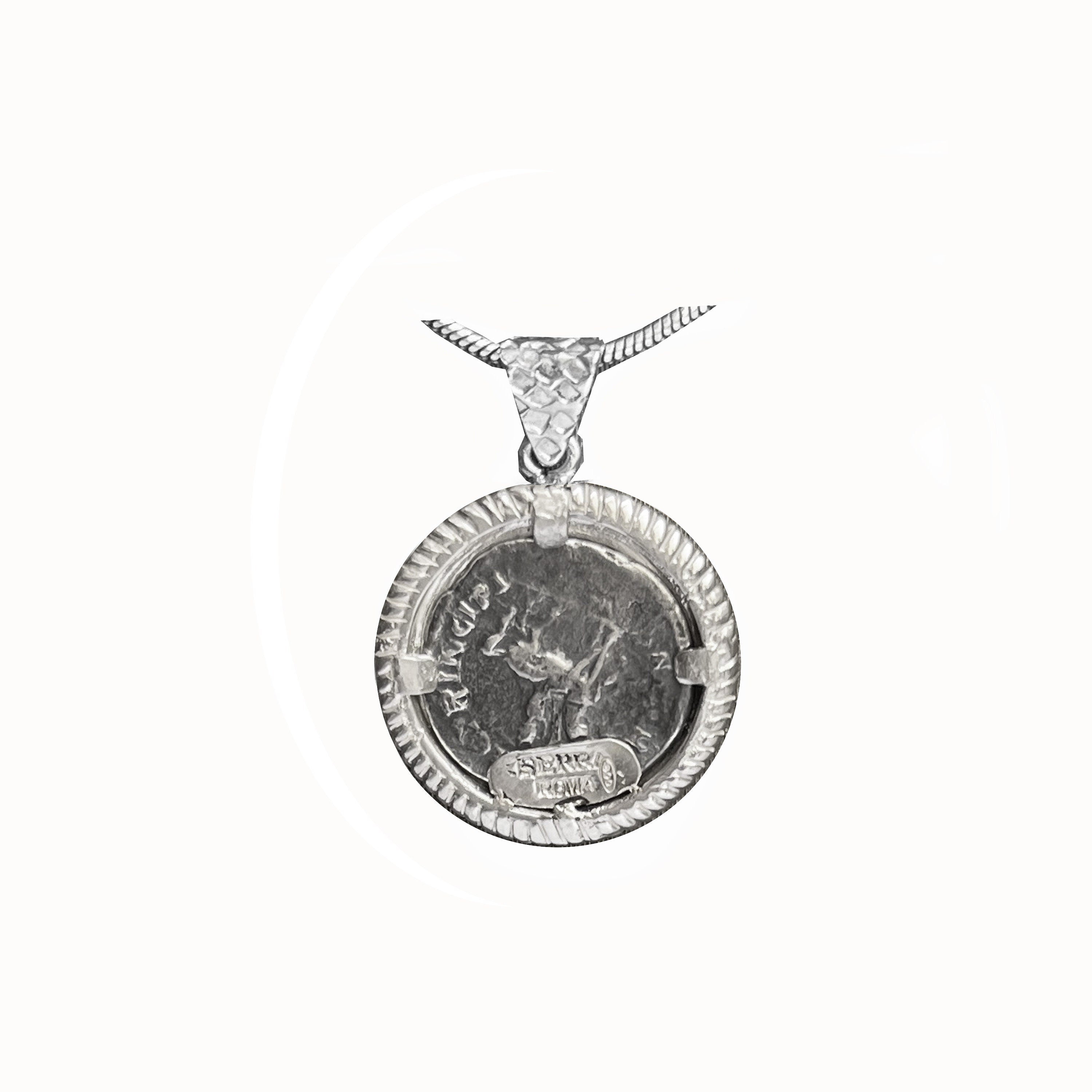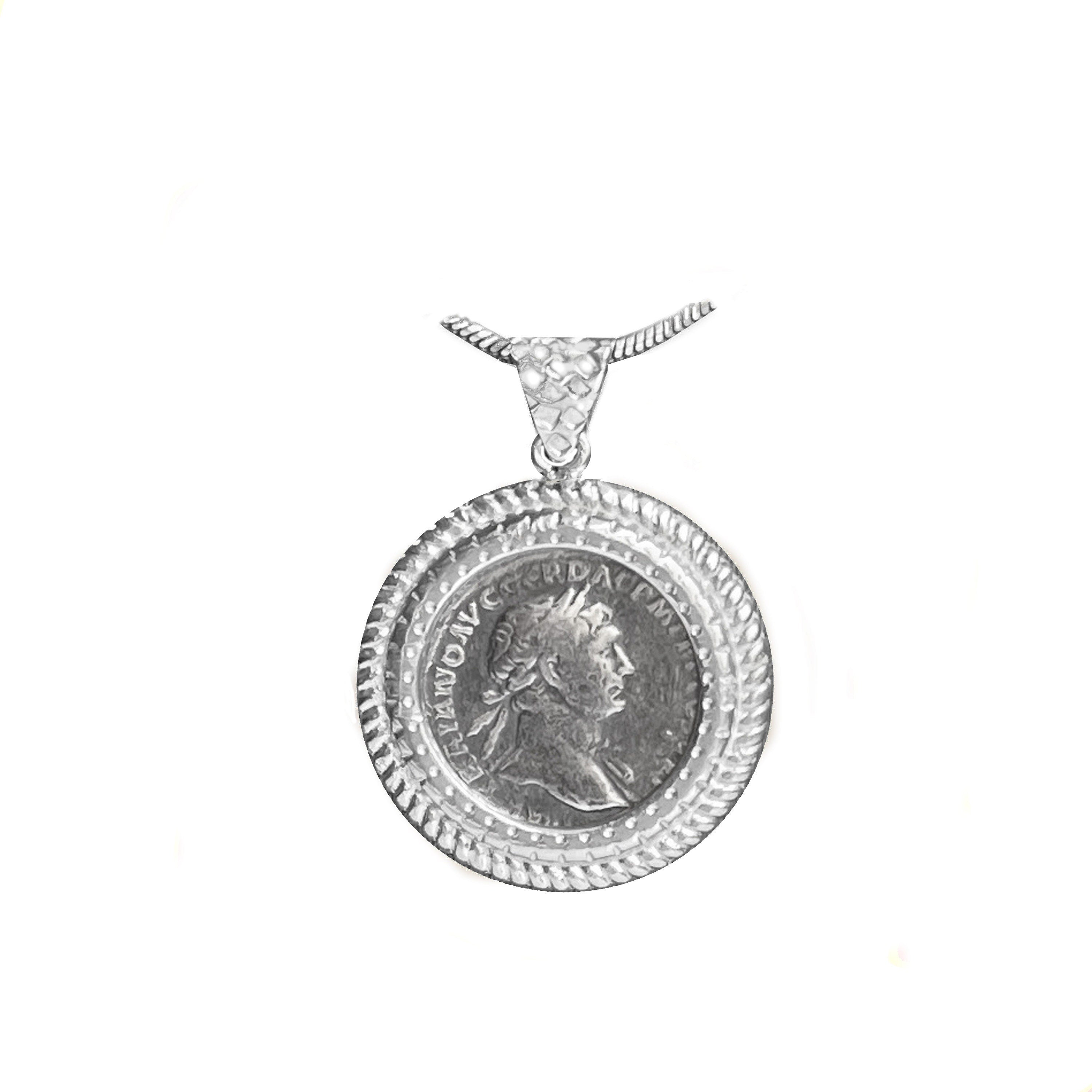 In this silver pendant, made with the lost wax technique, an authentic Roman denarius from the 2nd century AD has been set. , which depicts Emperor Trajan. On the reverse of the coin there is an equestrian statue with Trajan on horseback, with a long spear and a small Victory.