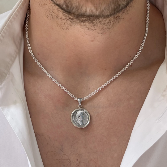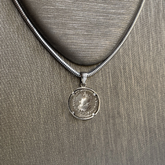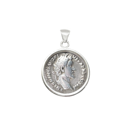 This sterling silver pendant features an authentic Roman silver denarius bearing the likeness of Emperor Antoninus Pius. What sets this coin apart is its unique reverse side, which displays the bust of another emperor, Marcus Aurelius.