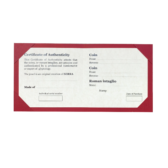 Our jewelry store, Serra Roma, proudly presents an exquisite collection that beautifully honors the ancient traditions of Greek and Roman civilizations. Each piece in our collection, including authentic ancient Roman and Greek coins and intaglios, is accompanied by a certificate of authenticity, providing proof of its historical significance and origin.