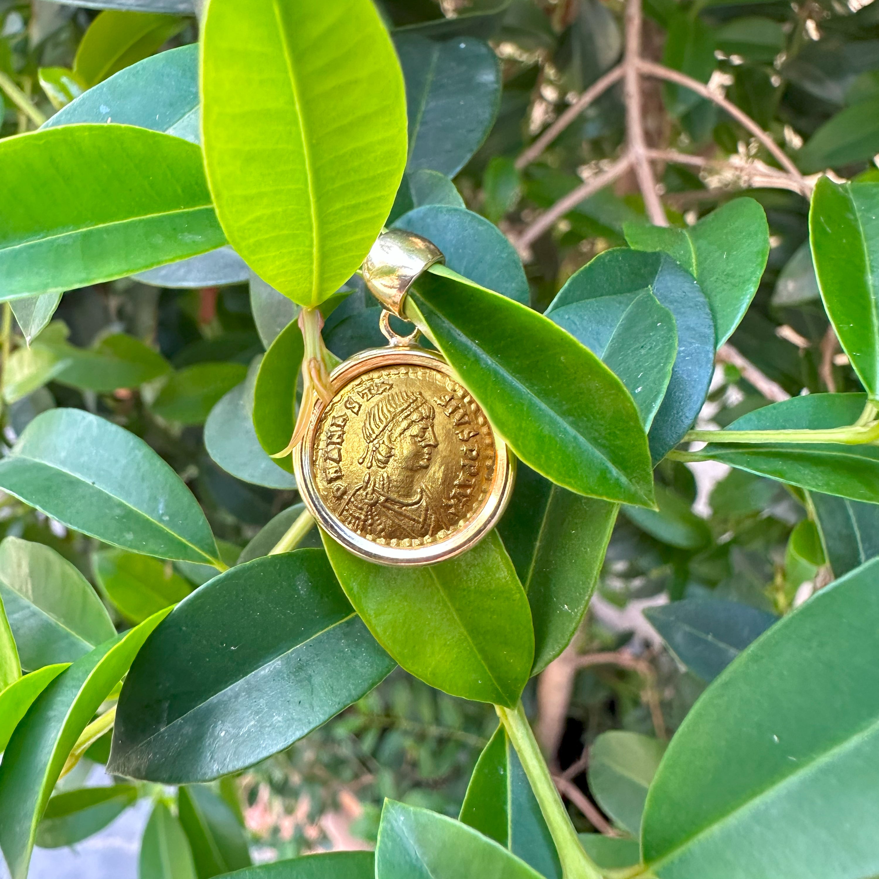 This exquisite 18Kt Gold pendant houses a Byzantine Tremissis from the 5th century AD, featuring the Emperor Anastasius I. On the front, we see his helmeted and cuirassed bust facing forward, holding a spear and shield, symbolizing his military strength and leadership.