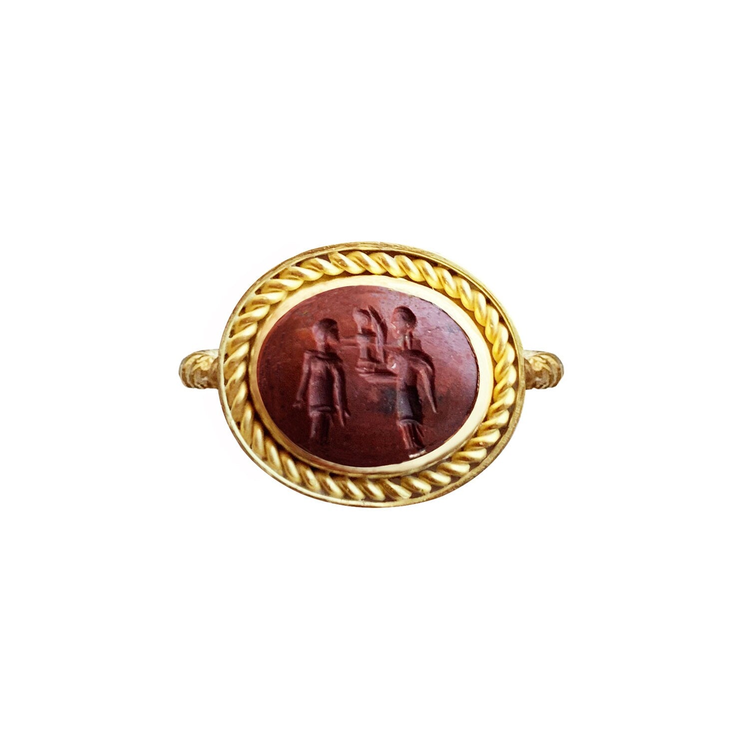 Authentic Roman Jasper Intaglio 20Kt Gold Ring depicting Athena giving a winged Nike to the Emperor