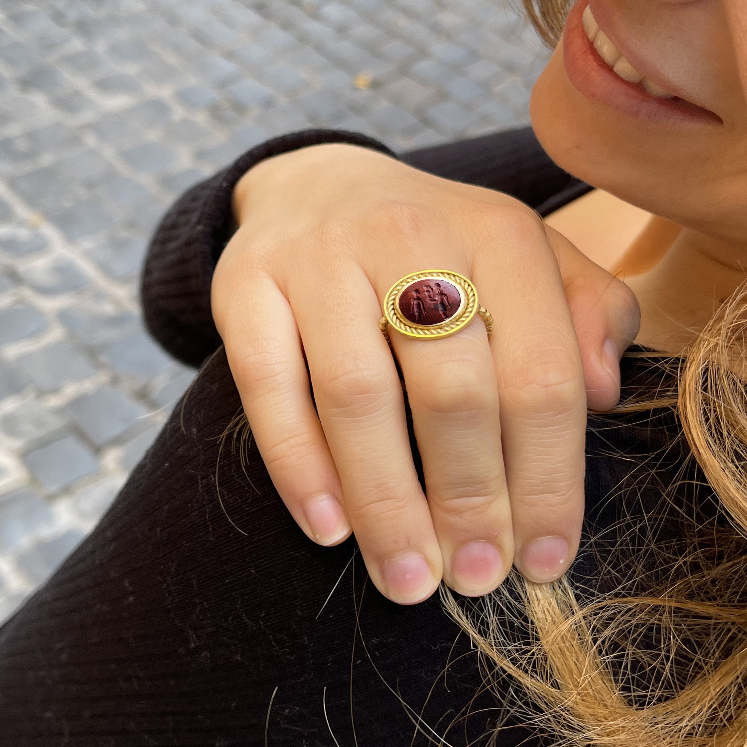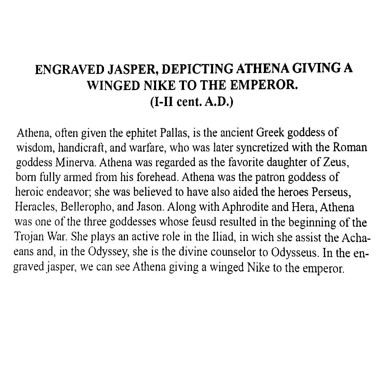 This 20kt gold ring features an authentic Roman intaglio crafted on jasper, portraying Goddess Athena presenting a winged Nike to the Emperor. Athena, also known as Pallas, an ancient Greek deity associated with wisdom, craftsmanship, and warfare, became intertwined with the Roman goddess Minerva. Revered as the patroness of various Greek cities, particularly Athens, her likely namesake, Athena is typically depicted wearing a helmet and wielding a spear. Owls, olive trees, snakes, and the Gorgoneion stand as her prominent symbols.