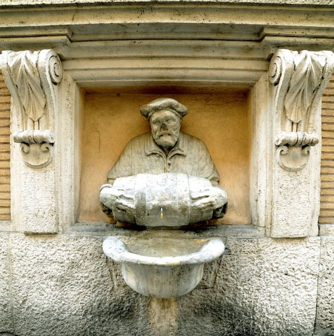 Unlike the other talking statues, which are all dated to Ancient Rome, Il Facchino is relatively modern. The statue was created in around 1580, to a design by Jacopo del Conte for the Corporazione degli Aquaroli ( but Vanvitelli, in 1751, even attributes it to Michelangelo).It depicts a man wearing a cap and a sleeved shirt, carrying a barrel - an "acquarolo", who would take water from the Tiber to sell on the streets of Rome during the period before the Roman aqueducts were repaired at the orders of the Popes and the public fountains played again. Somewhat incongruously, water spouts from the centre of the barrel, creating a fountain. The man's face is badly damaged, the result of paving stones thrown at it over the years, in the popular misapprehension because of the soft cap, that it portrayed Martin Luther.[