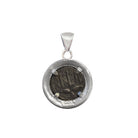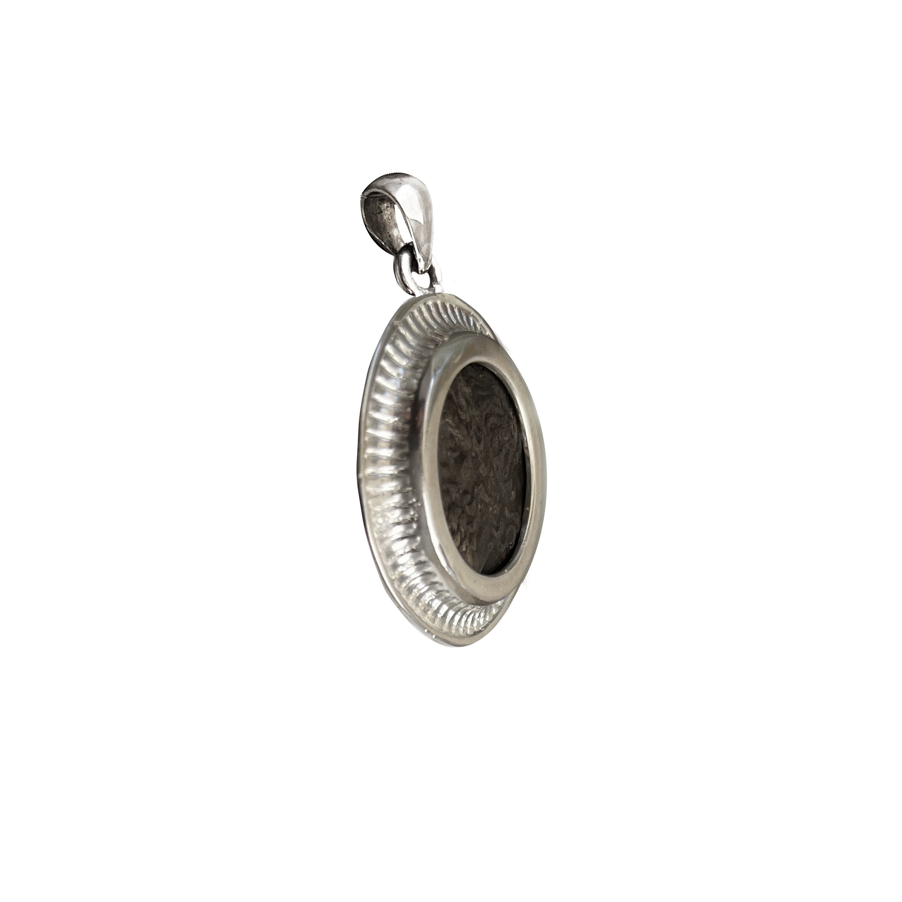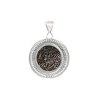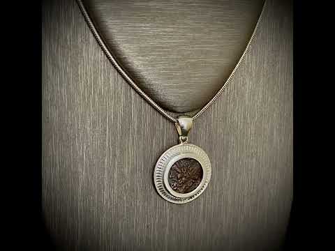 Encased within this 925 silver pendant lies an authentic bronze coin dating back to the 3rd century BC, featuring Poseidon, revered by the Romans as Neptune, the formidable deity of the sea. Adorning the reverse side of the coin is a trident embellished with festoons, flanked by two dolphins.
