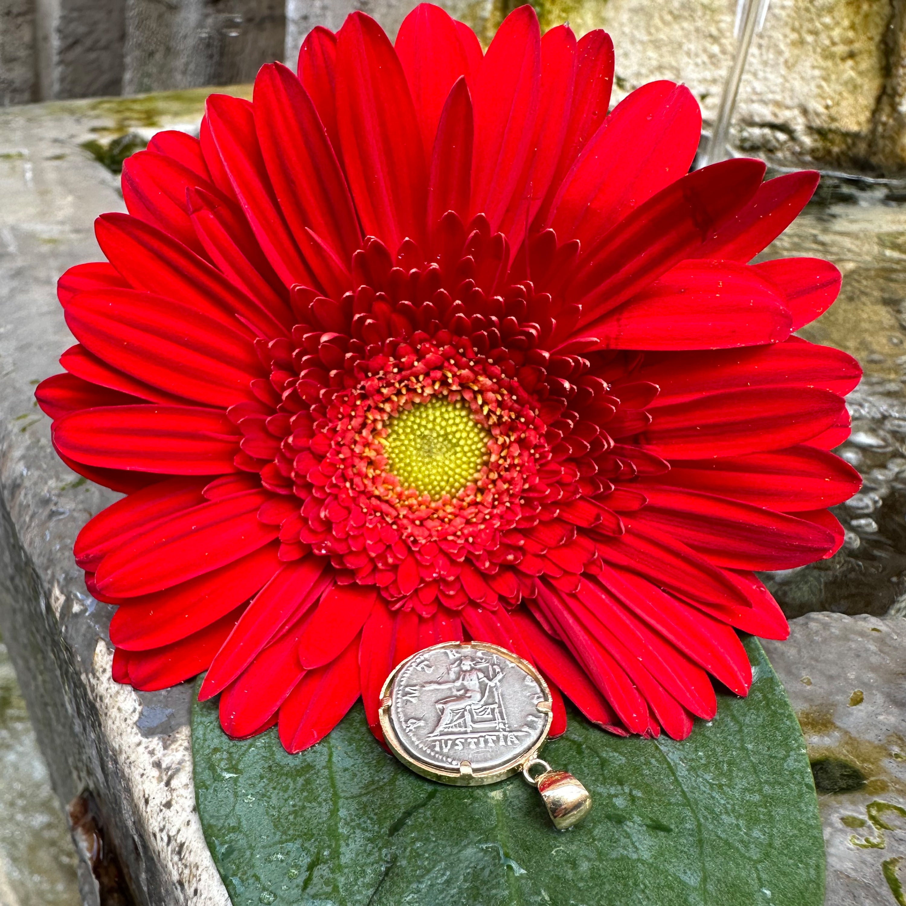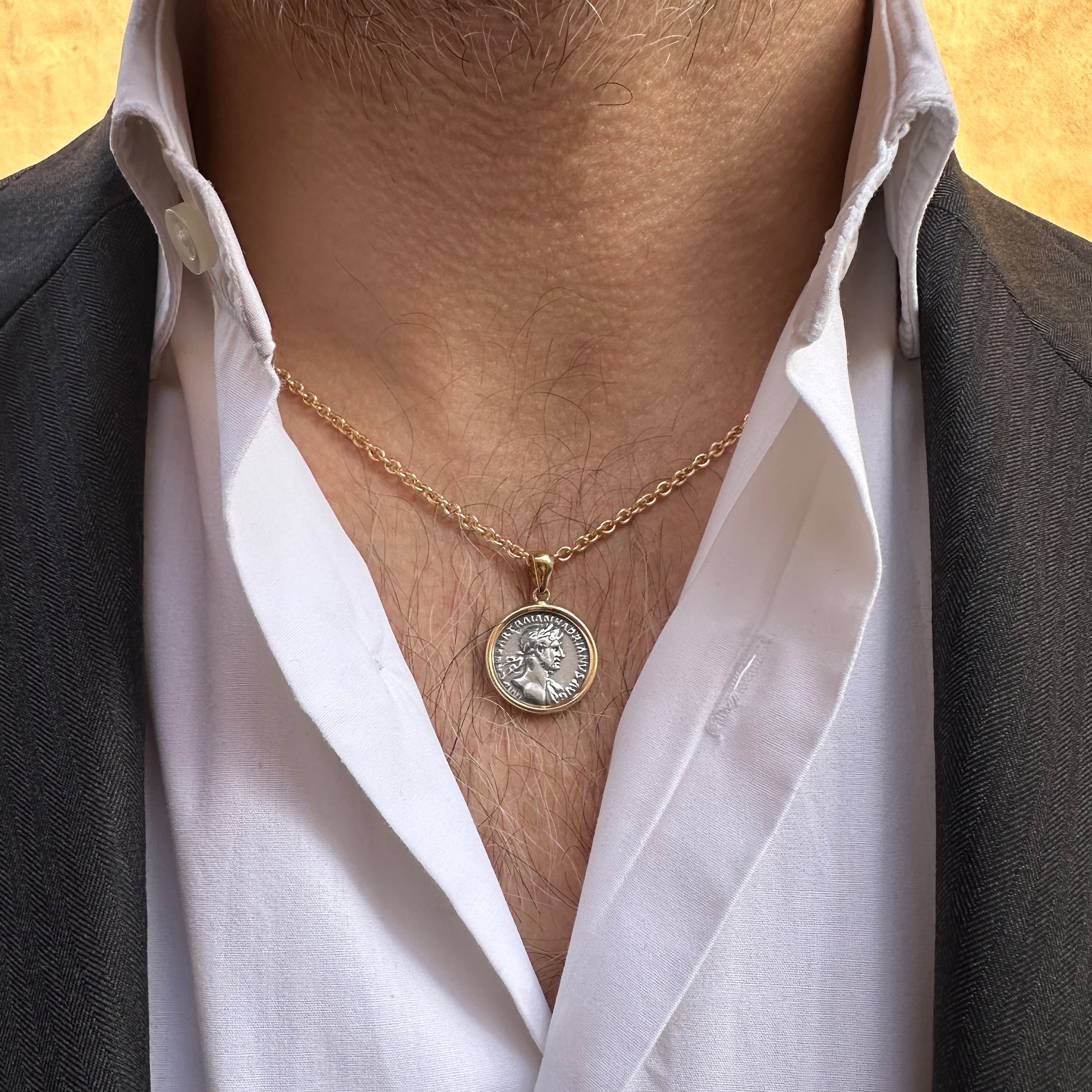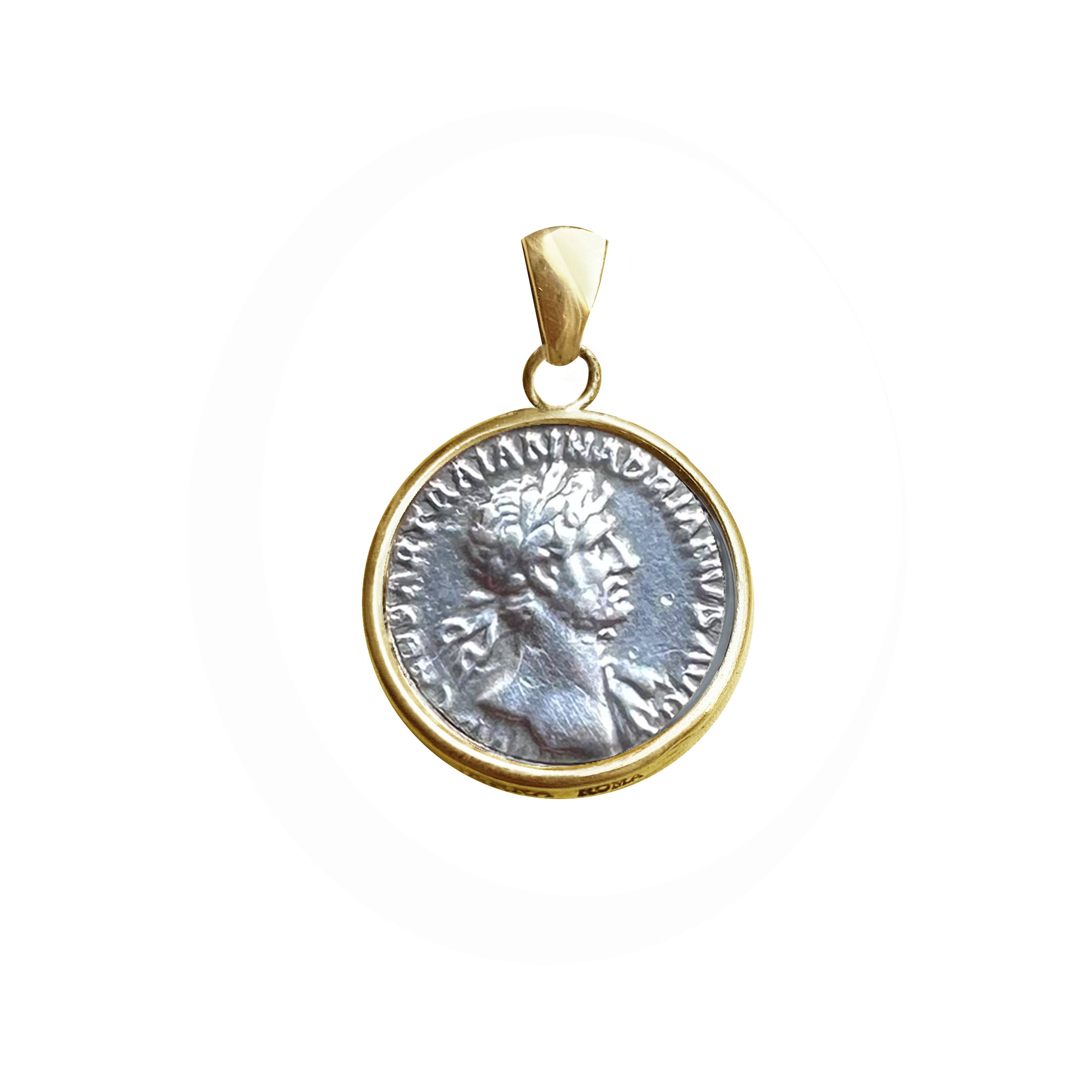 This 18 Kt gold pendant has been set with an authentic Roman coin from the 2nd century AD depicting Emperor Hadrian. On the other side of the coin we can see the seated Goddess Iustitia (Justice).
