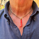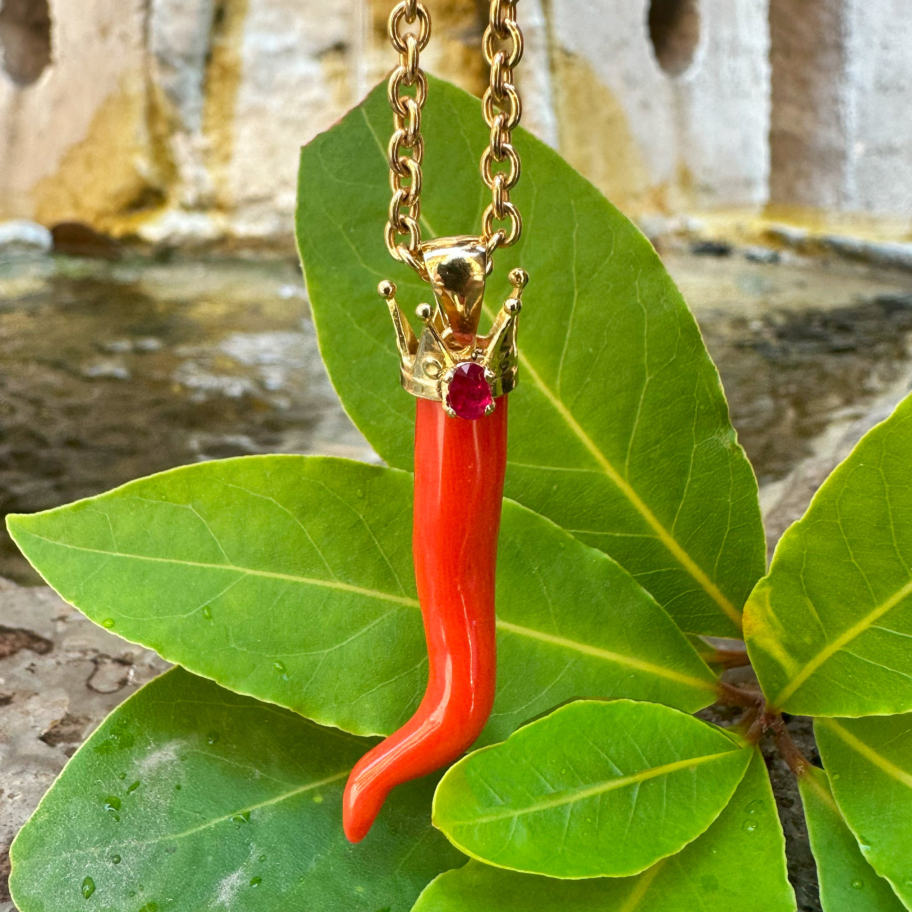 This exquisite coral and 18Kt gold horn originates from the Italian sea and was purchased in Torre del Greco—a town renowned for its centuries-old tradition of coral craftsmanship. It has been elegantly finished with an 18Kt gold crown and a ruby, carefully set by our master goldsmiths.