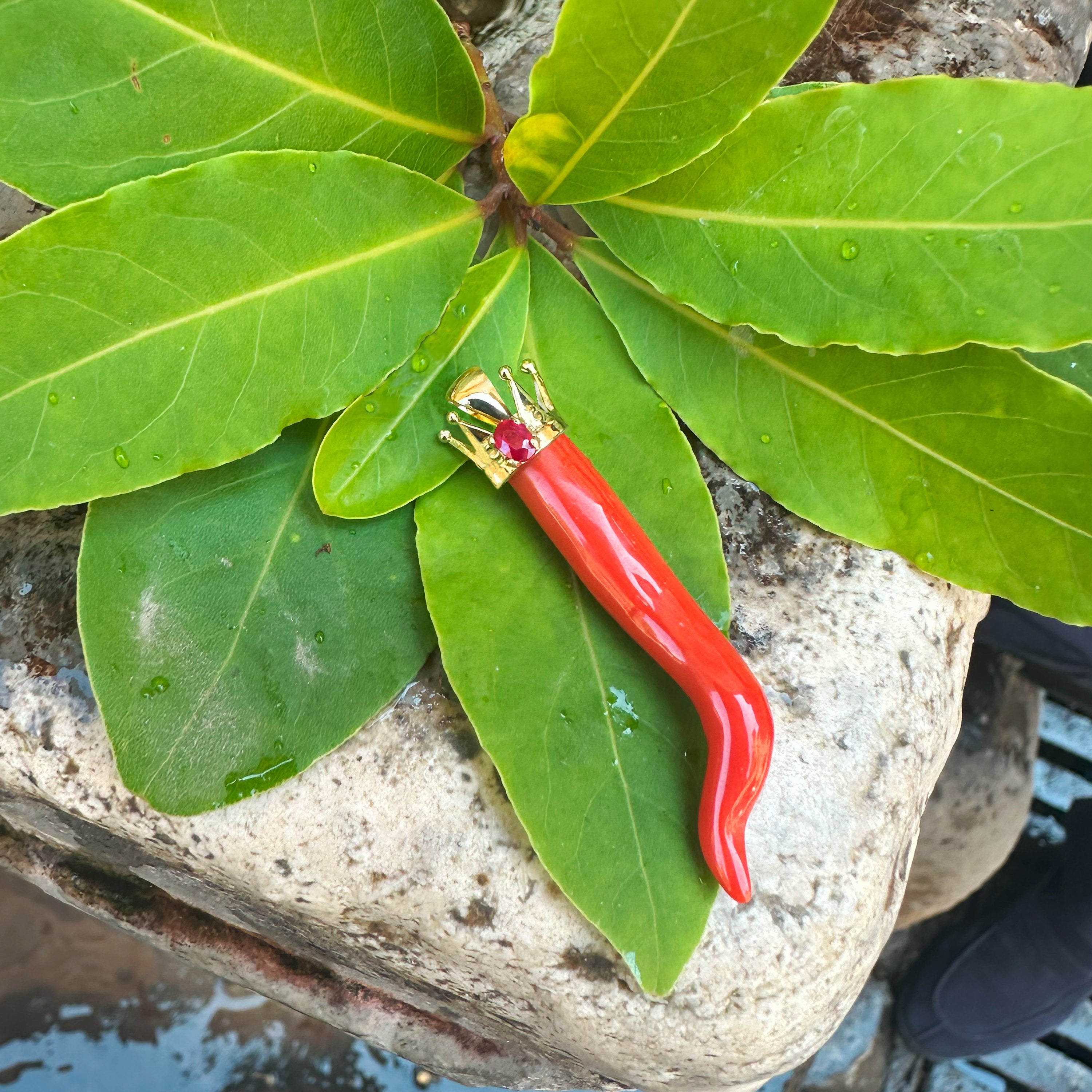 Lucky horn in italian coral, with 18 Kt gold crown and a Ruby