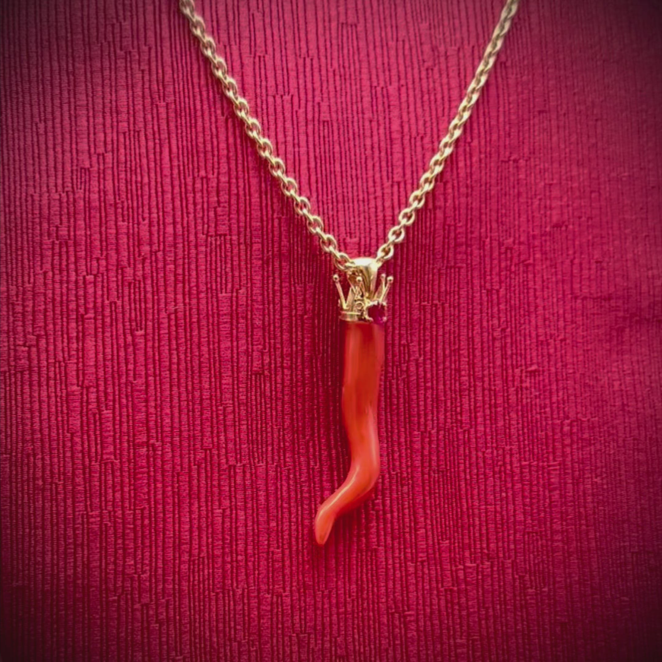 • Handmade 100% Made in Italy • Authentic Italian Red Coral • Crown material: 18 Kt Gold • Ruby • Horn length : 6 cm
