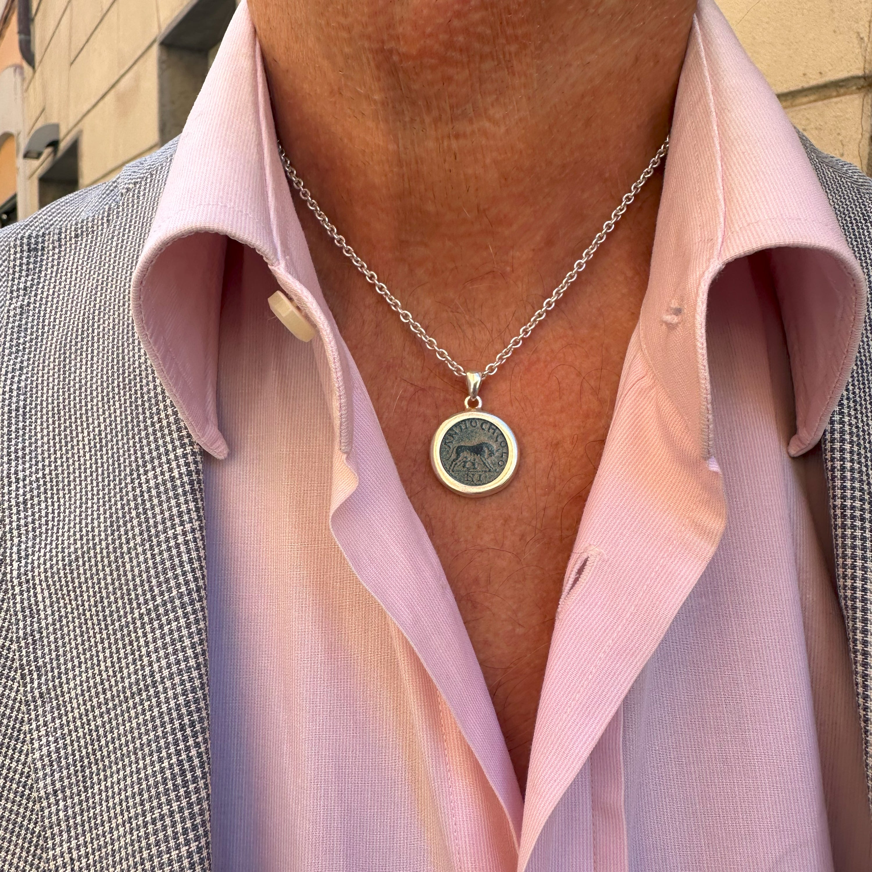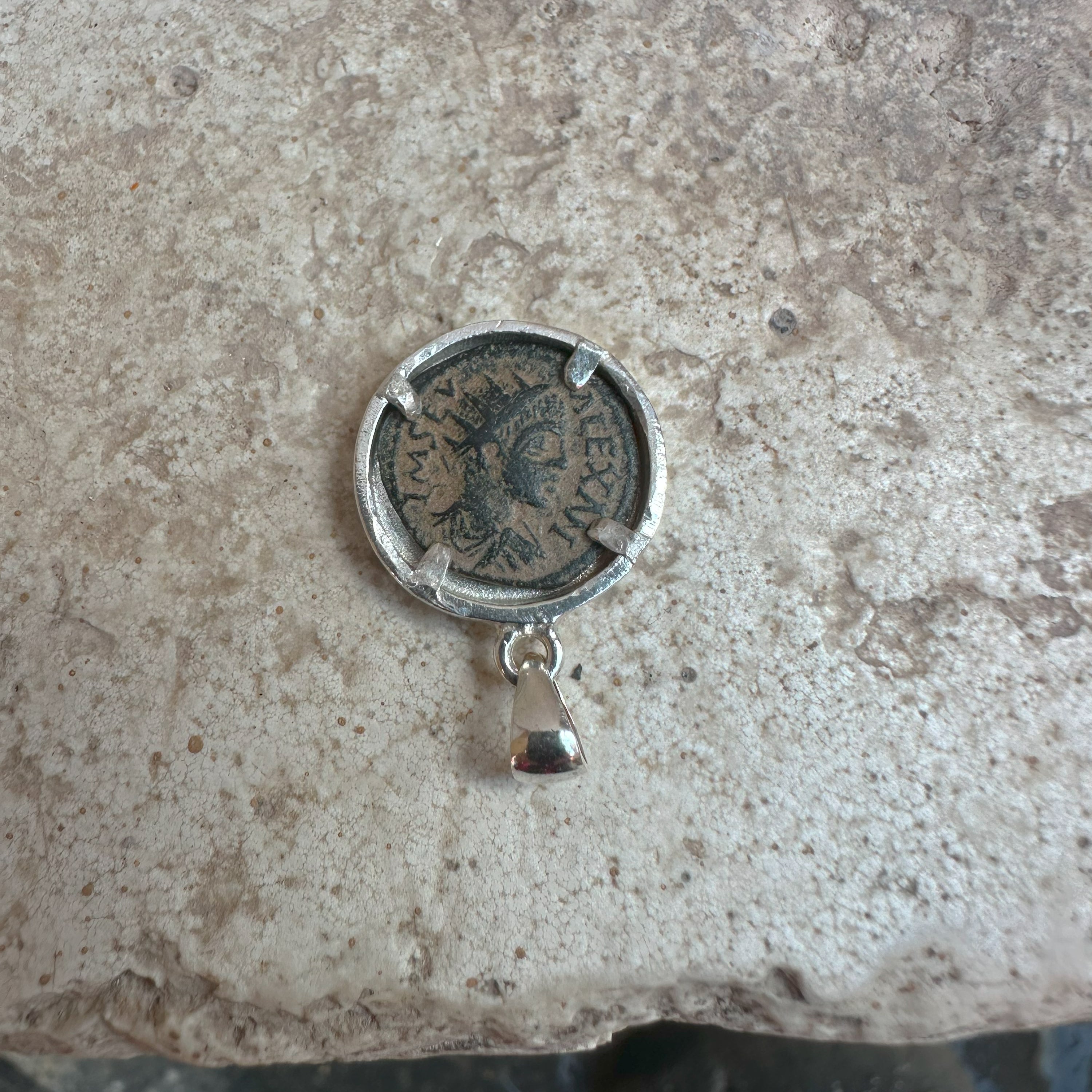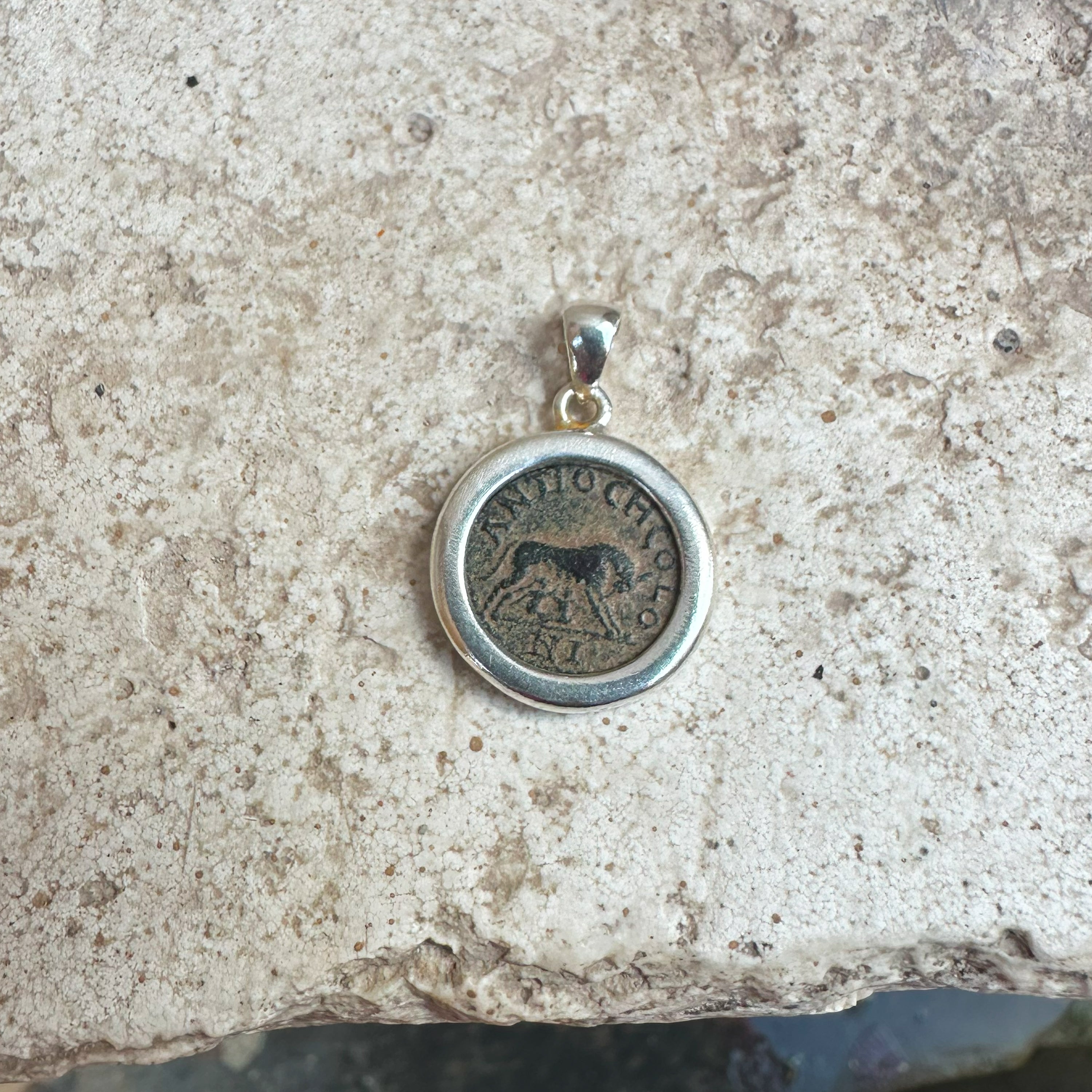 Within this sterling silver pendant rests an authentic Roman coin dating back to the 2nd century AD, depicting the iconic imagery of the She-wolf nurturing the twins Romulus and Remus. On the reverse side of the coin, the bust of Emperor Alexander Severus is featured.