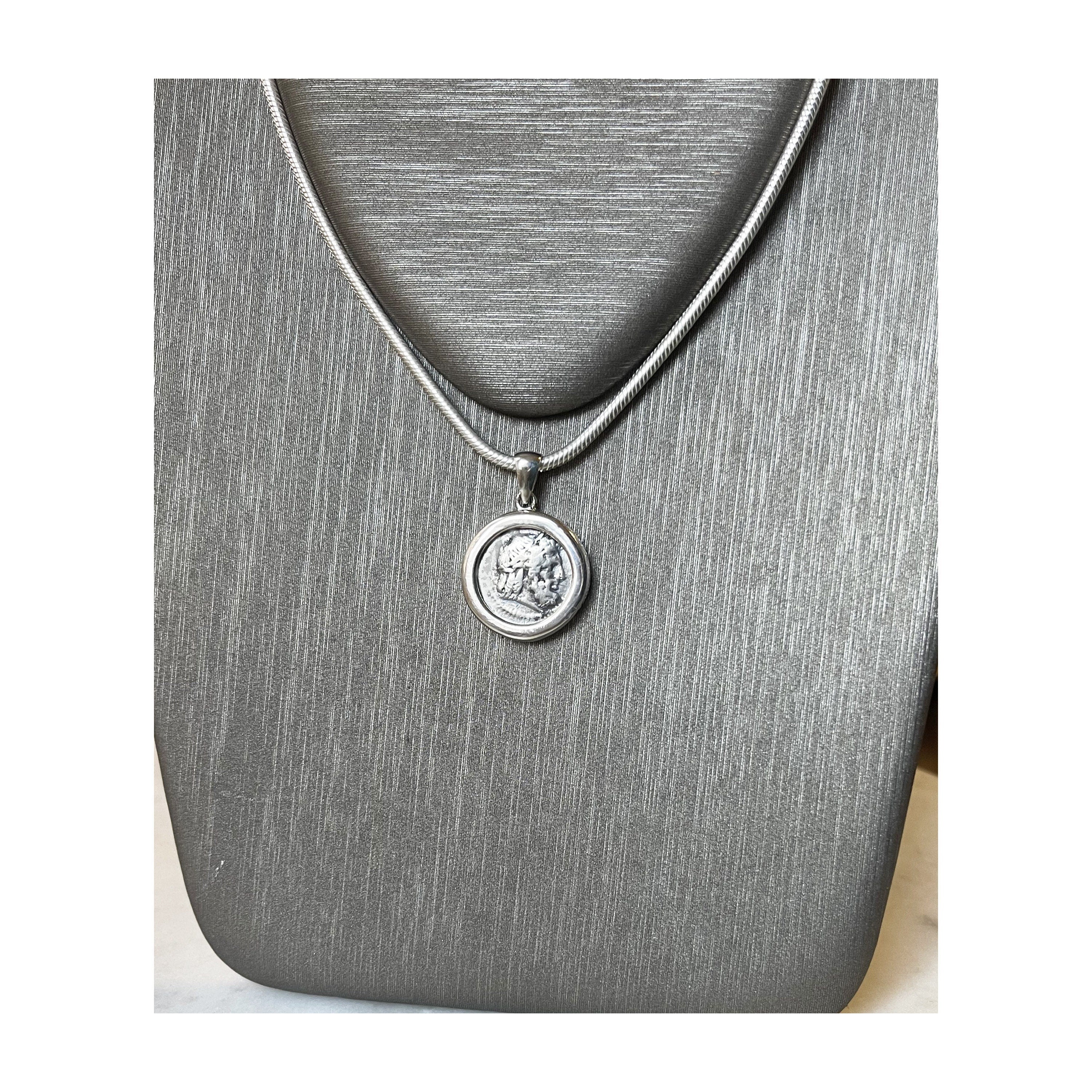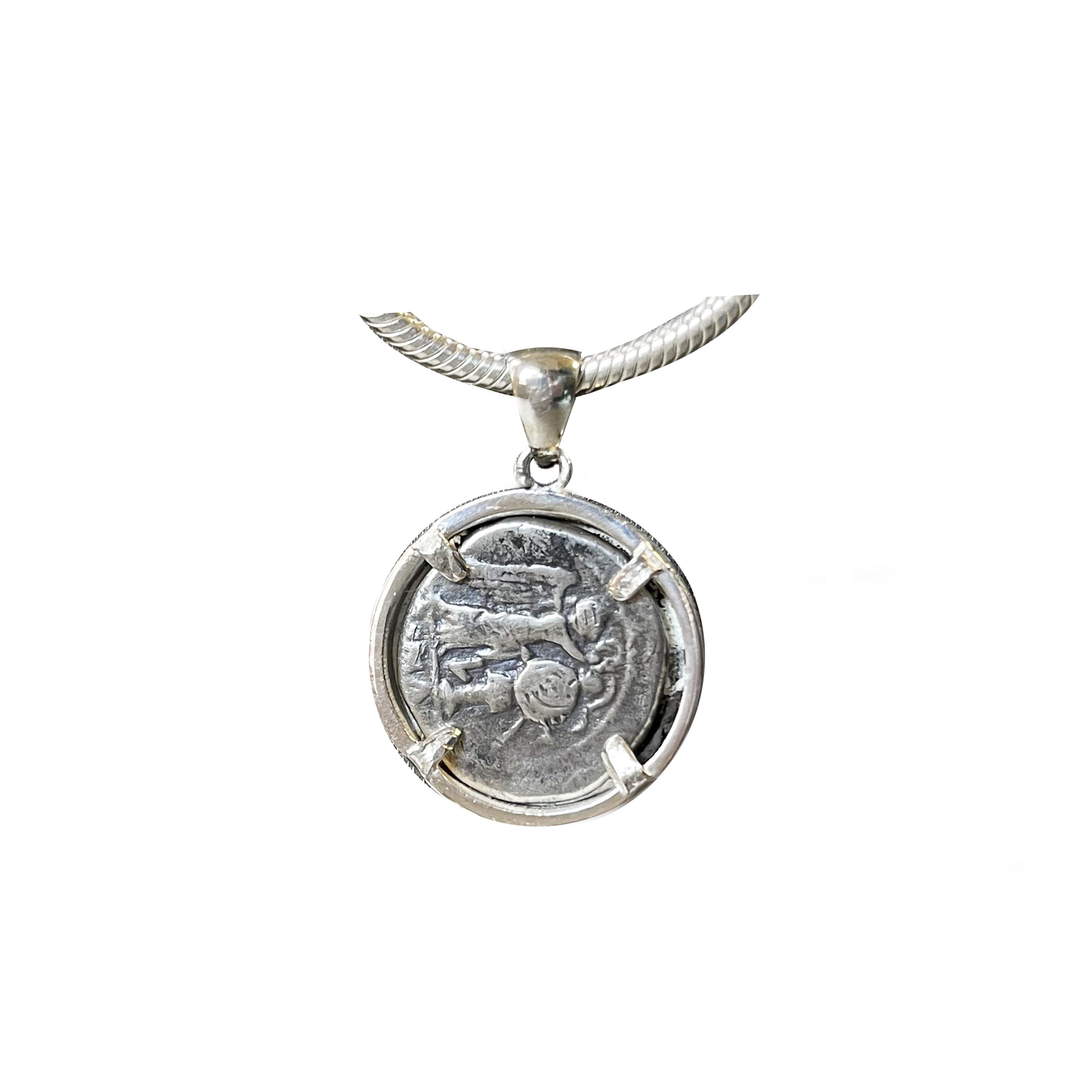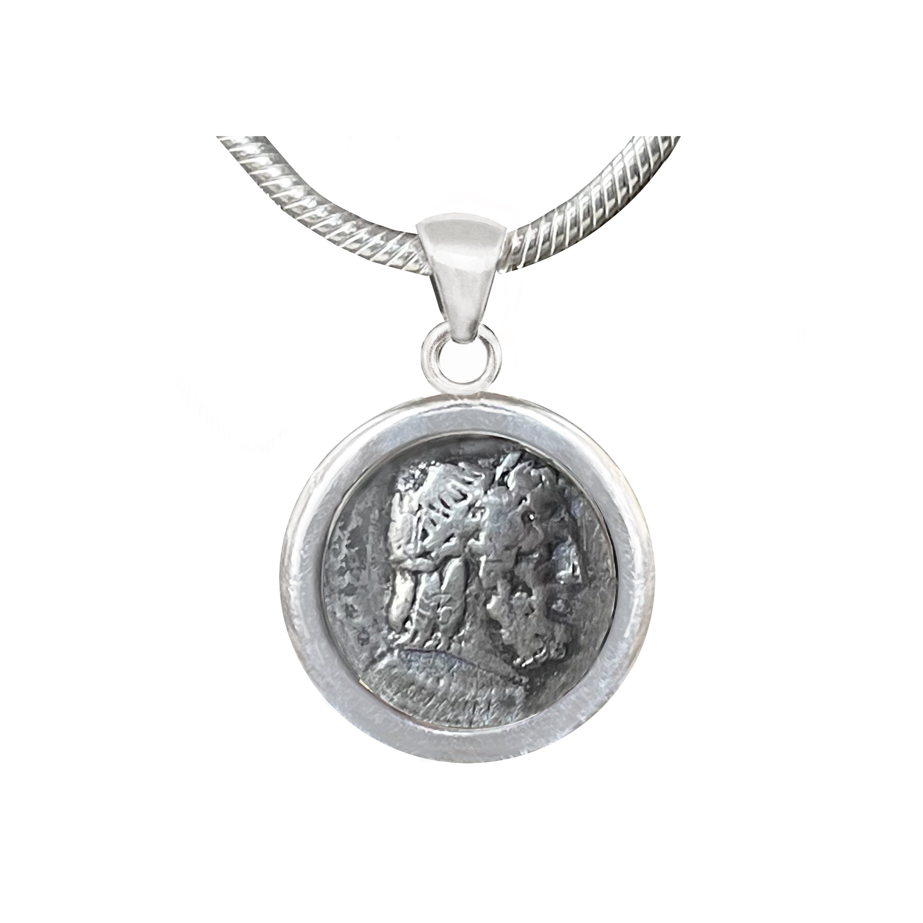 This silver pendant features an authentic Roman silver coin called a Victoriatus, dating back to the 3rd century BC. It showcases Jupiter's head adorned with a laurel wreath on one side and a winged Victory on the other. Jupiter, originally revered as an aerial deity, was identified by his thunderbolt and his sacred creature, the eagle. This powerful symbol, often depicted as an eagle holding a thunderbolt, was commonly found on Greek and Roman coins, representing Jupiter's might and authority.
