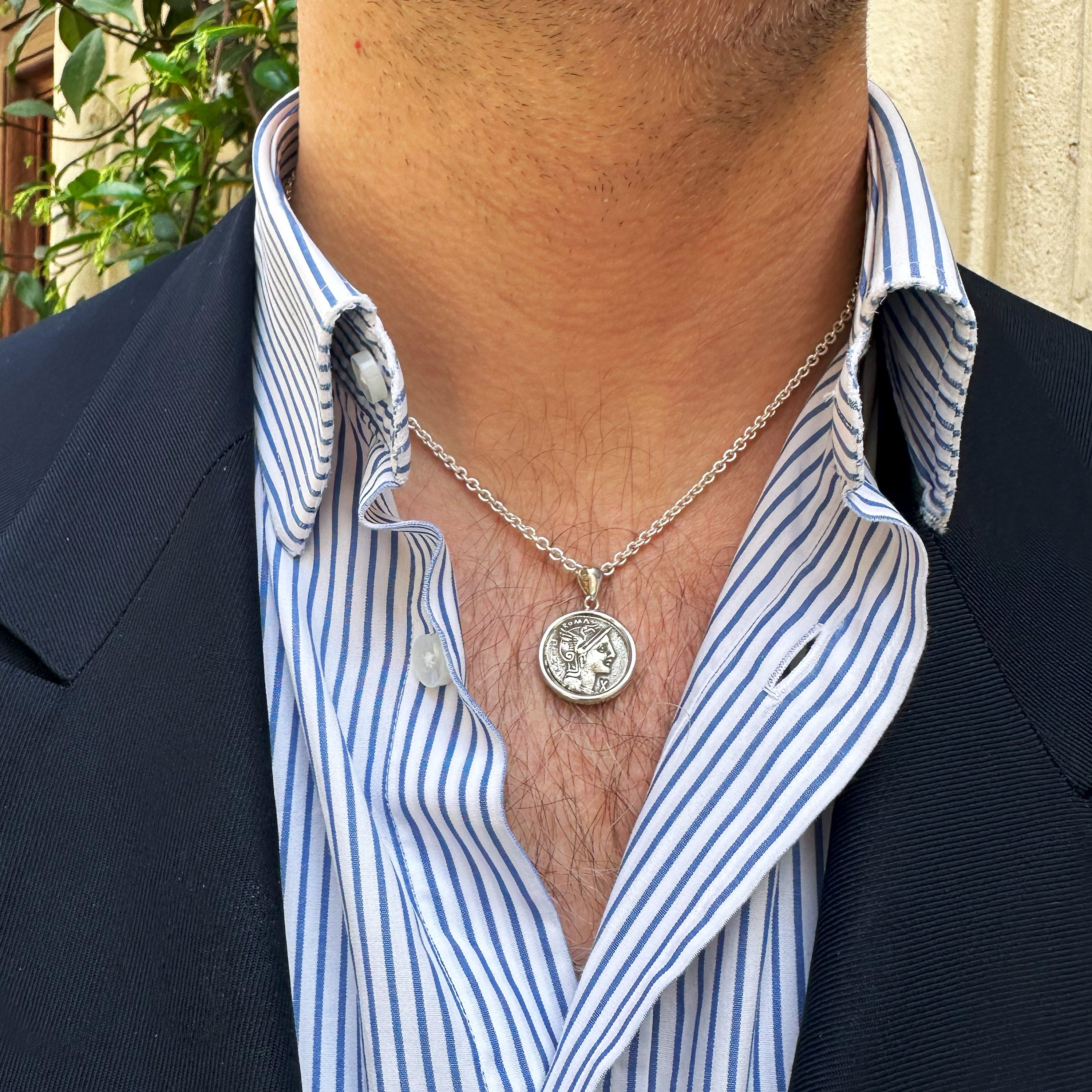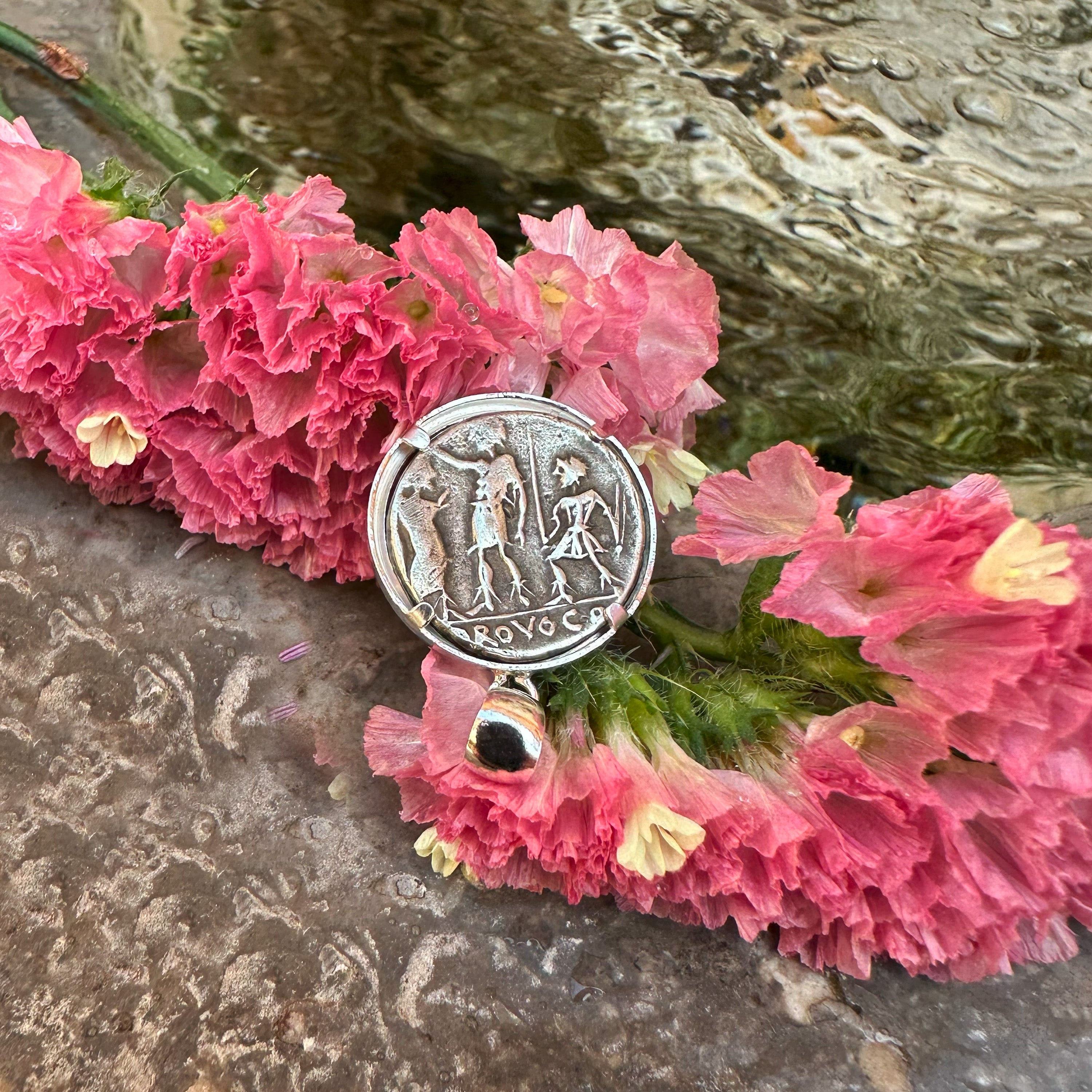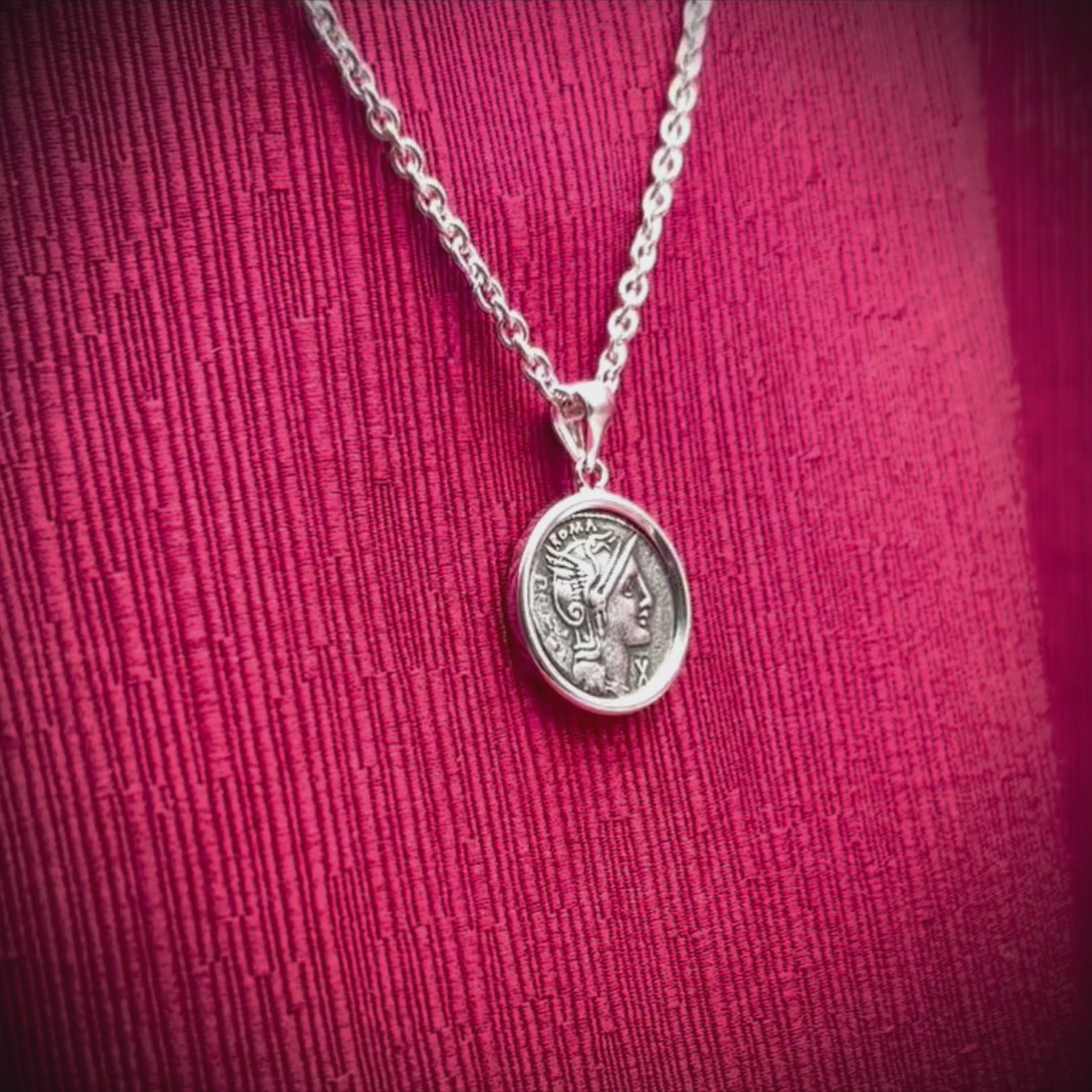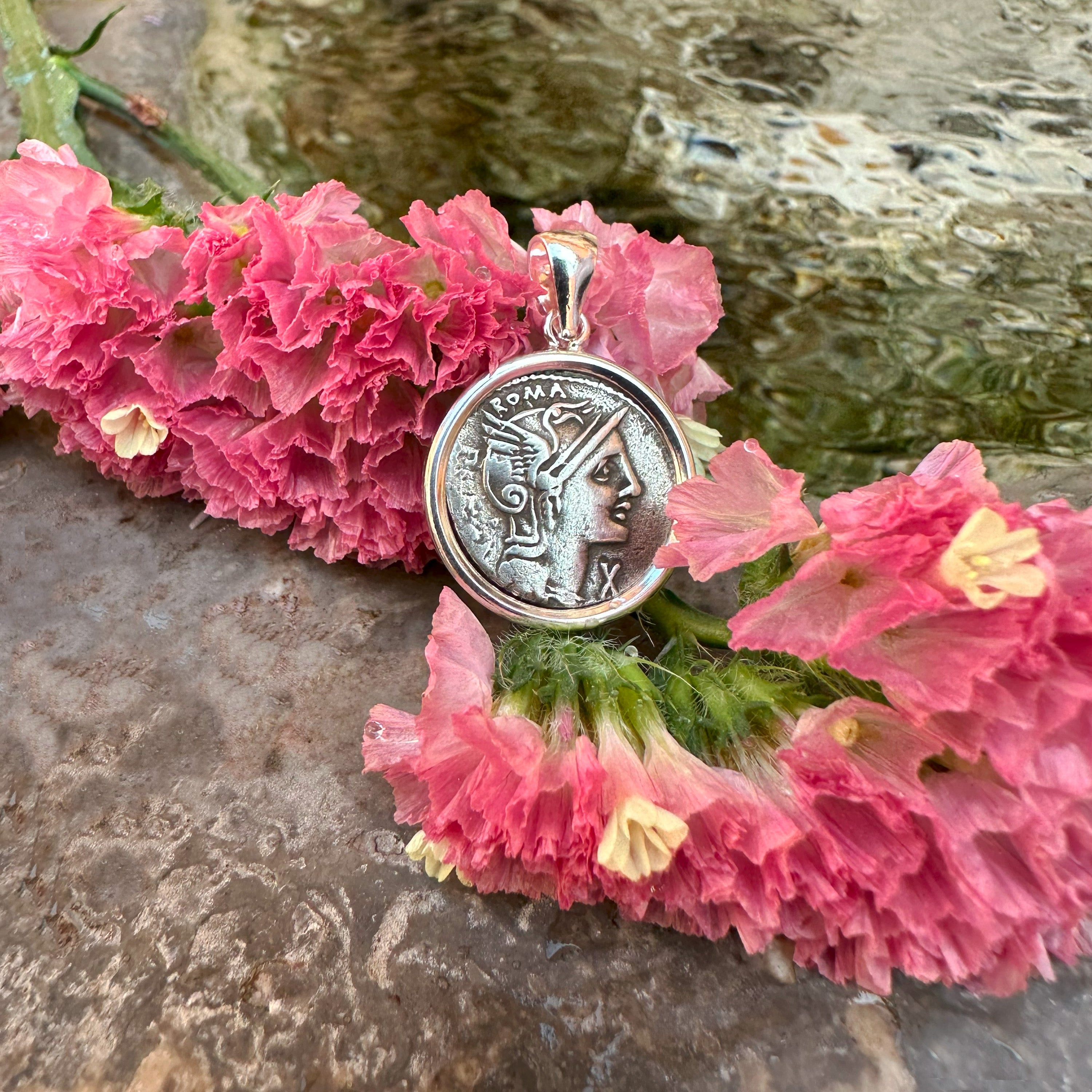 This sterling silver pendant showcases an authentic Roman coin dating back to the second century BC. On one side of the coin, we can observe the Goddess Roma; on the reverse, we find three warriors.