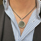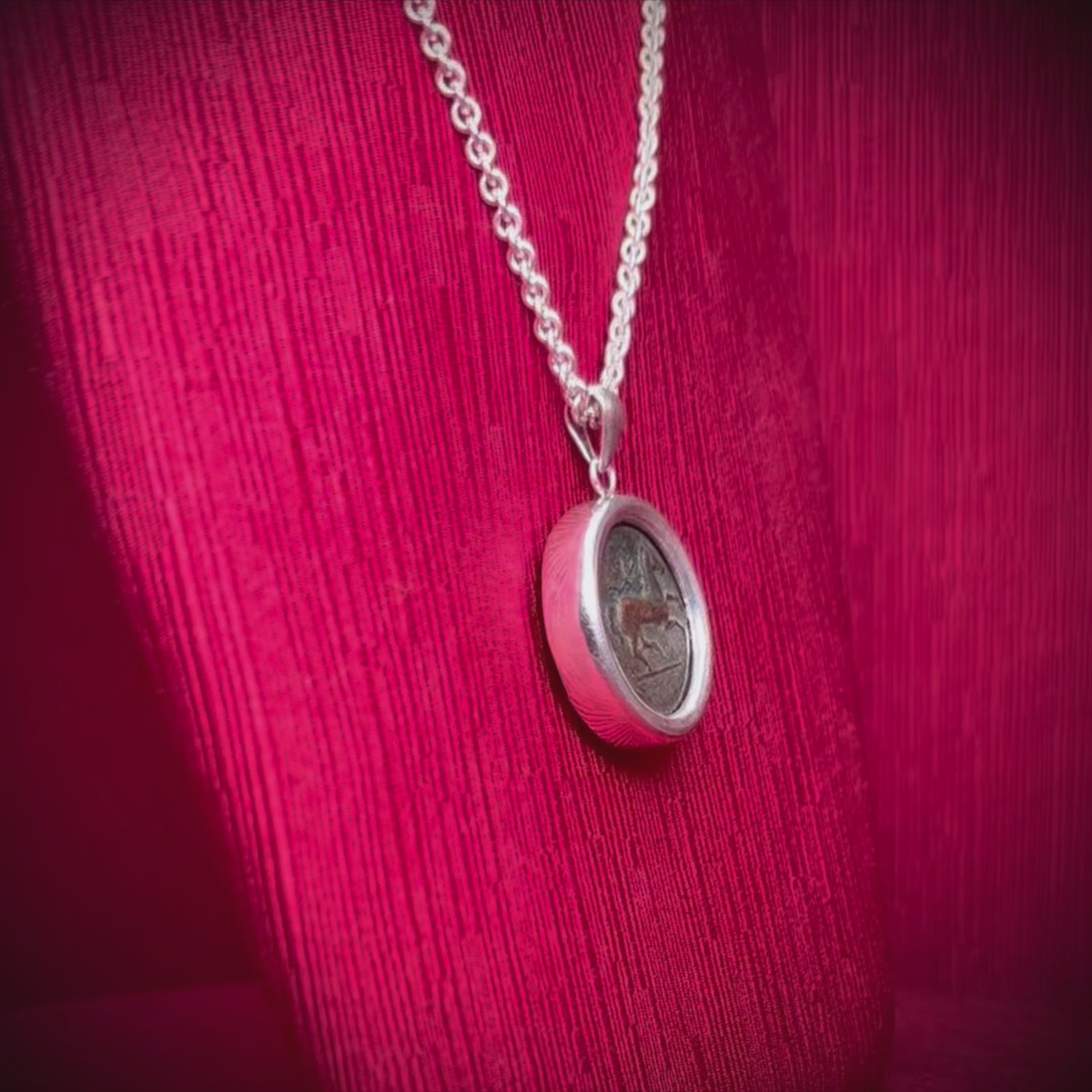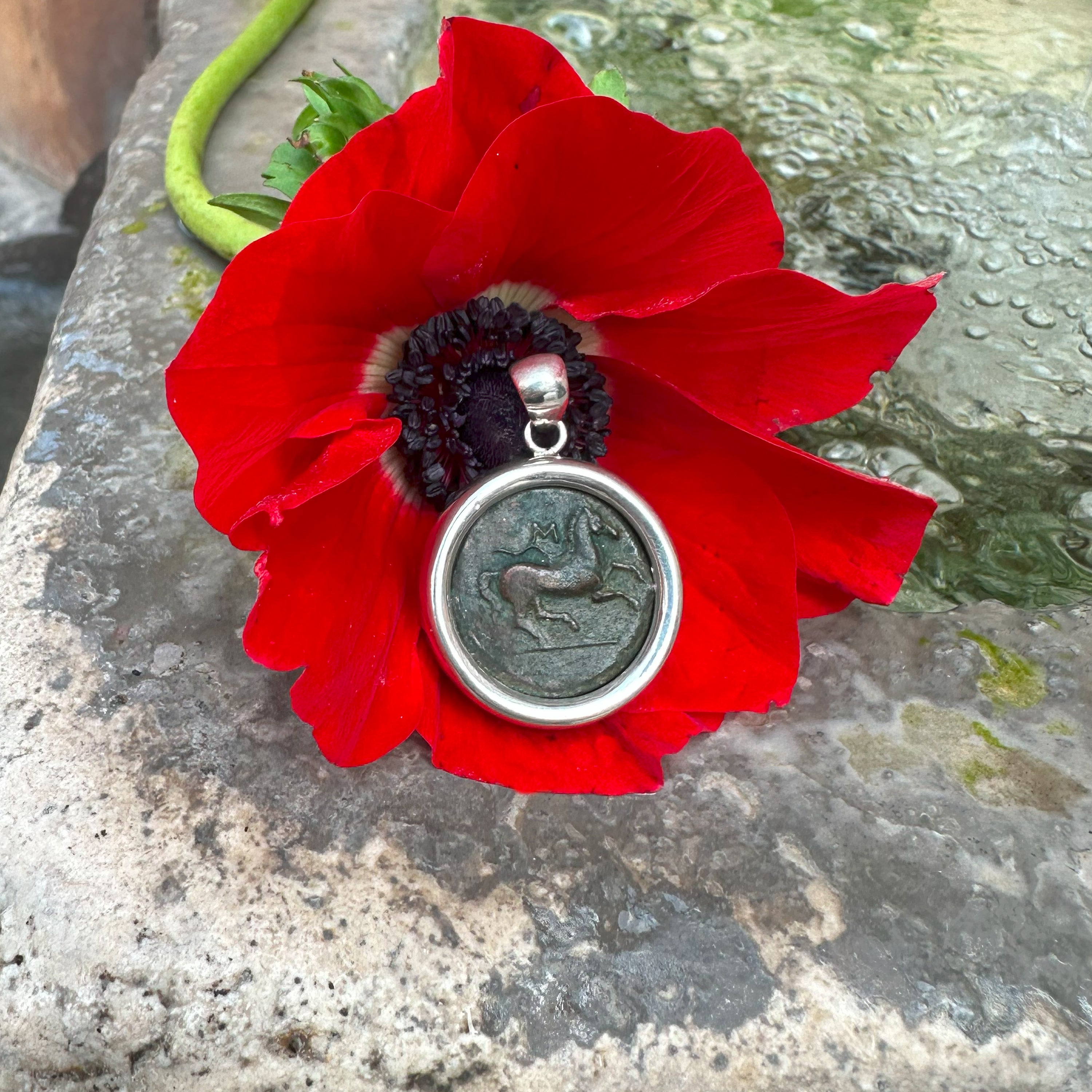 This pendant features an authentic ancient coin from Carthage, dating to the 4th century B.C., with a prancing horse on the front and the Greek goddess Athena on the reverse—a striking fusion of Phoenician and Hellenistic iconography.