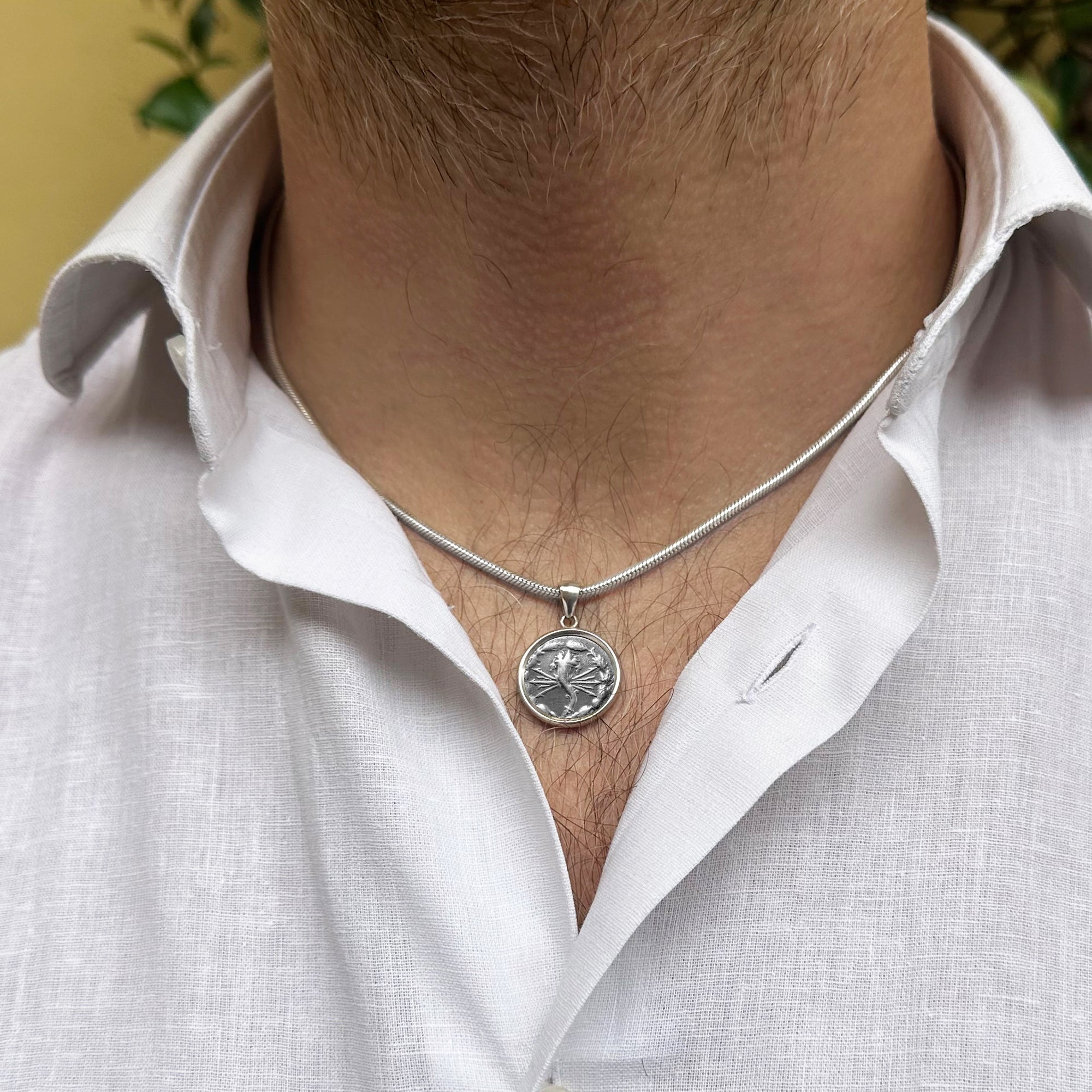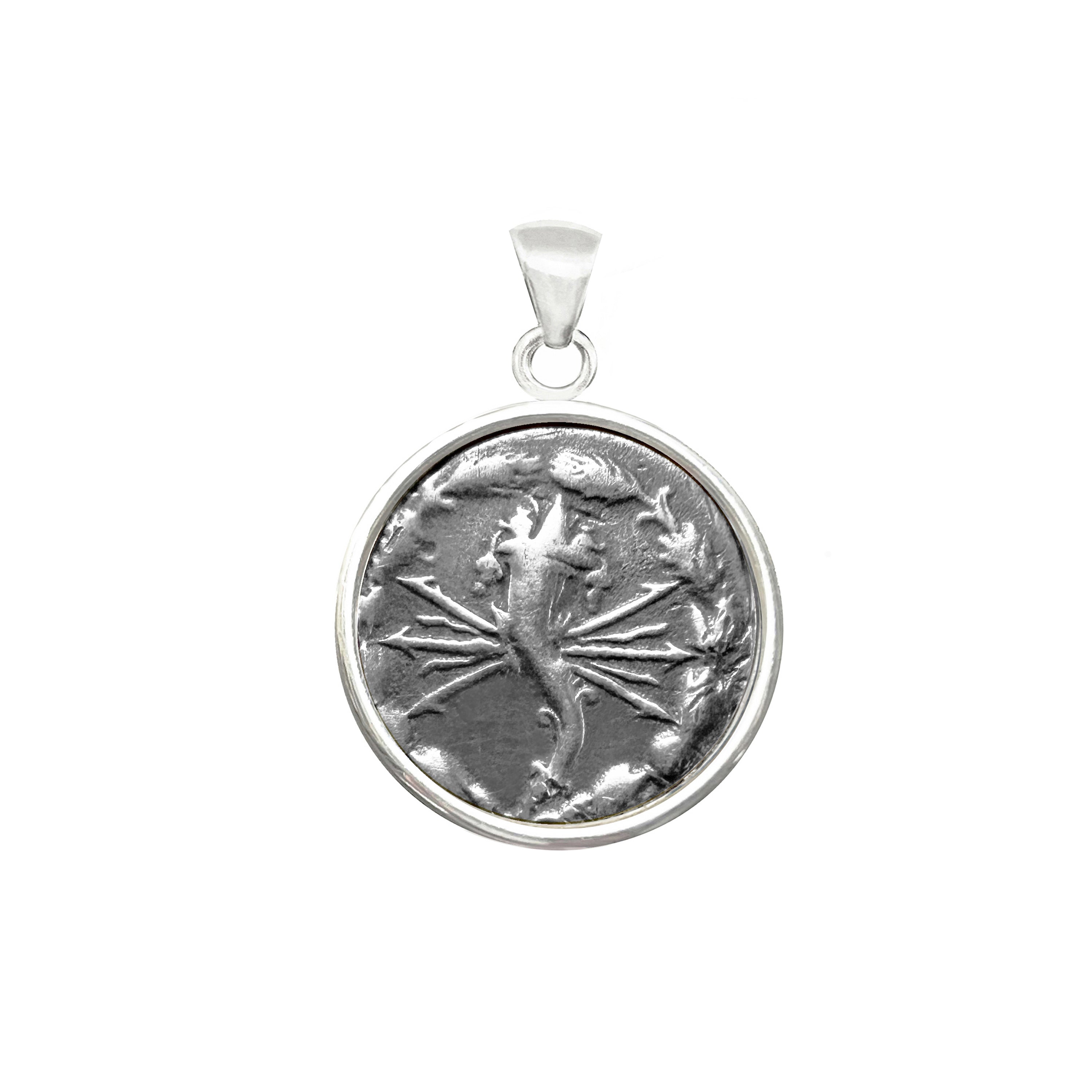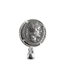 This sterling silver pendant showcases an authentic Roman Republican denarius dating back to the 2nd century BC. This ancient coin features a depiction of a cornucopia on one side and the helmeted head of the Goddess Roma on the other.