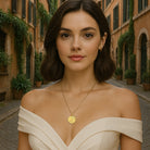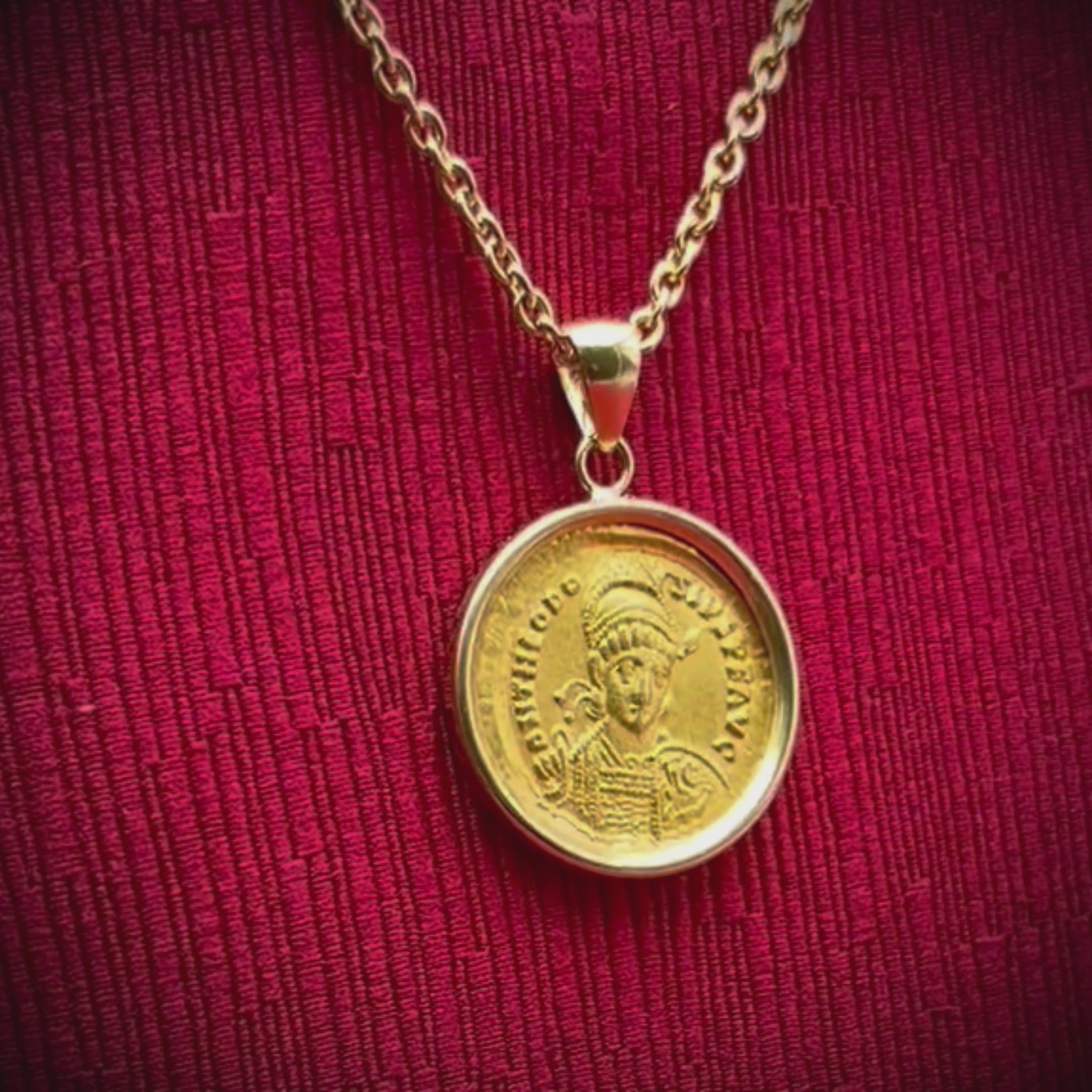 This magnificent 18 Kt gold pendant features an authentic Roman coin (solidus) in 24 Kt gold, dating back to the 5th century A.D. The coin depicts Emperor Theodosius II on one side and the personification of the city of Constantinople on the other.