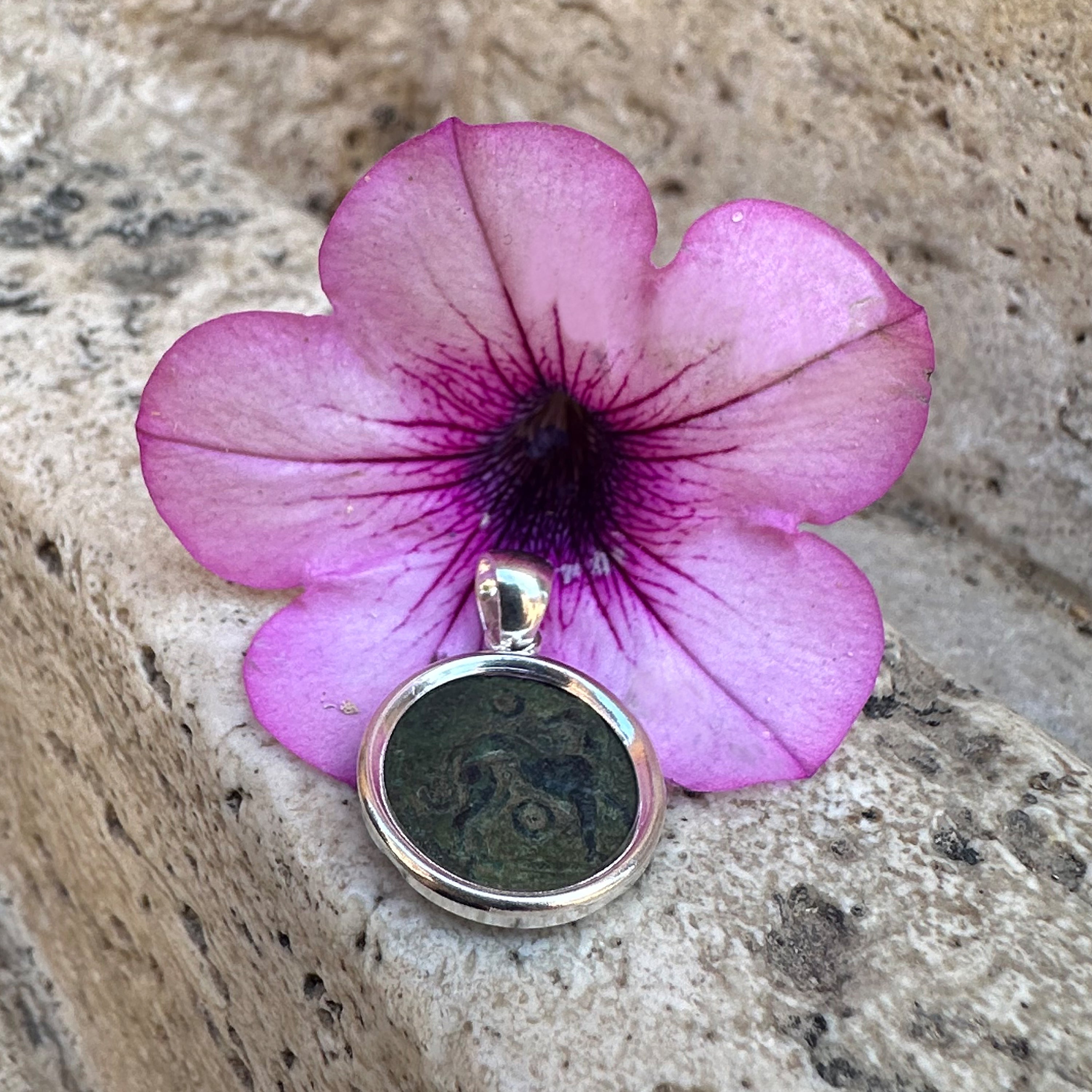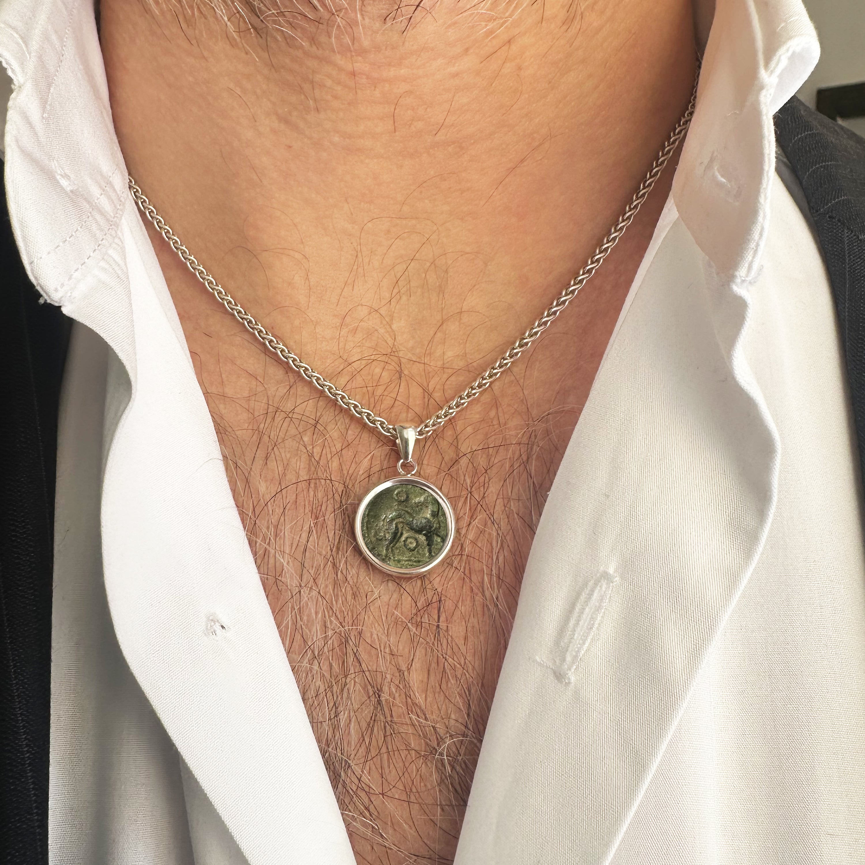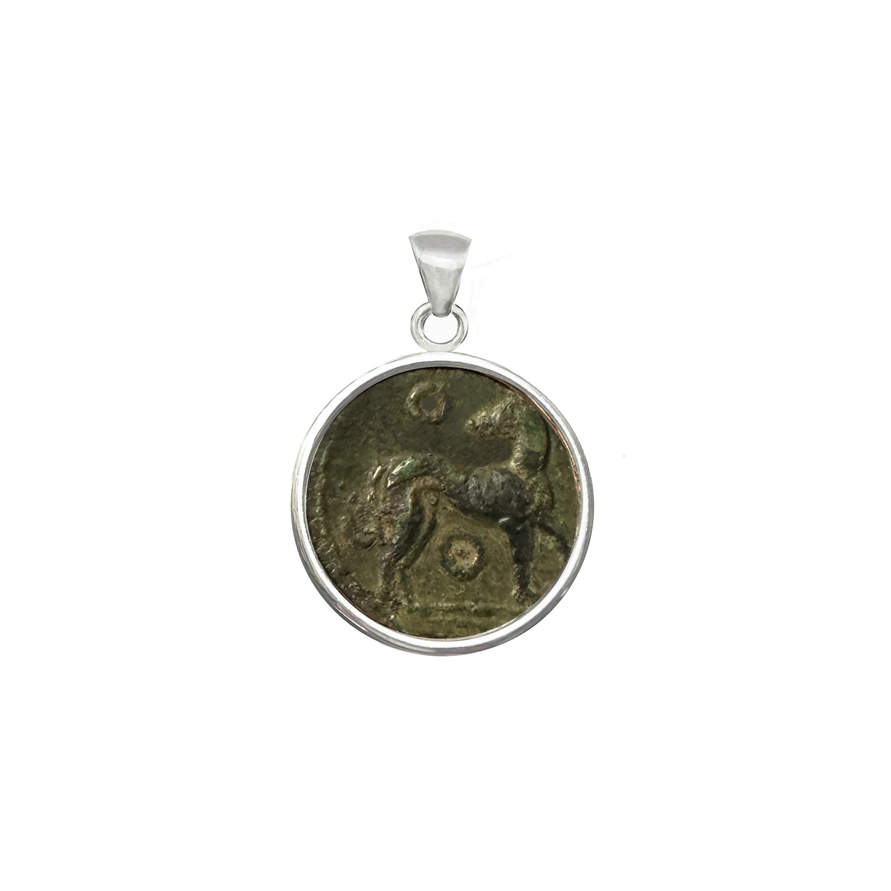 This 925 Sterling Silver Pendant showcases a genuine ancient Greek coin depicting a Hound; on the rear, instead, we can see the head of Aphrodite.