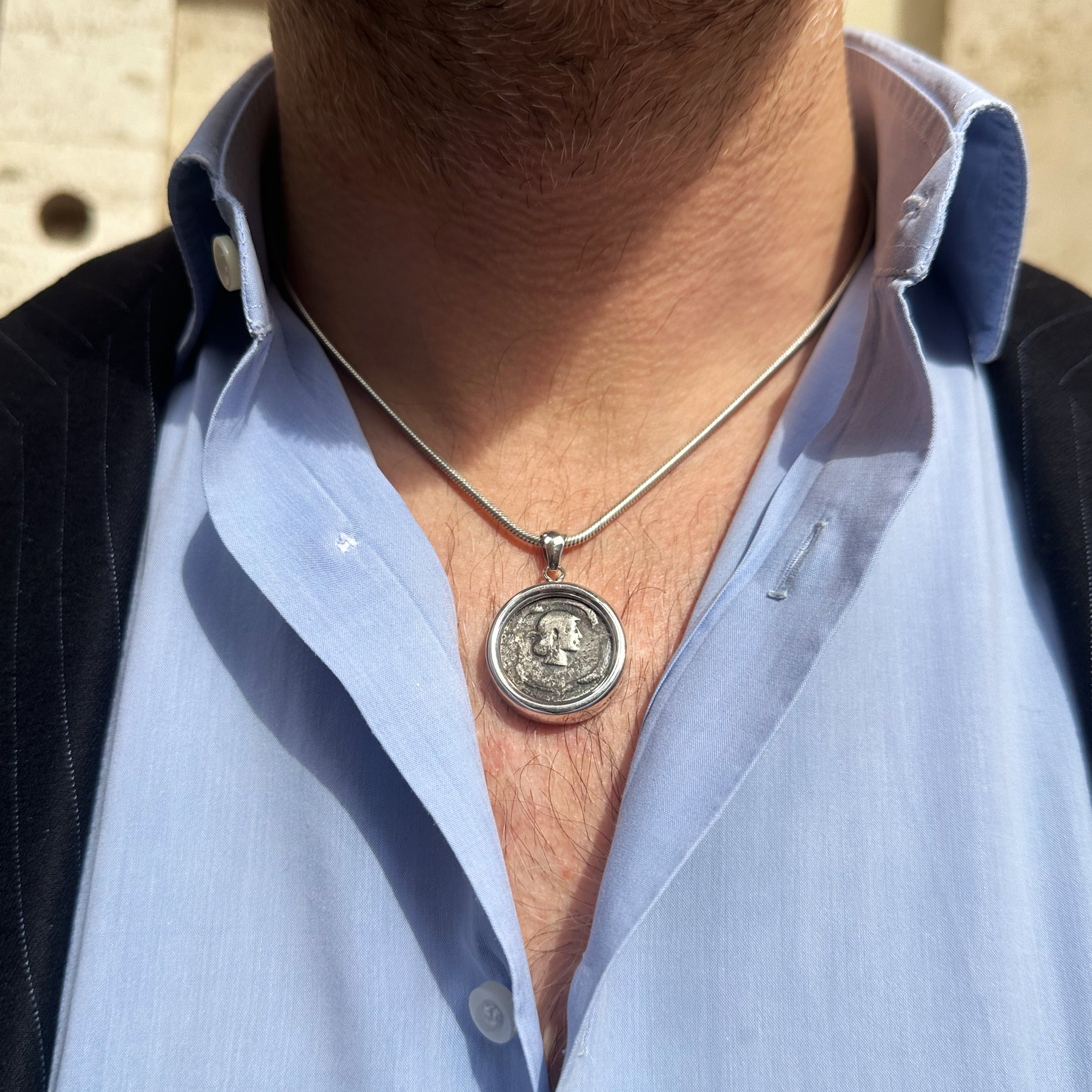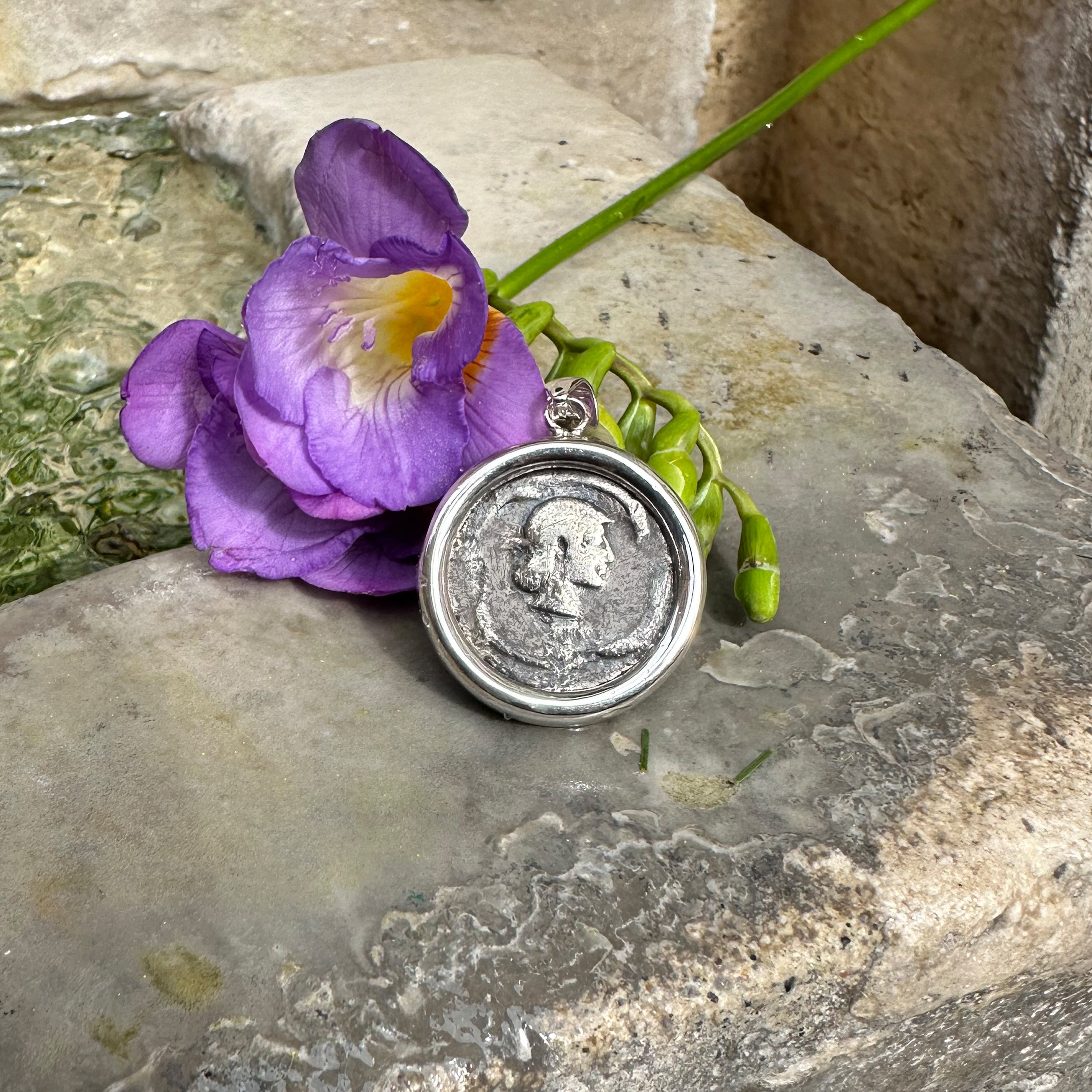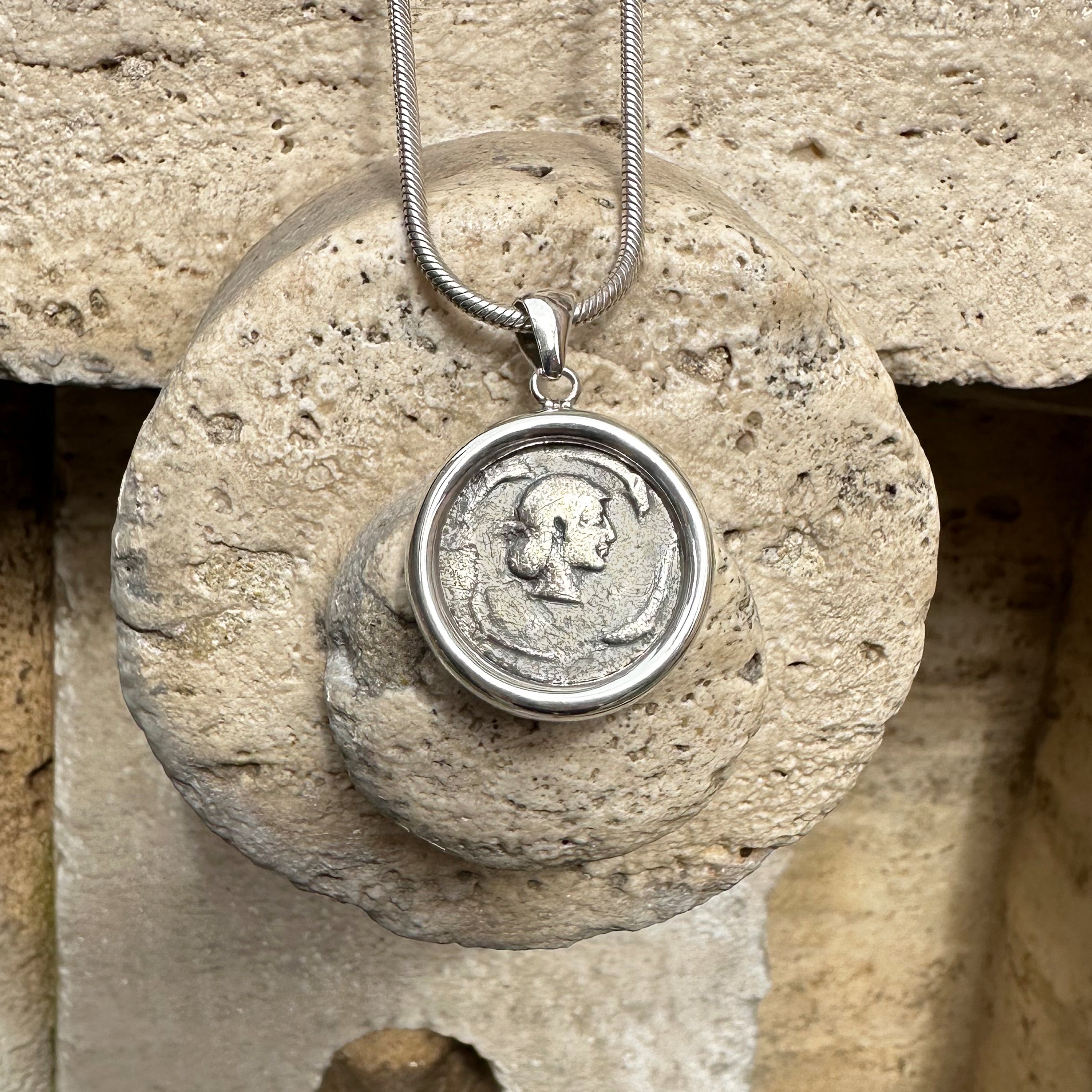 Discover an authentic ancient Greek coin pendant featuring a stunning depiction of Arethusa’s head on the front, surrounded by four playful dolphins.