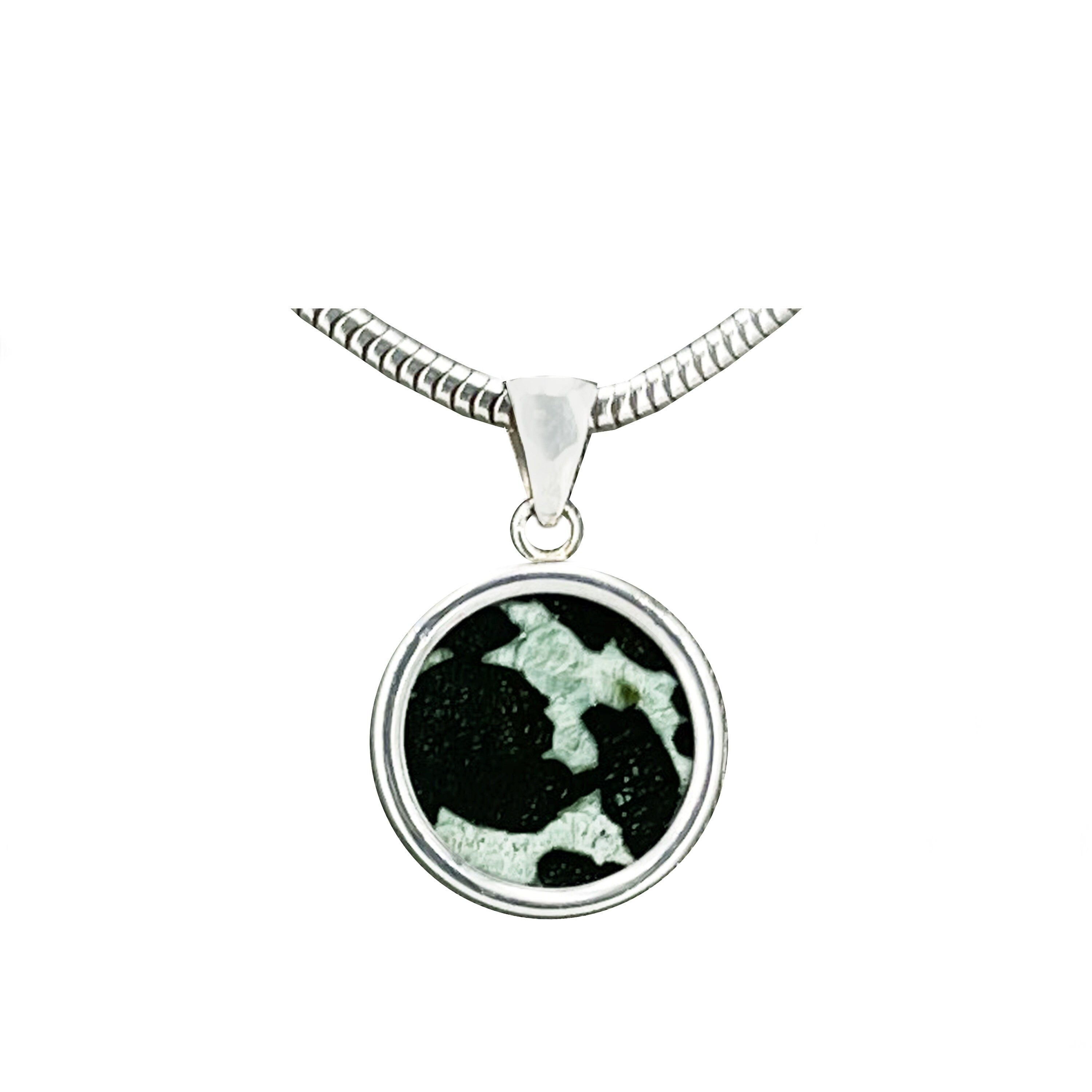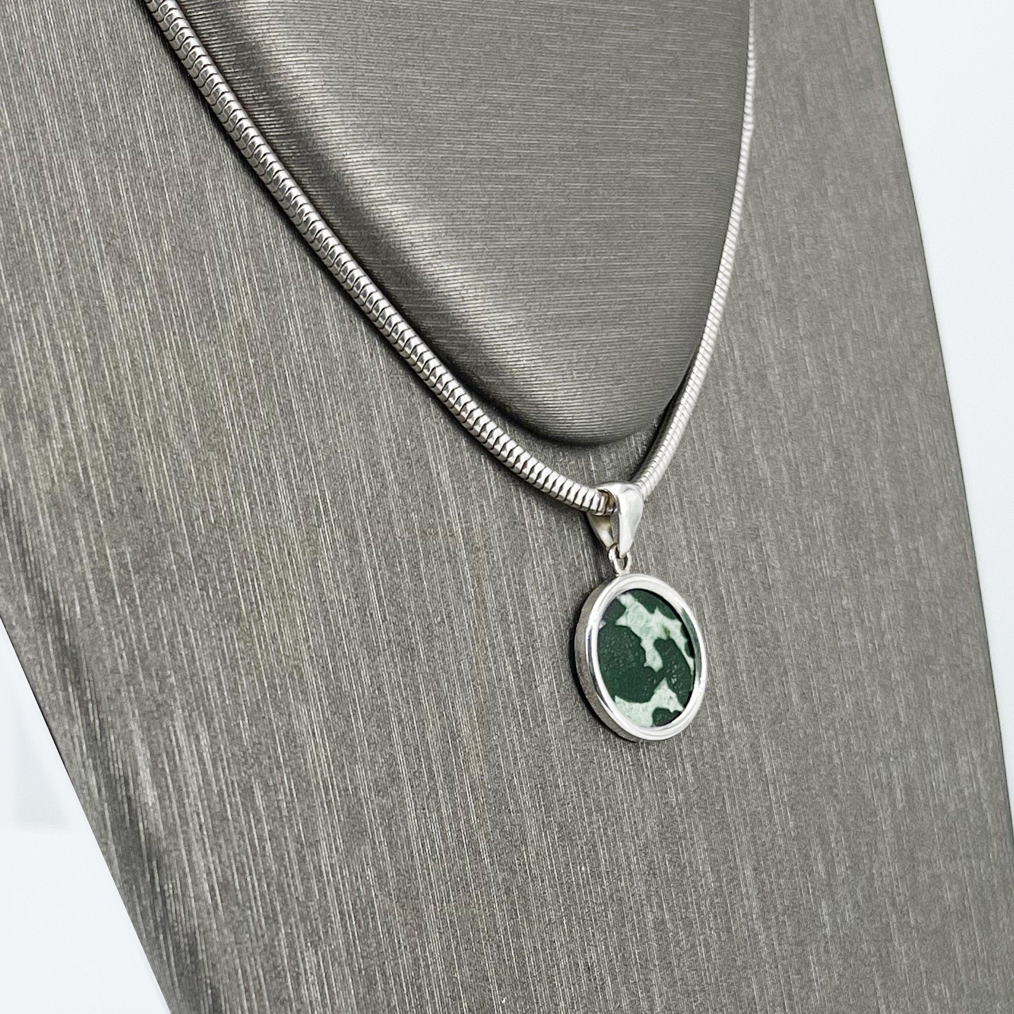 This sterling silver pendant features a highly unusual fragment of authentic "Graphic" black Roman porphyry. The marble exhibits white to green or light green inclusions arranged in a manner reminiscent of handwriting, inspiring its distinctive name. Sourced from the quarries that also produced red porphyry, this material was prominent in usage during the 1st and 2nd centuries AD.