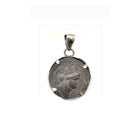 An authentic Greek coin from the 1st century AD is set in this original 925 silver pendant, depicting a ram next to a crescent moon. On the back, there is a veiled woman with a turreted crown. The ram depicts the zodiac sign of Aries, under which the city of Seleucia, in Antioch, was founded, from which comes the coin.