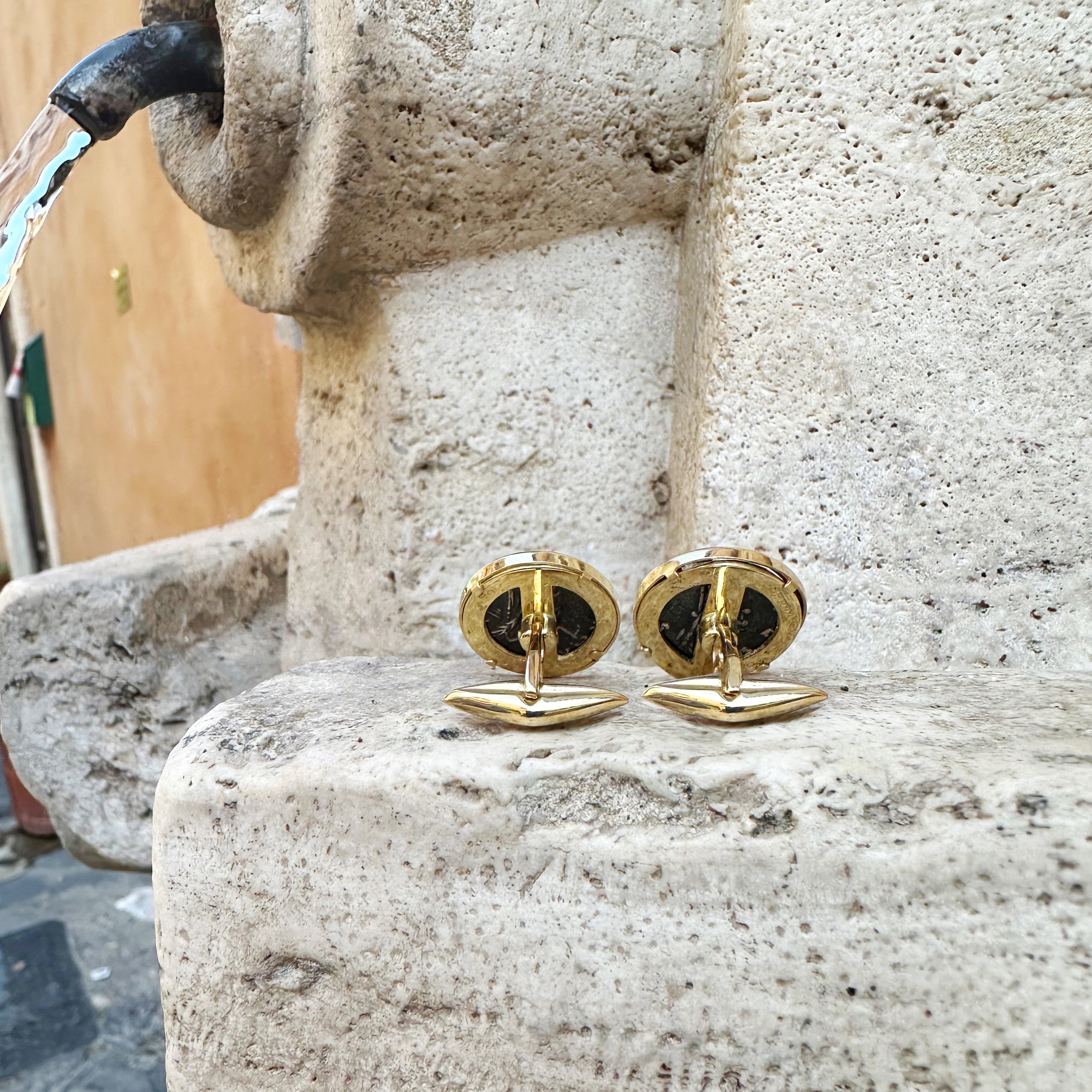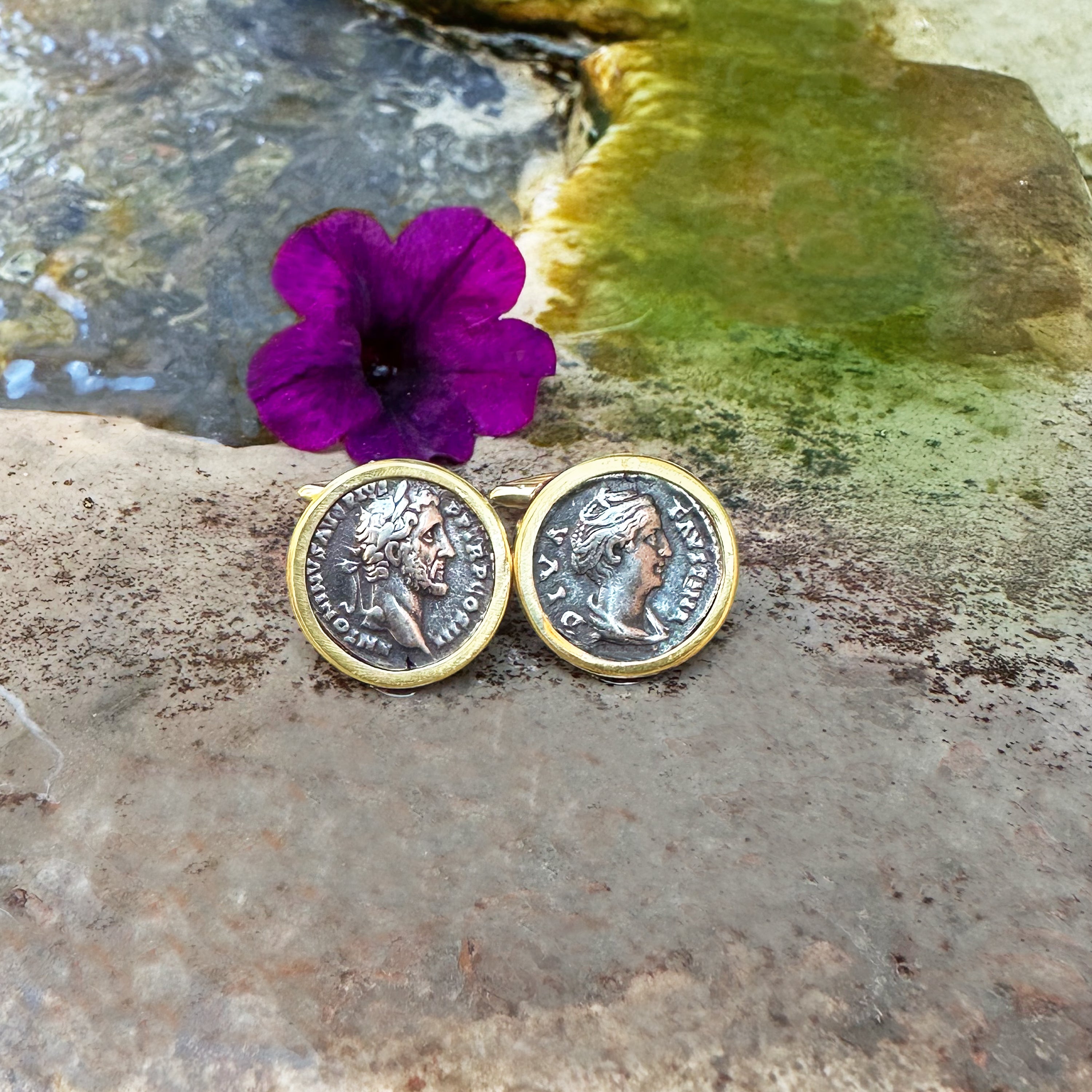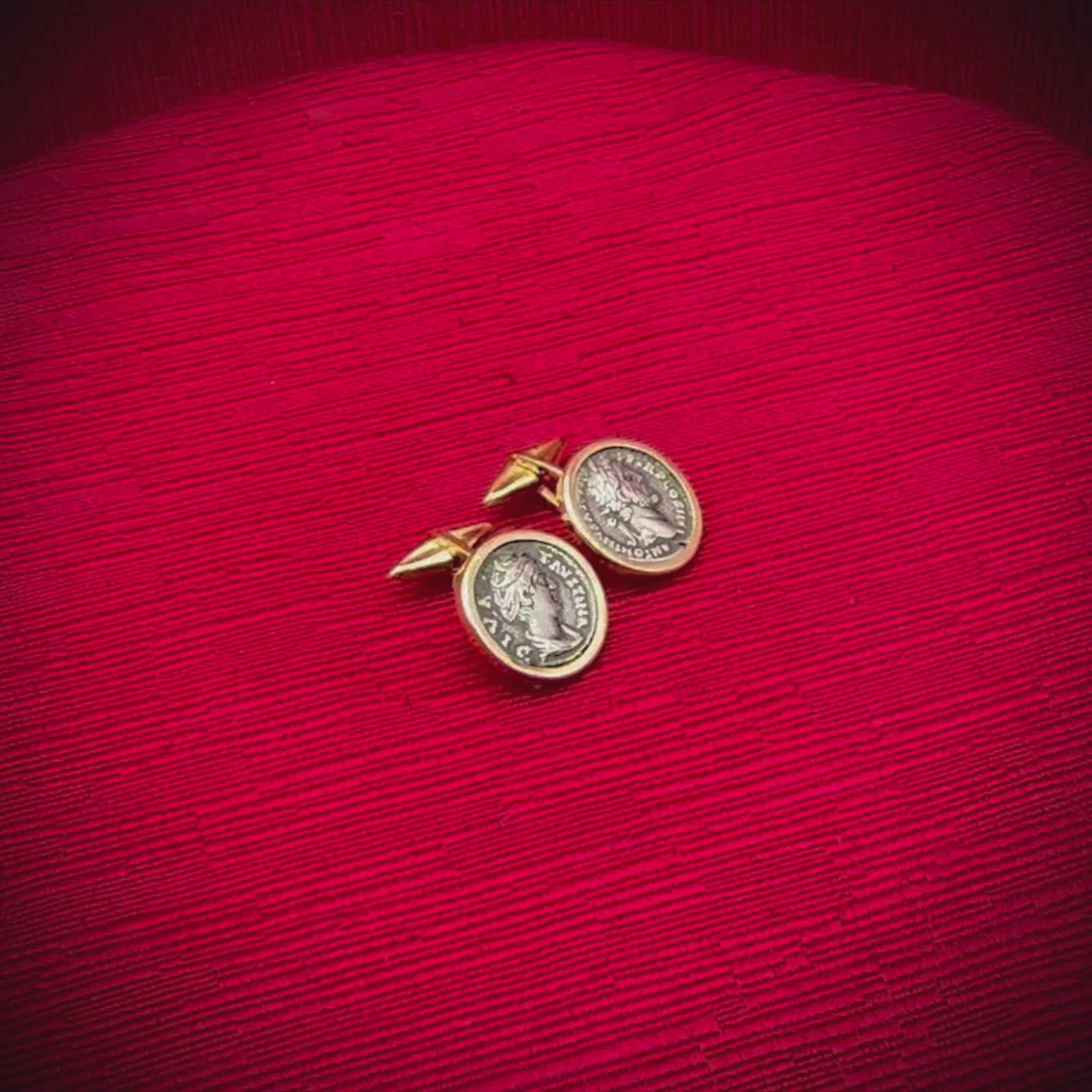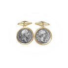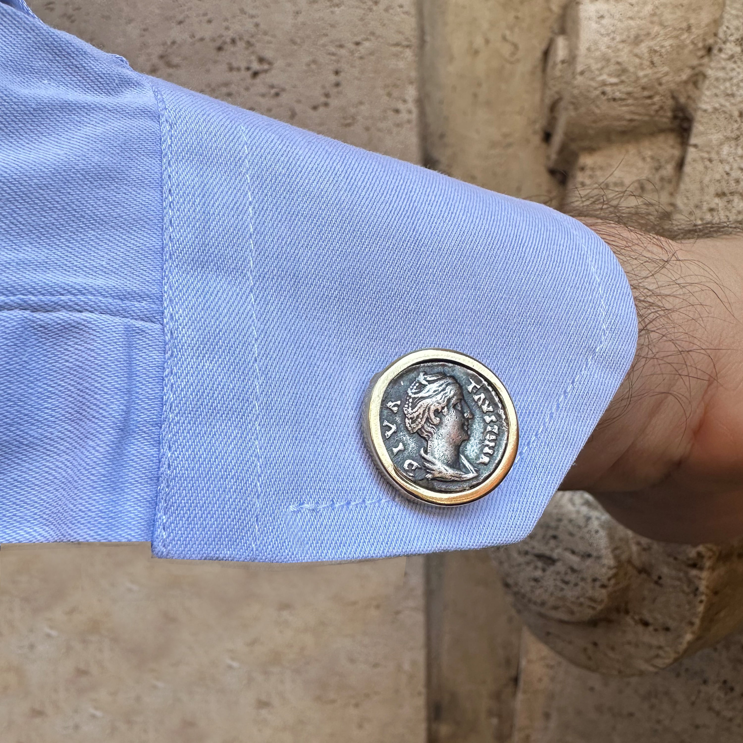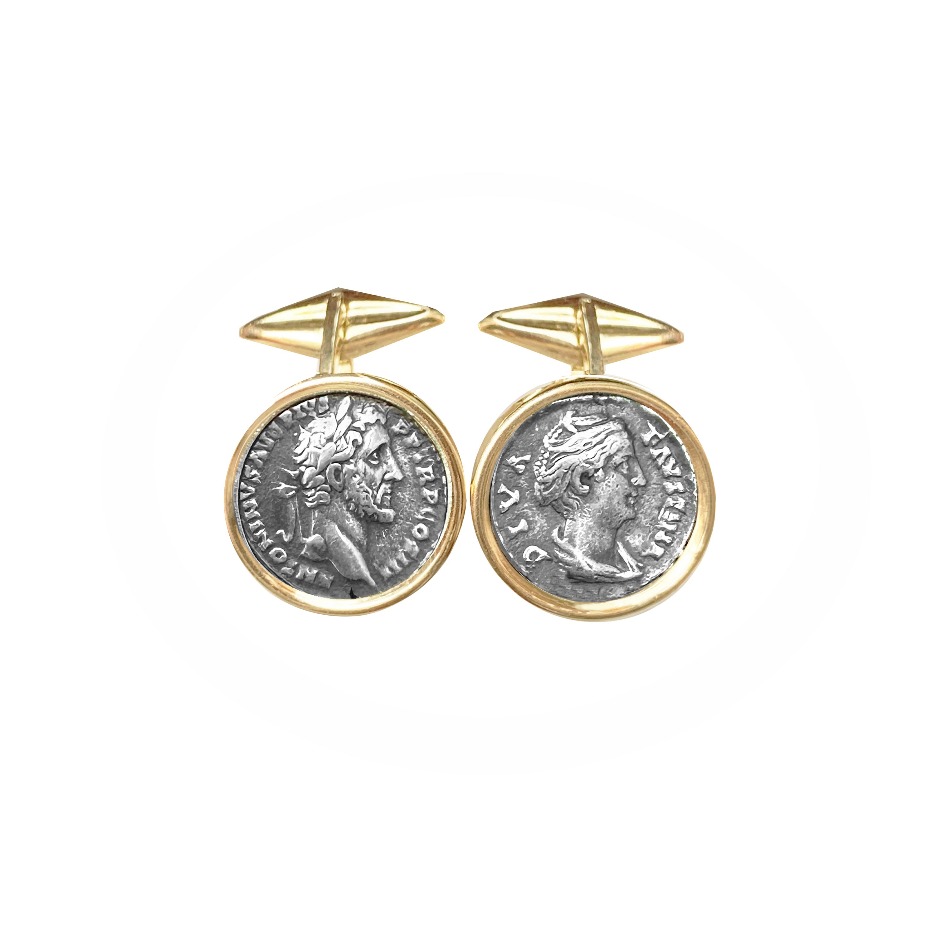 Ces boutons de manchette en or 18 carats sont ornés de deux véritables deniers romains en argent du IIe siècle après J.-C., représentant l'empereur Antonin le Pieux et sa femme, Faustine l'Aînée. Titus Aelius Hadrianus Antoninus Pius (19 septembre 86 - 7 mars 161) fut empereur romain de 138 à 161 et l'un des cinq empereurs estimés de la dynastie Nerva-Antonine. Né dans une famille sénatoriale, Antoninus occupa diverses fonctions sous l'empereur Hadrien, épousant la nièce d'Hadrien, Faustine. Avant la mort d'Hadrien, Antoninus fut adopté comme son fils et successeur.