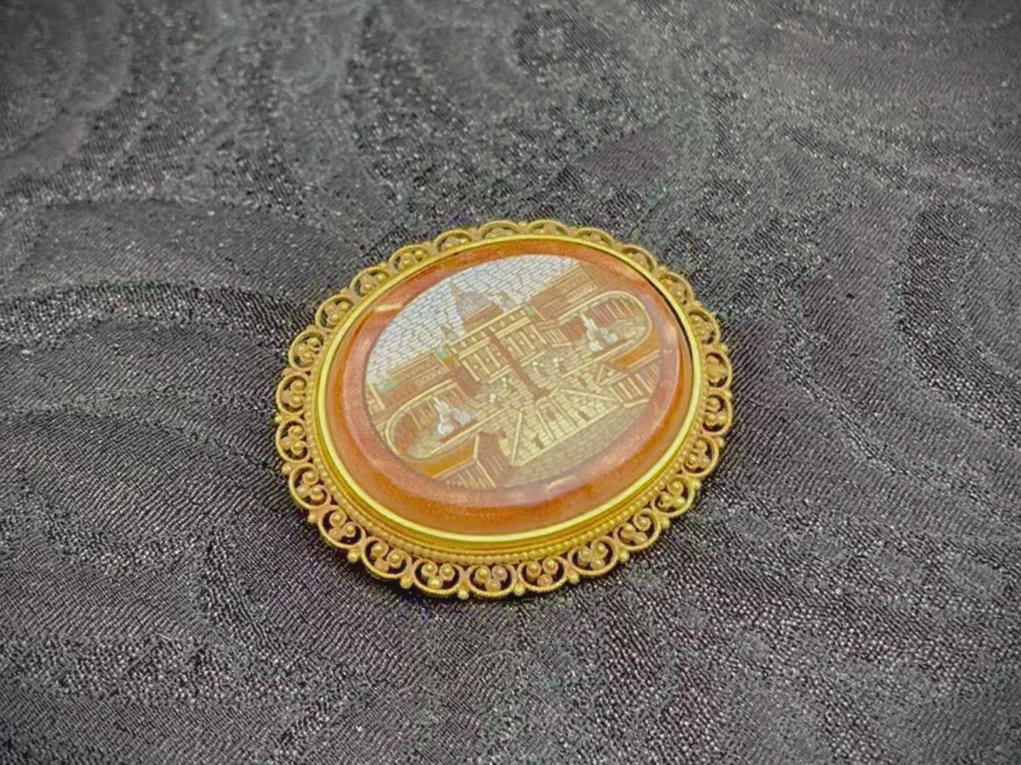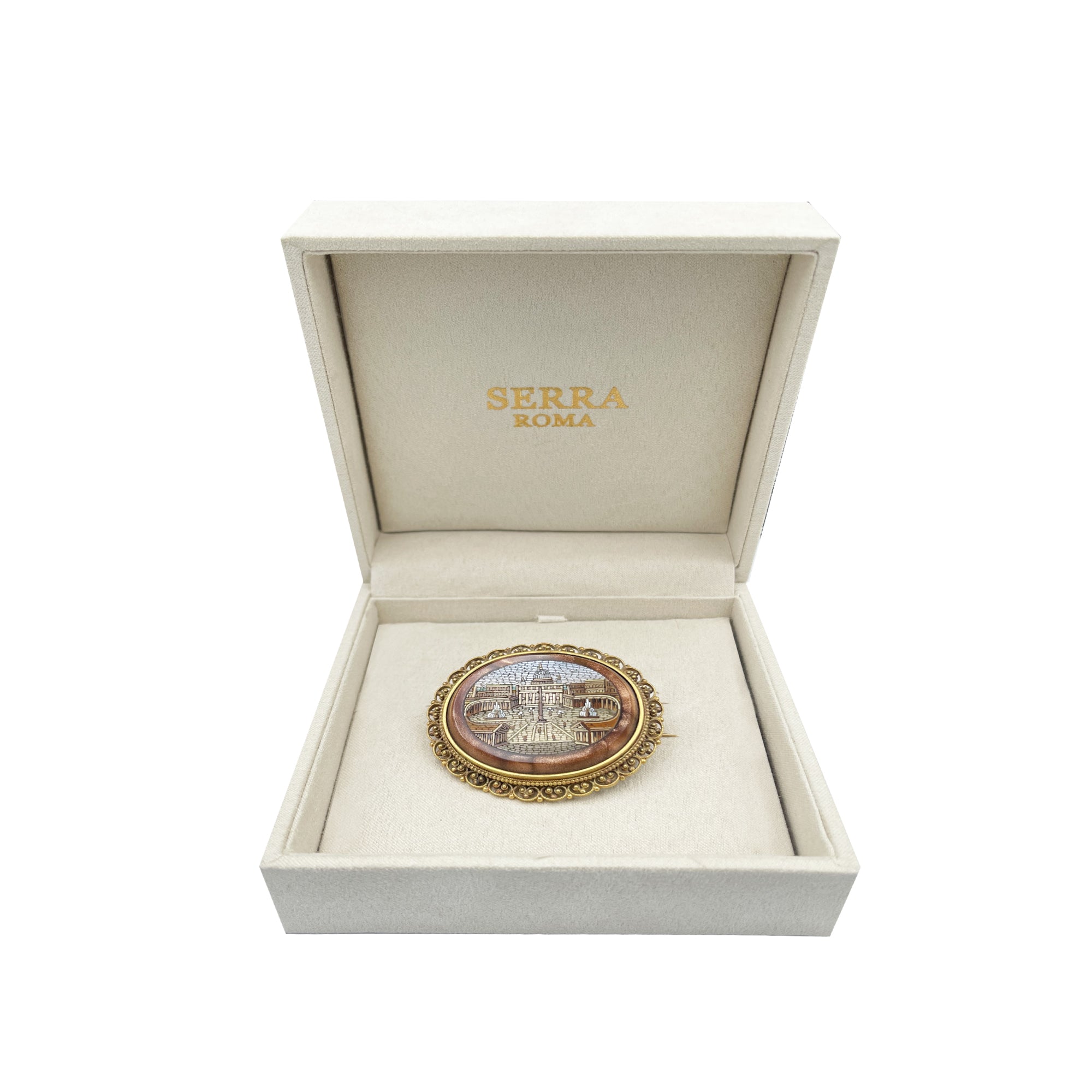 Dans cette broche en or 18 kt est sertie une belle micromosaïque (vers 1850) représentant la Basilique Saint-Pierre.