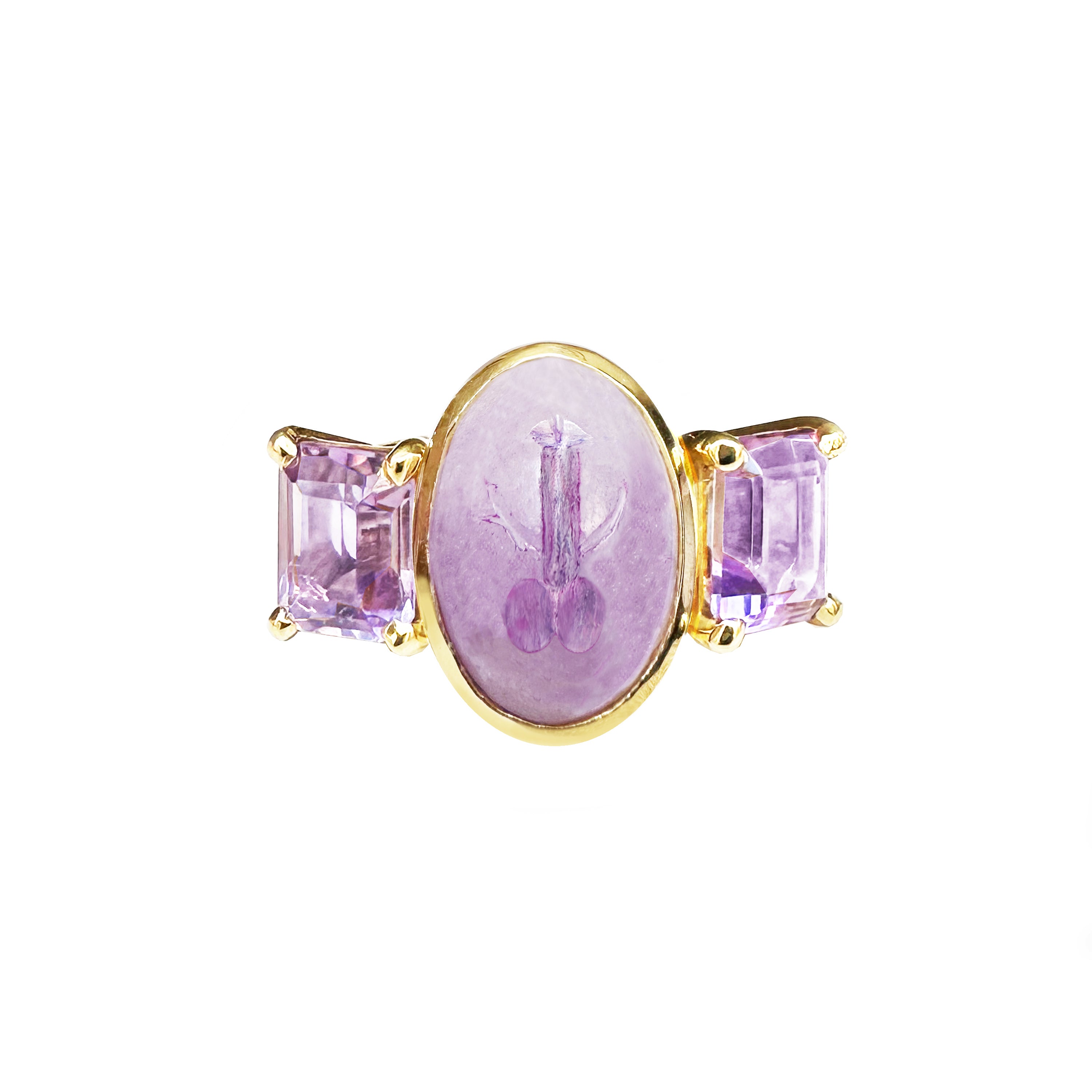 Cette bague exquise est fabriquée en or 18 carats et présente une authentique intaille romaine sur améthyste, datant du 1er-2e siècle après J.-C. L'intaille représente un phallus ailé, qui revêt une grande importance dans la religion et la magie romaines antiques. Le fascinus, représenté par le phallus divin, était censé posséder de puissantes qualités protectrices contre l'envie et le mauvais œil.