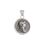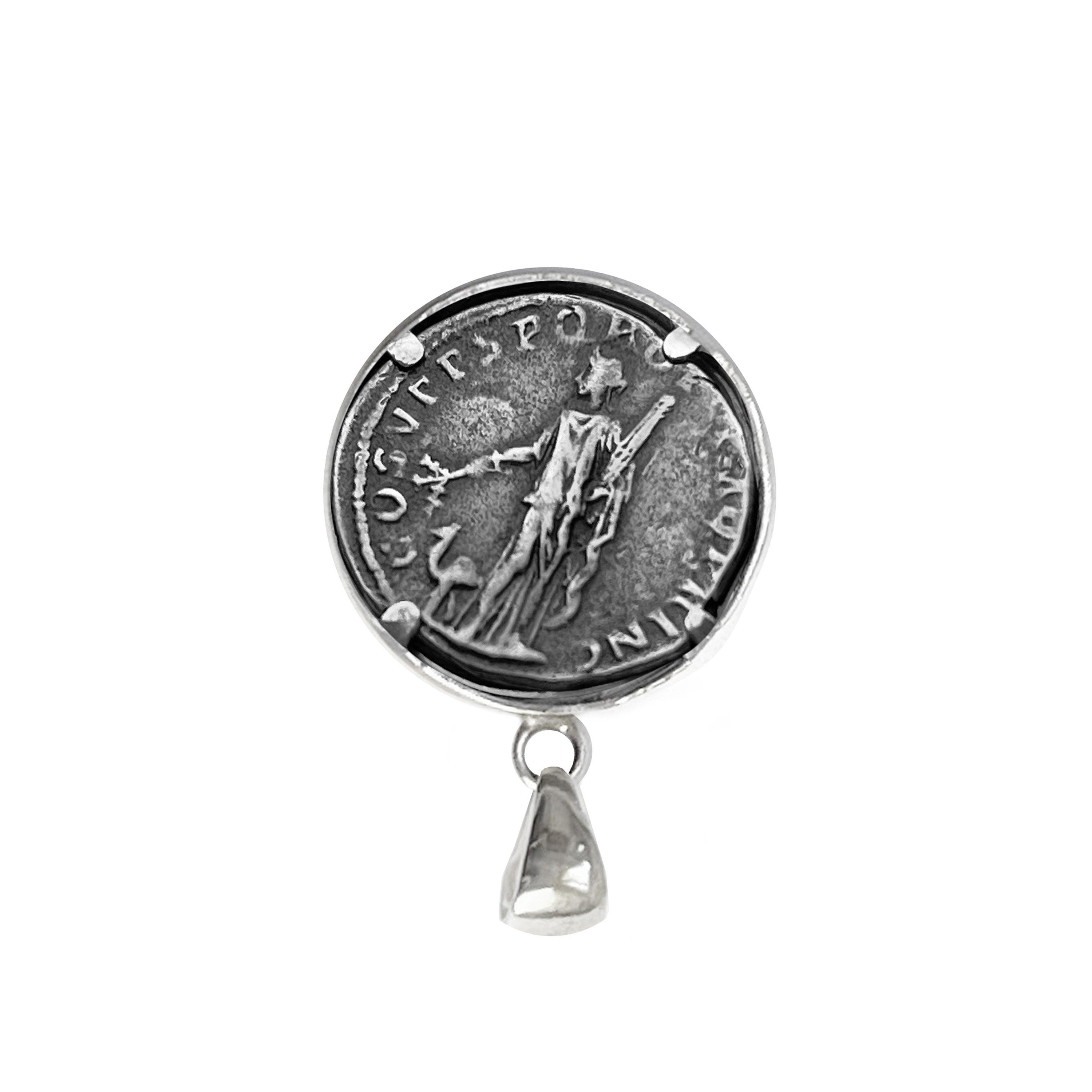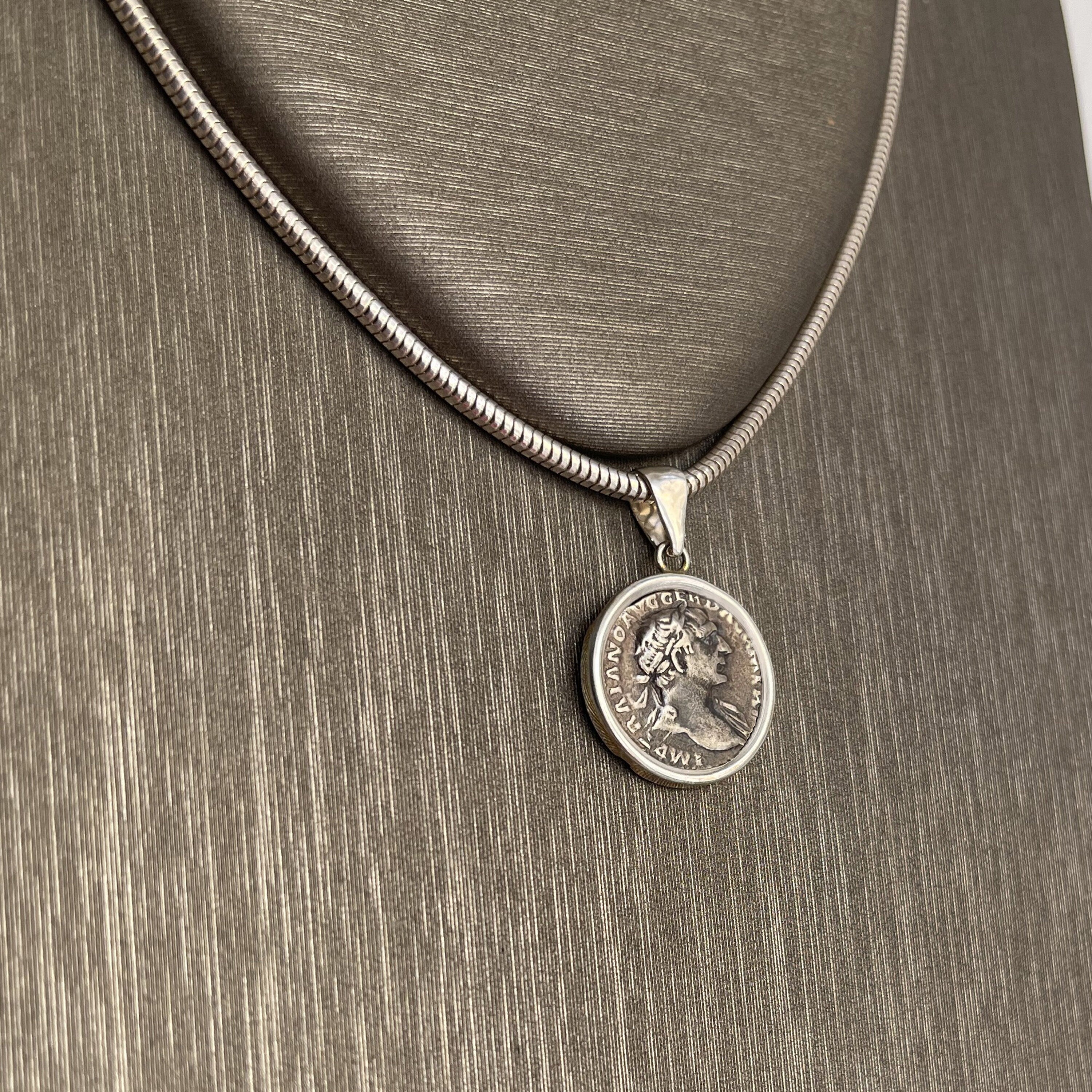 Ce pendentif en argent sterling met en valeur une authentique pièce de monnaie romaine datant du IIe siècle après J.-C., représentant l'empereur Trajan sur une face. Au revers, on aperçoit la personnification de l'Arabie, représentée avec une branche dans une main et un fagot de cannes dans l'autre, avec un petit chameau reposant à leurs pieds. Trajan, qui régna de 98 à 117 après J.-C., reçut du Sénat le titre d'"optimus princeps" ou "meilleur souverain". Réputé pour ses prouesses militaires, Trajan supervisa une expansion sans précédent de l'Empire romain, culminant à sa plus grande étendue territoriale au moment de son décès.