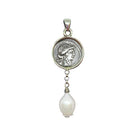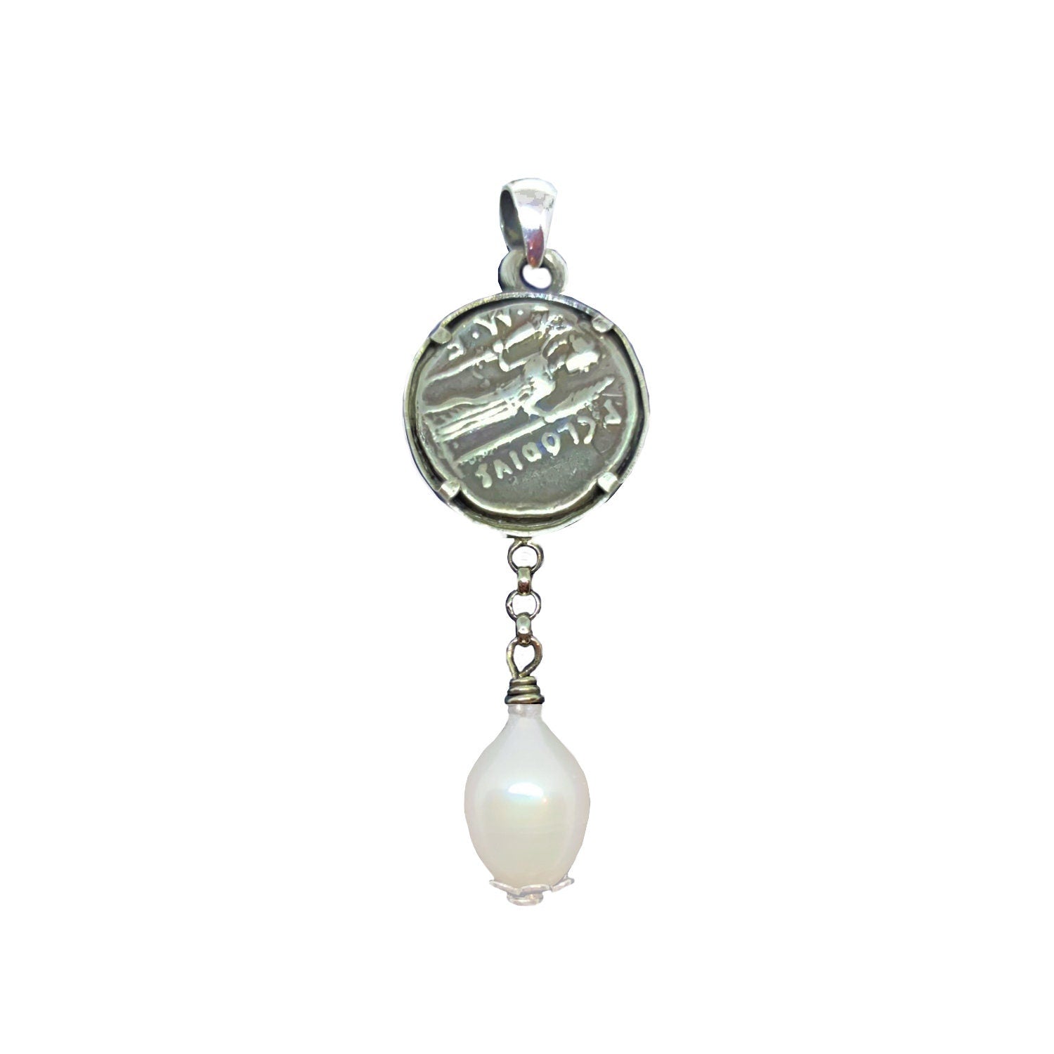 Au centre du pendentif se trouve un authentique denier romain en argent représentant la tête laurée d'Apollon (42 av. J.-C.). Apollon est l'une des divinités olympiennes les plus importantes et les plus complexes de la mythologie grecque et romaine classique. Apollon a été reconnu comme un dieu du tir à l'arc, de la musique et de la danse, de la vérité et de la prophétie, de la guérison et des maladies, du soleil et de la lumière, de la poésie, etc.