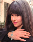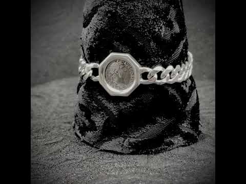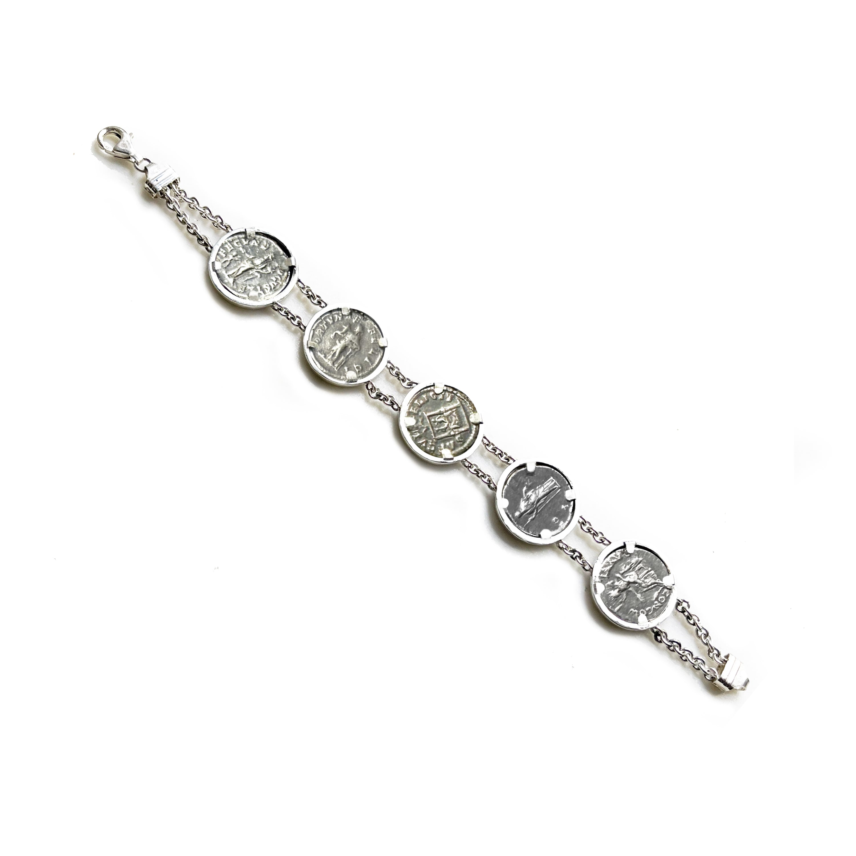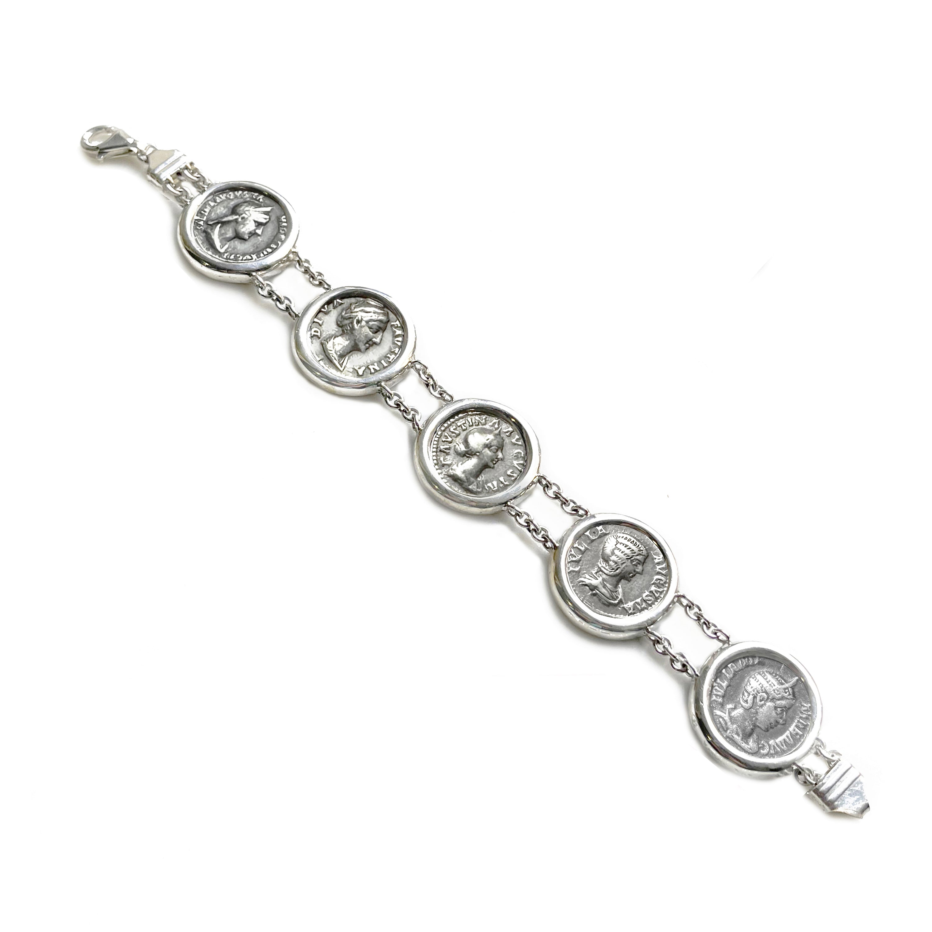 Questo eccezionale braccialetto in argento sterling mette in mostra la squisita bellezza delle antiche monete romane. Incastonata con cinque denari autentici, risalenti al II e III secolo d.C., ciascuna moneta raffigura un'imperatrice romana (ad eccezione dell'ultima moneta, che raffigura Giulia Mamea, la madre dell'imperatore Alessandro Severo, piuttosto che sua moglie). Le monete presenti in questo braccialetto sono: