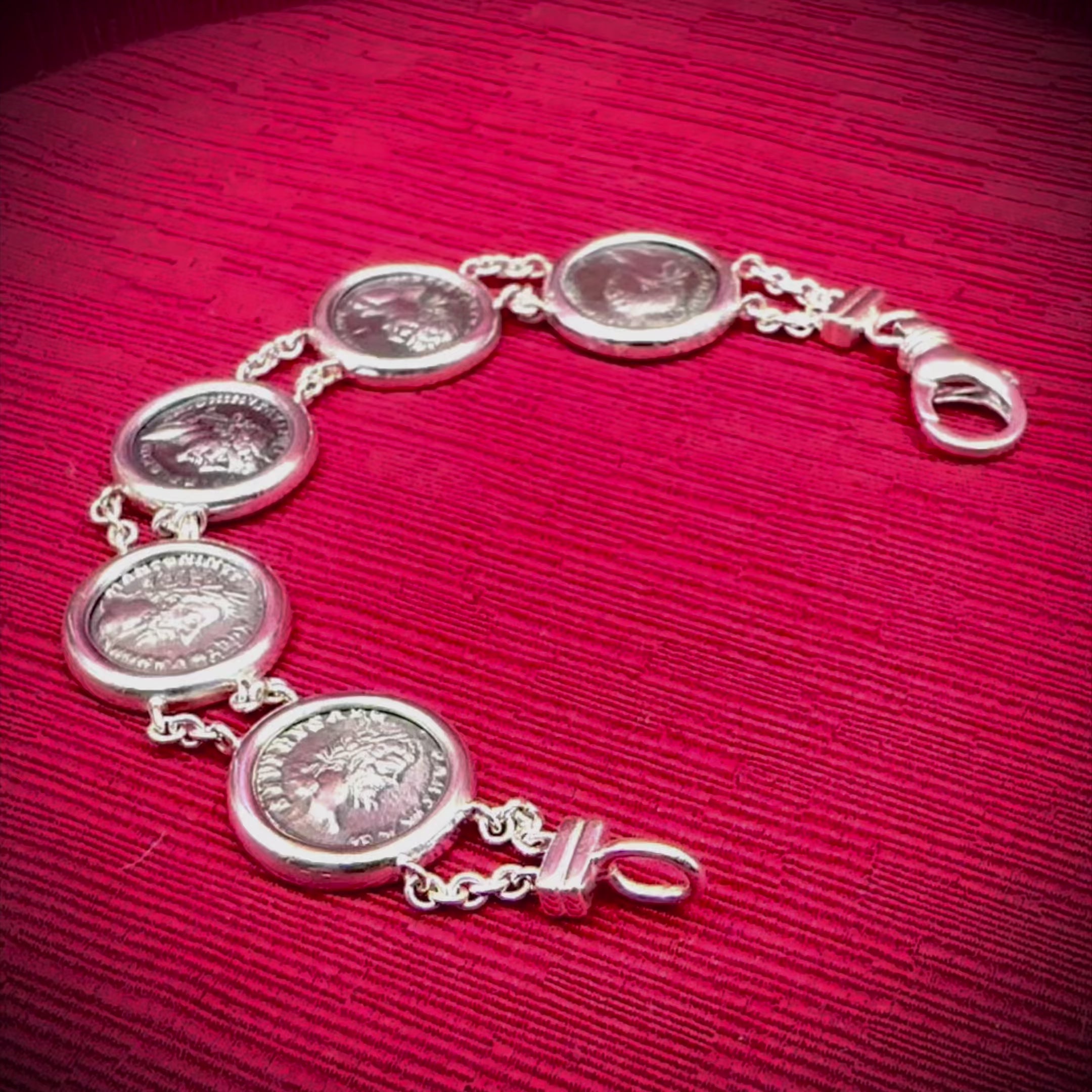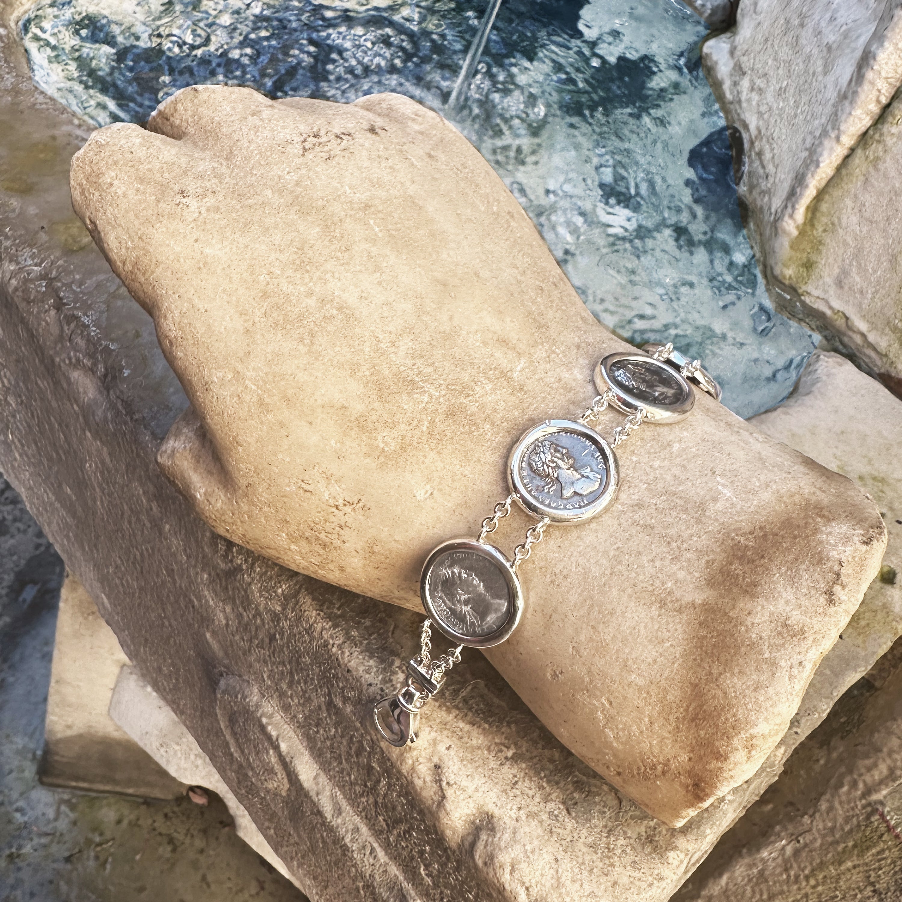 FIVE EMPERORS Bracciale in argento 925 autentico monete romane antiche 2° secolo d.C.