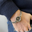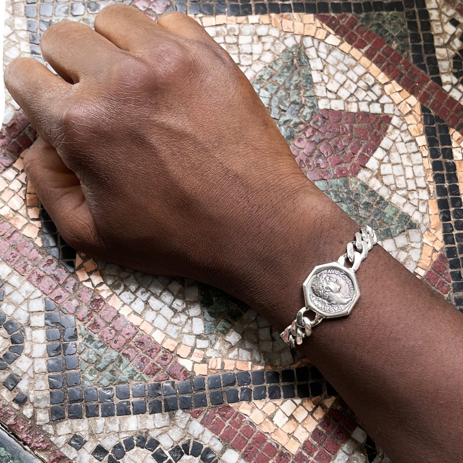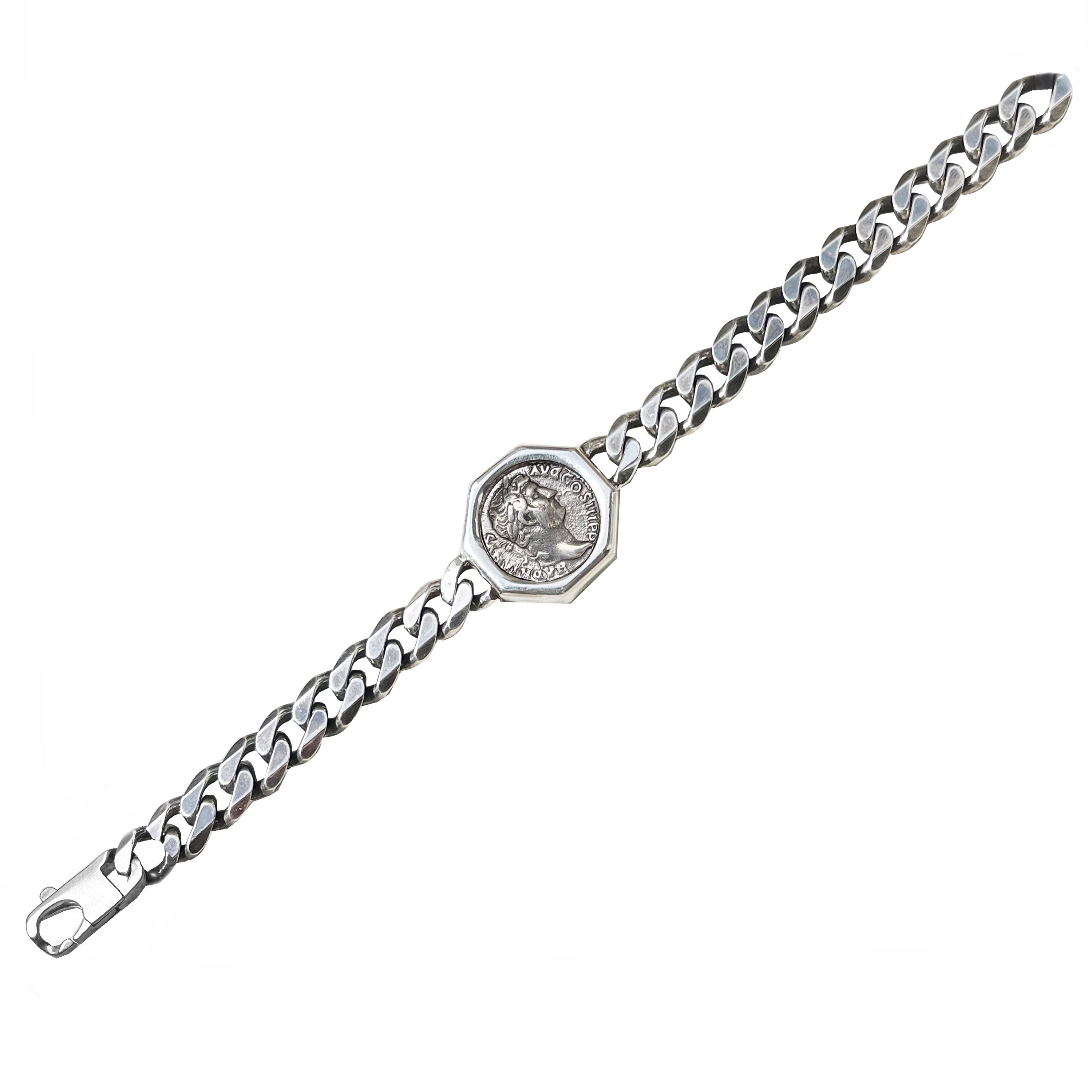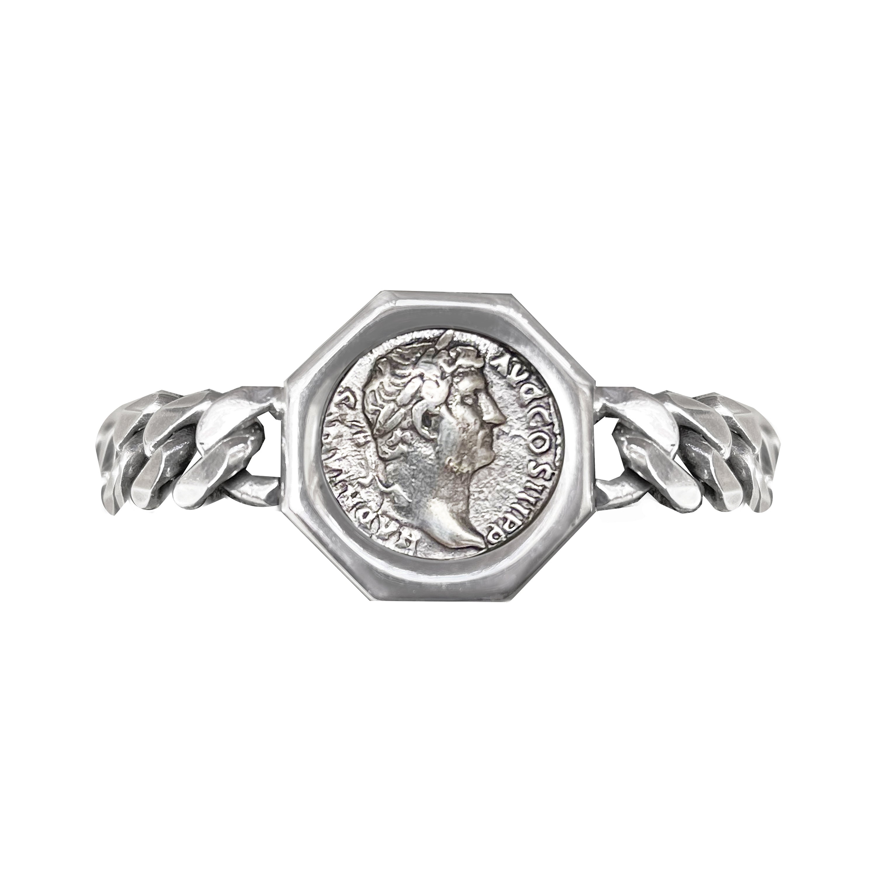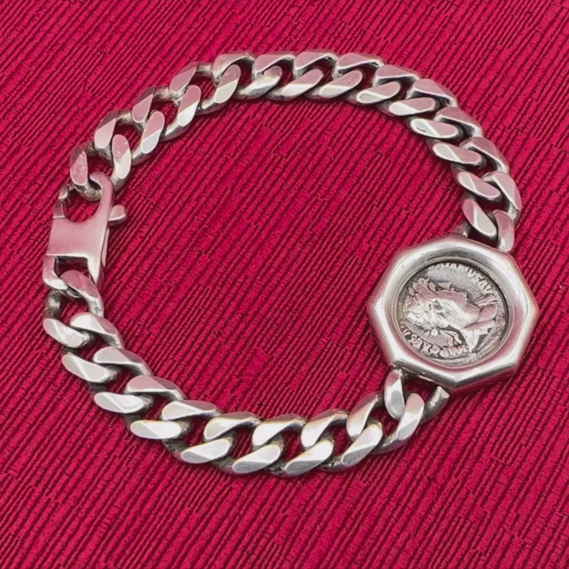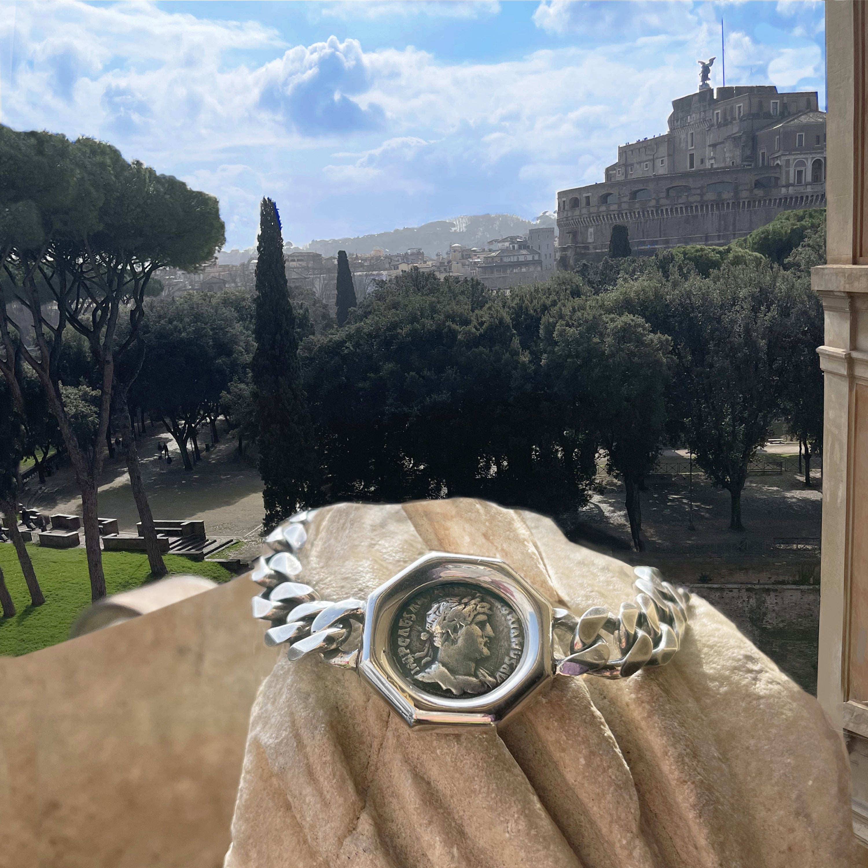 Questo braccialetto in argento sterling massiccio mette in mostra un autentico denario d'argento del II secolo d.C., con le sembianze dell'imperatore Adriano. La moneta è stata accuratamente incastonata nel braccialetto e sul rovescio possiamo ammirare la raffigurazione della Dea Roma seduta su un trono. Realizzato interamente a mano dai nostri abili orafi, questo braccialetto esemplifica un'eccezionale maestria. Come tutti i nostri gioielli, viene fornito con un certificato di autenticità, che garantisce l'autenticità della moneta.
