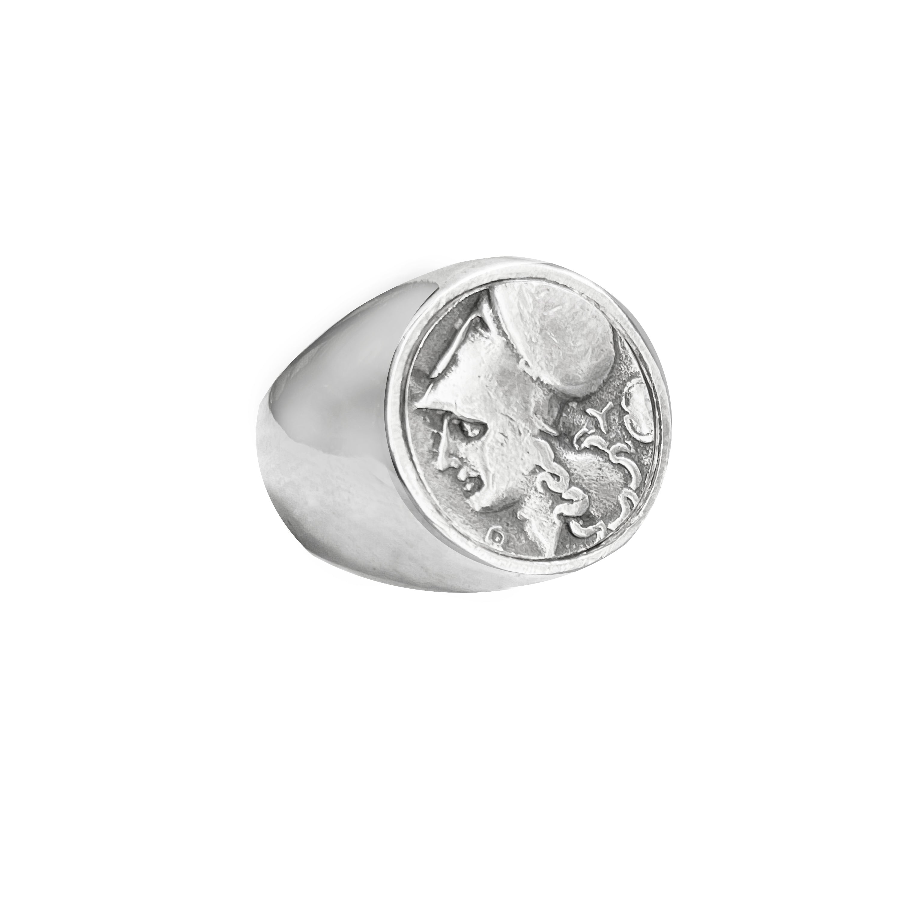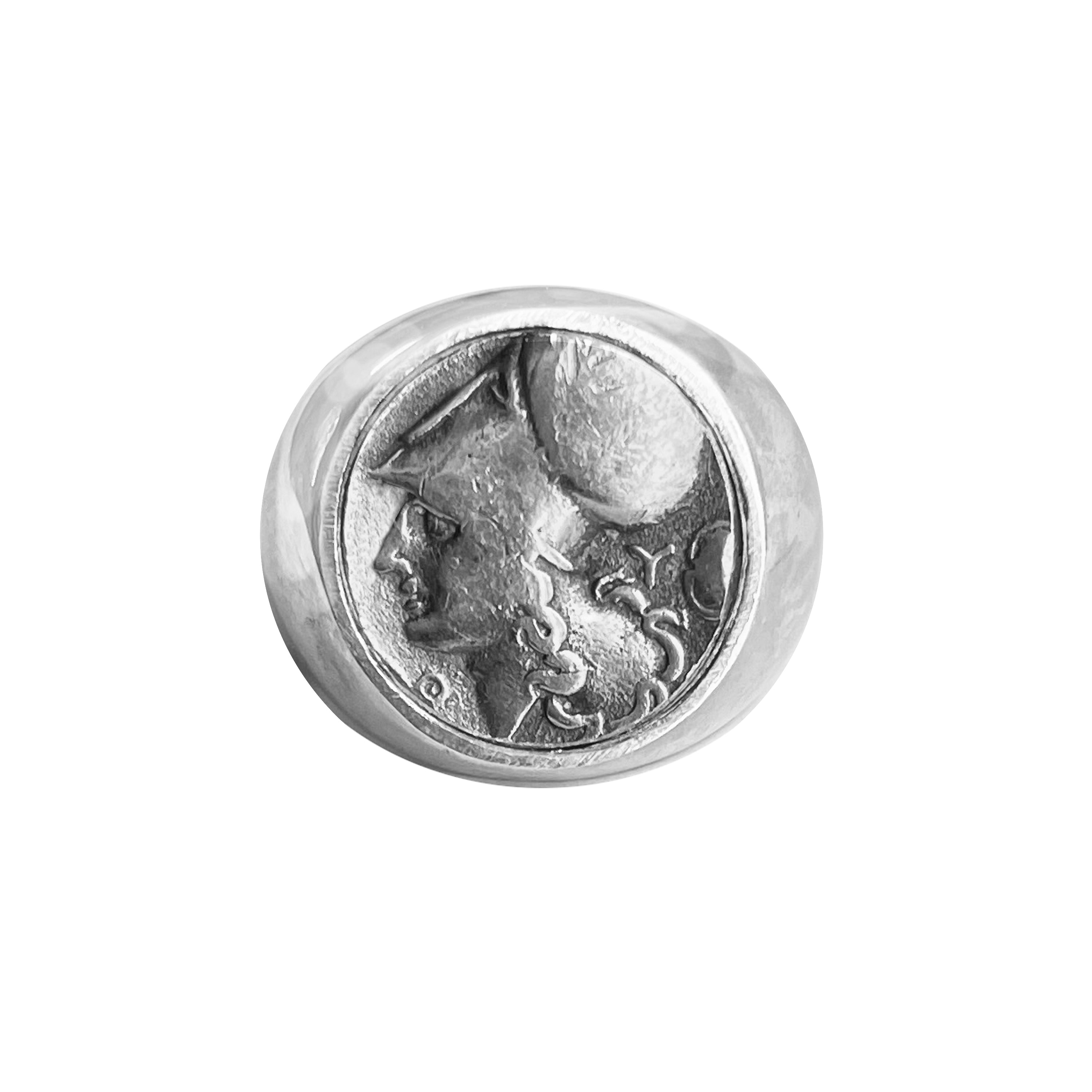 All'interno di questo anello riposa un'antica moneta greca della Tessaglia del II-III secolo a.C., raffigurante Atena su un lato, un simbolo di saggezza e guerra, venerata come guardiana di Atene. Il rovescio della moneta rivela Pegaso, il cavallo alato che svetta verso sinistra. Atena, una dea vergine, incarnava la pace e l'abilità insieme alla sua abilità marziale, guadagnandosi la riverenza anche da Ares. Il nome della città si intreccia con il suo, dibattuto dagli antichi greci ma probabilmente conferitole da Atena.