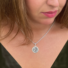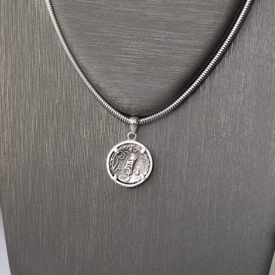 Questo ciondolo contiene un'autentica moneta romana con l'immagine di Giunone Sospita, conosciuta dai romani come "la protettrice". Sul rovescio della moneta è raffigurata una giovane donna con un serpente in posizione verticale. Secondo la leggenda a Lanuvio, dove si venerava Giunone Sospita, si svolgeva un rito che prevedeva l'invio di una giovane vergine con del cibo in una grotta abitata da un pericoloso serpente. Se il serpente accettava il cibo era segno della verginità della ragazza e della sua sicurezza.