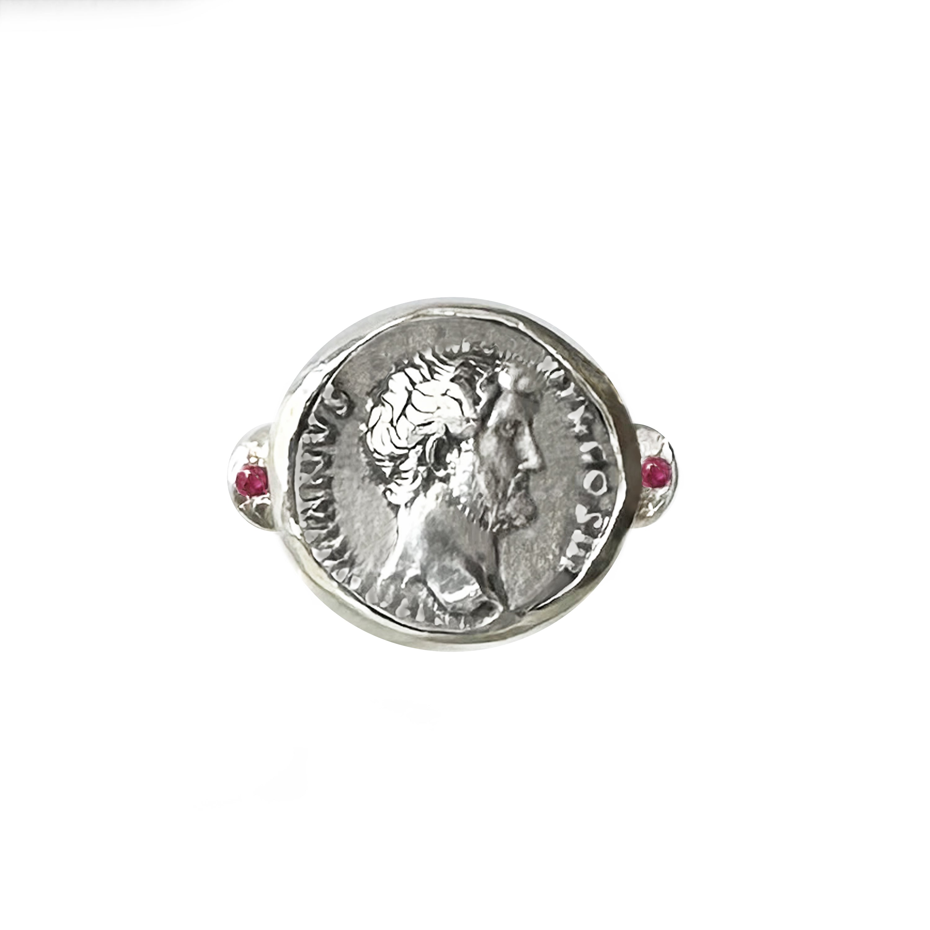 Autentica moneta romana antica 2° cent. dC Anello in argento con rubini raffigurante l'imperatore Adriano