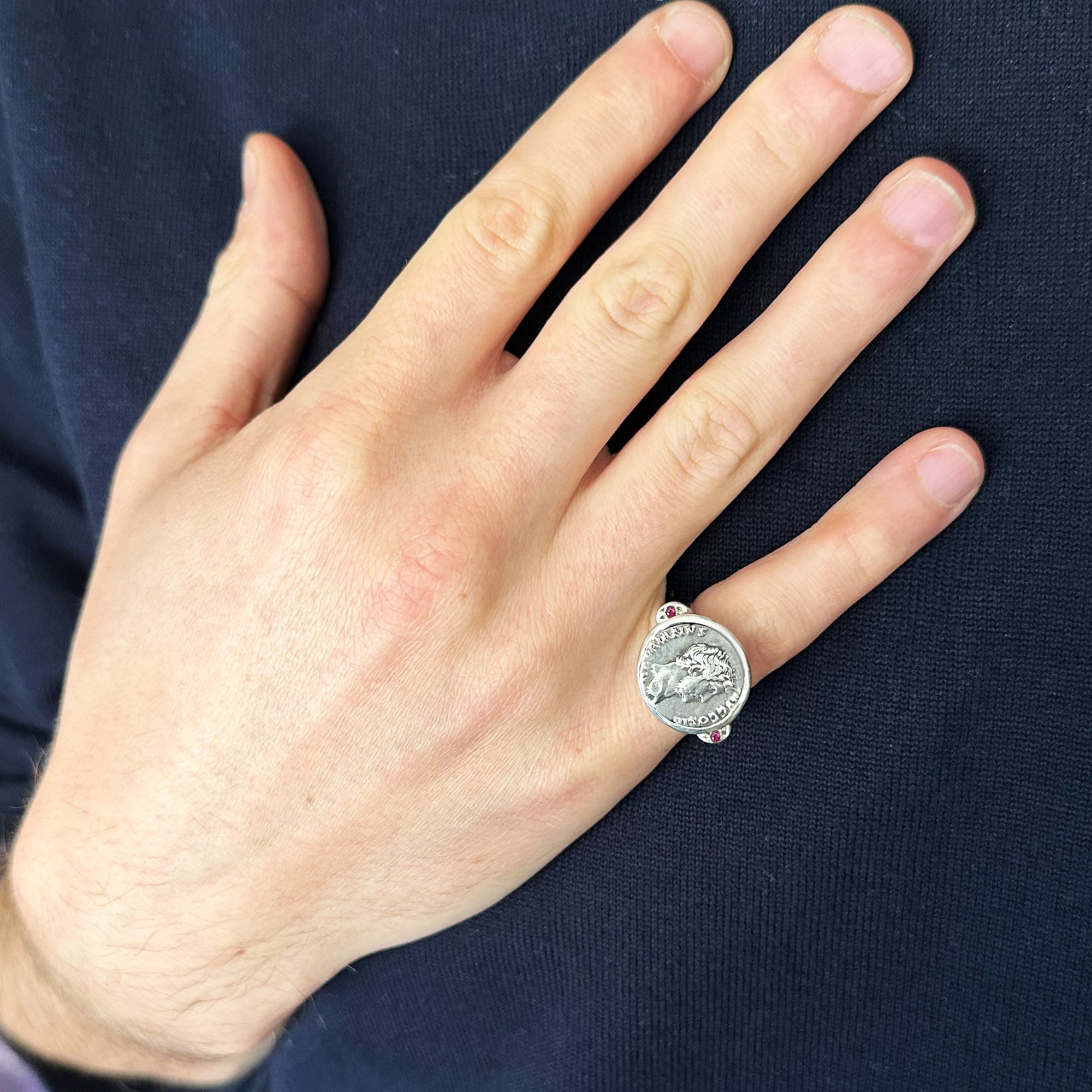 Realizzato dai nostri abili orafi, questo anello in argento sterling mette in mostra un'autentica moneta romana del II secolo d.C. raffigurante l'imperatore Adriano, accentuata da due rubini laterali. Il retro dell'anello ritrae elegantemente la Dea Fortuna in piedi. Ogni pezzo, meticolosamente realizzato a mano, reca un certificato di autenticità che verifica l'autenticità della moneta.