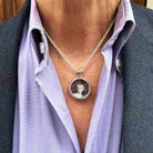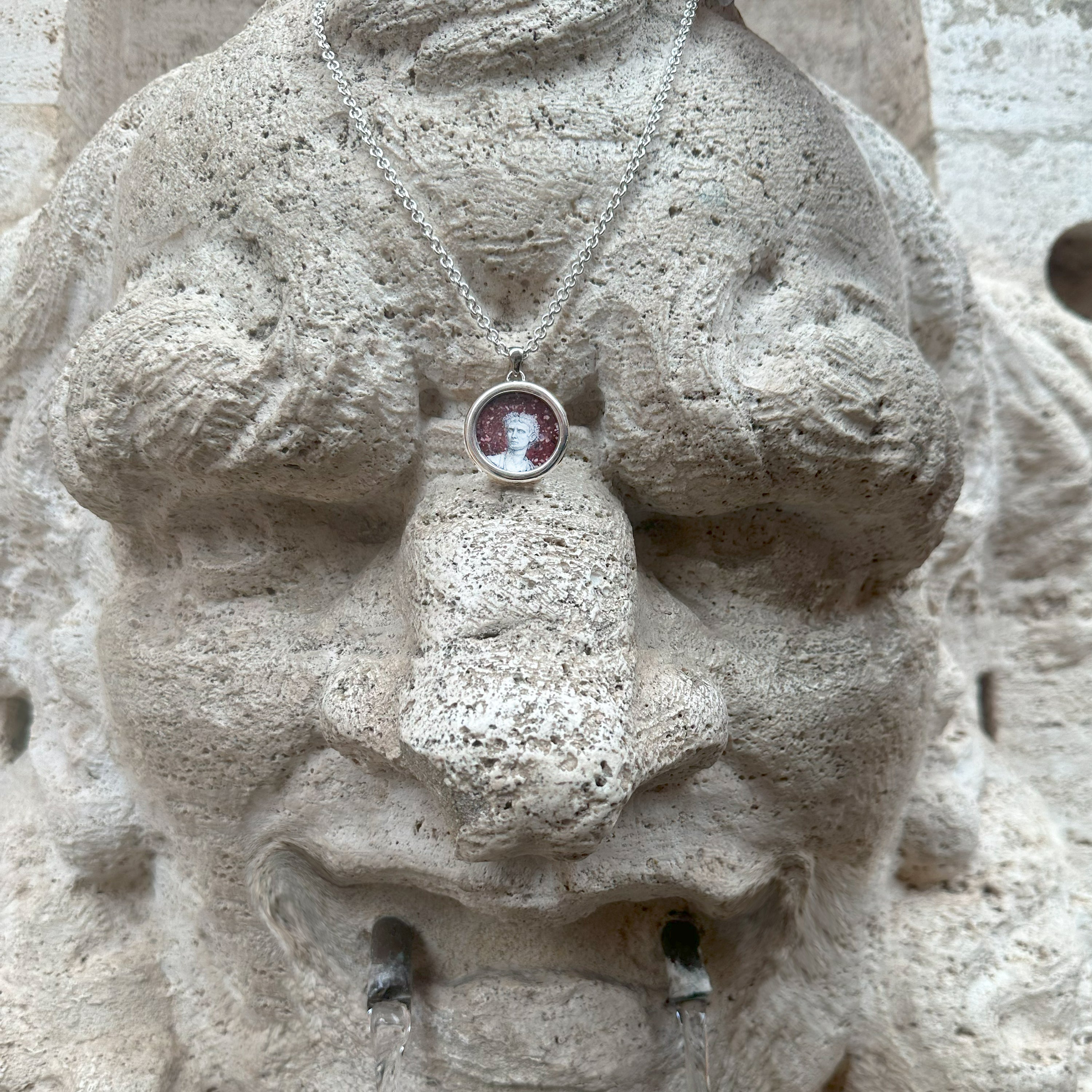 Questo pendente presenta una rappresentazione dipinta a mano dell’Imperatore Romano Augusto, abilmente realizzata dall'artista Tommaso Rossi su porfido rosso. Incastonato in argento massiccio, celebra Augusto, il primo imperatore di Roma e un simbolo di potere e saggezza politica. Il tono rosso profondo del porfido offre un contrasto straordinario, mettendo in risalto i tratti nobili dell'imperatore, mentre l'incastonatura in argento aggiunge un tocco di eleganza senza tempo.