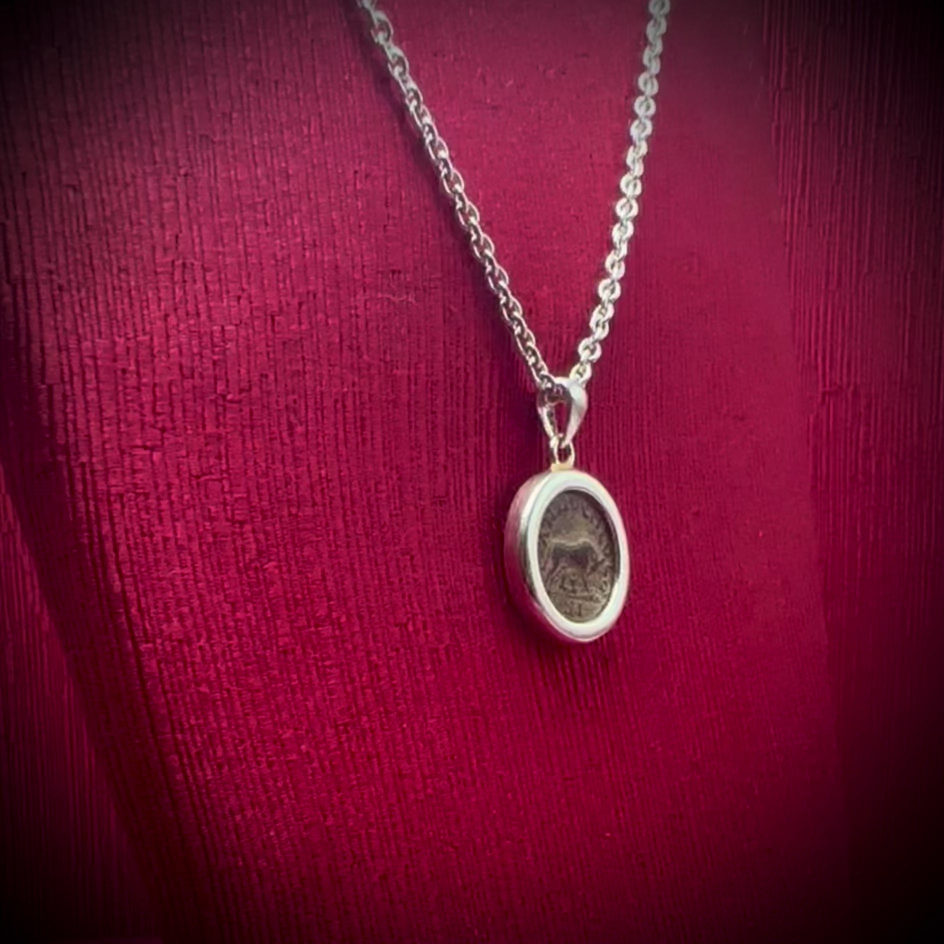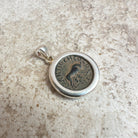 All'interno di questo ciondolo in argento sterling si trova una moneta romana autentica risalente al II secolo d.C., che raffigura l'iconica immagine della lupa che allatta i gemelli Romolo e Remo. Sul retro della moneta è presente il busto dell'imperatore Alessandro Severo.