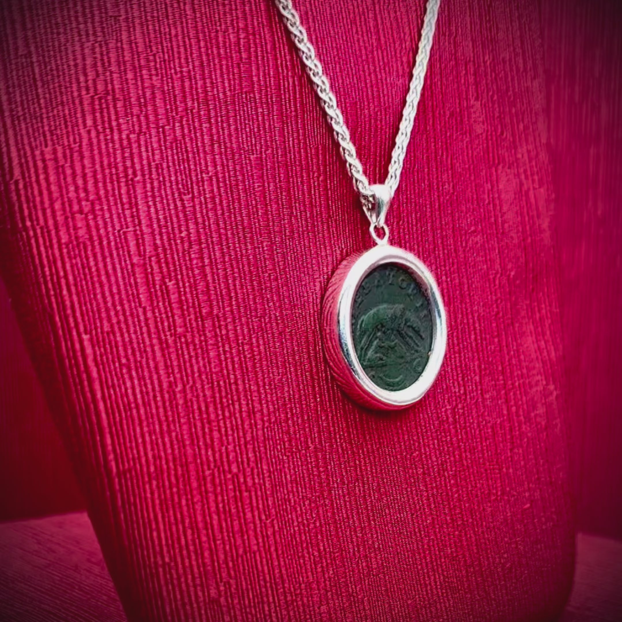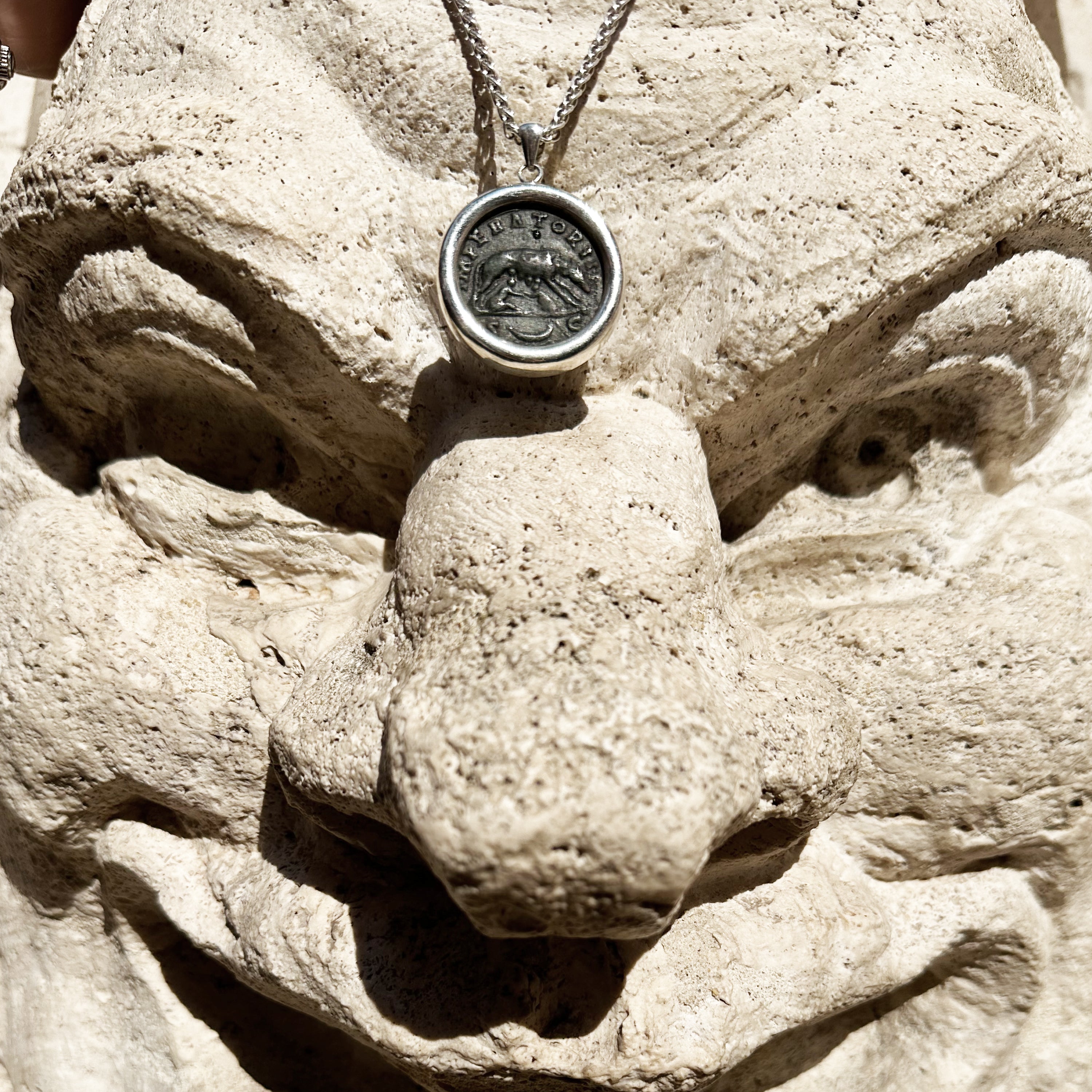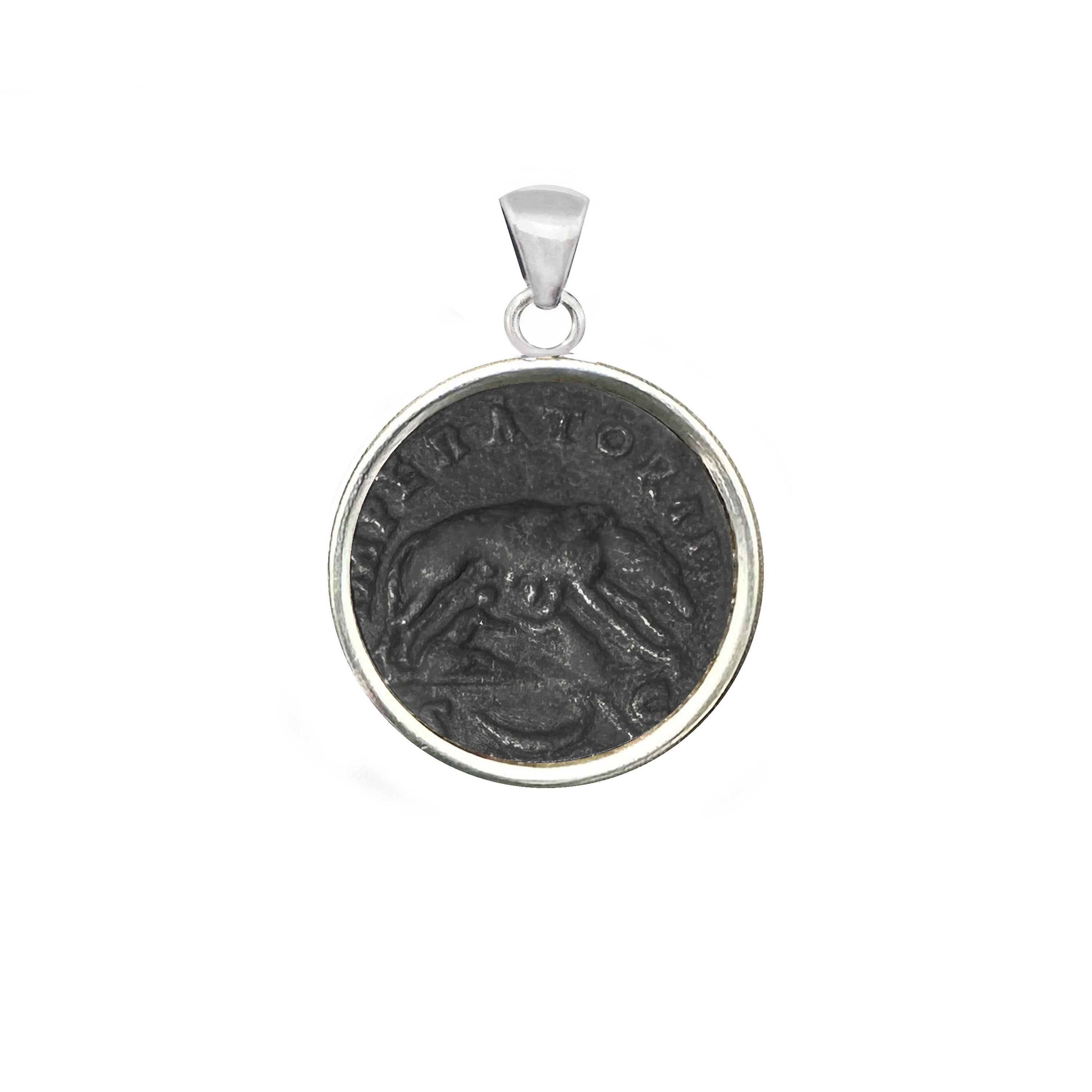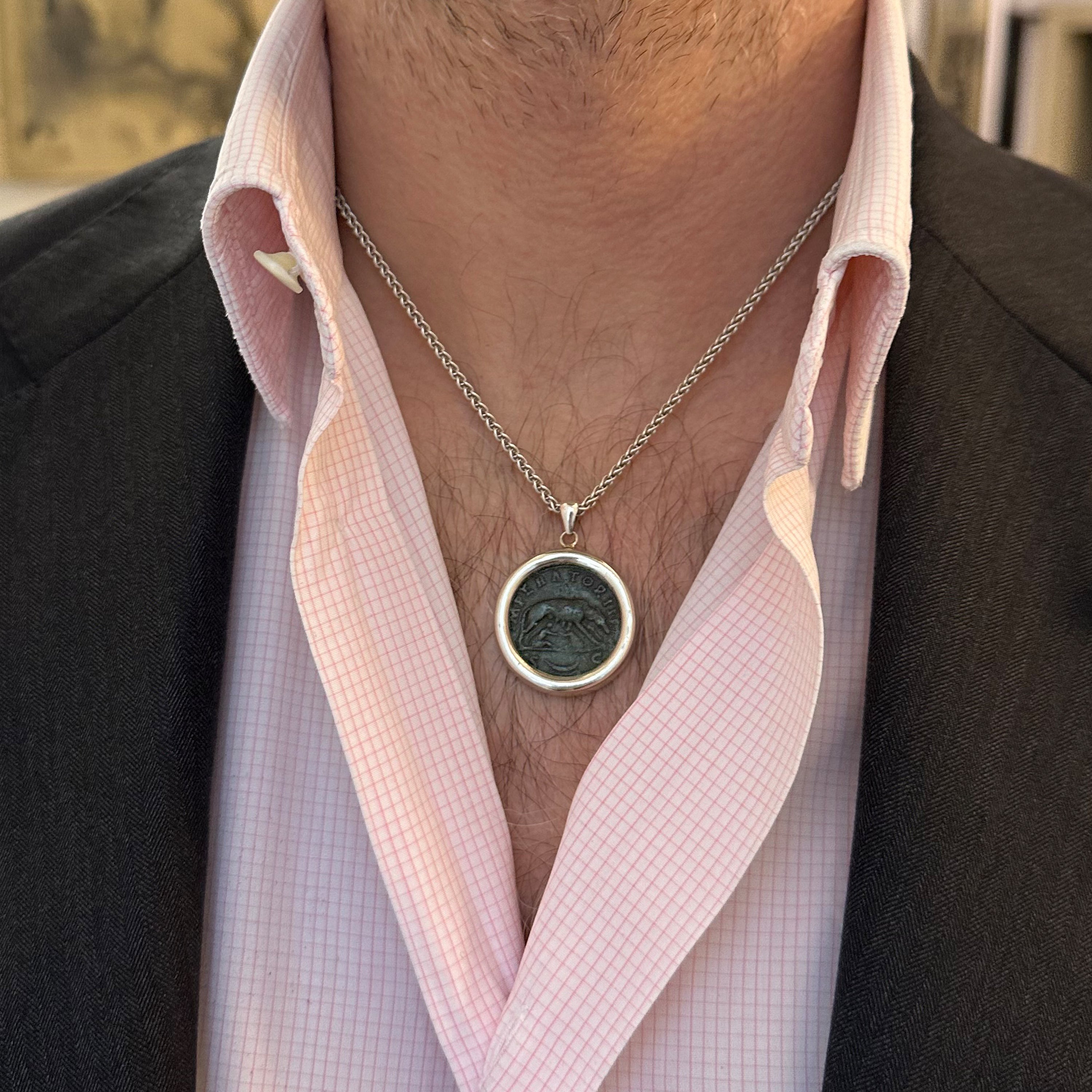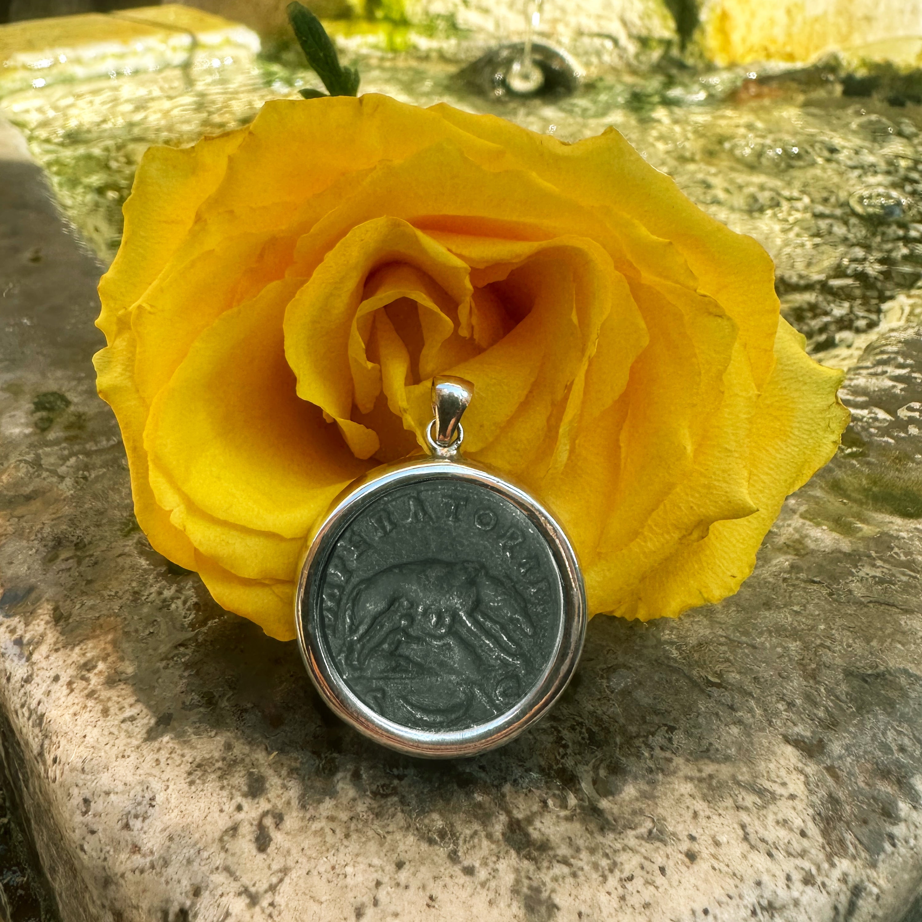 Questo ciondolo in argento sterling presenta con orgoglio una moneta autentica in bronzo romano con l'iconica immagine della Lupa Capitolina che allatta i gemelli Romolo e Remo. Sul retro, una raffigurazione dell'imperatore Antonino Pio.