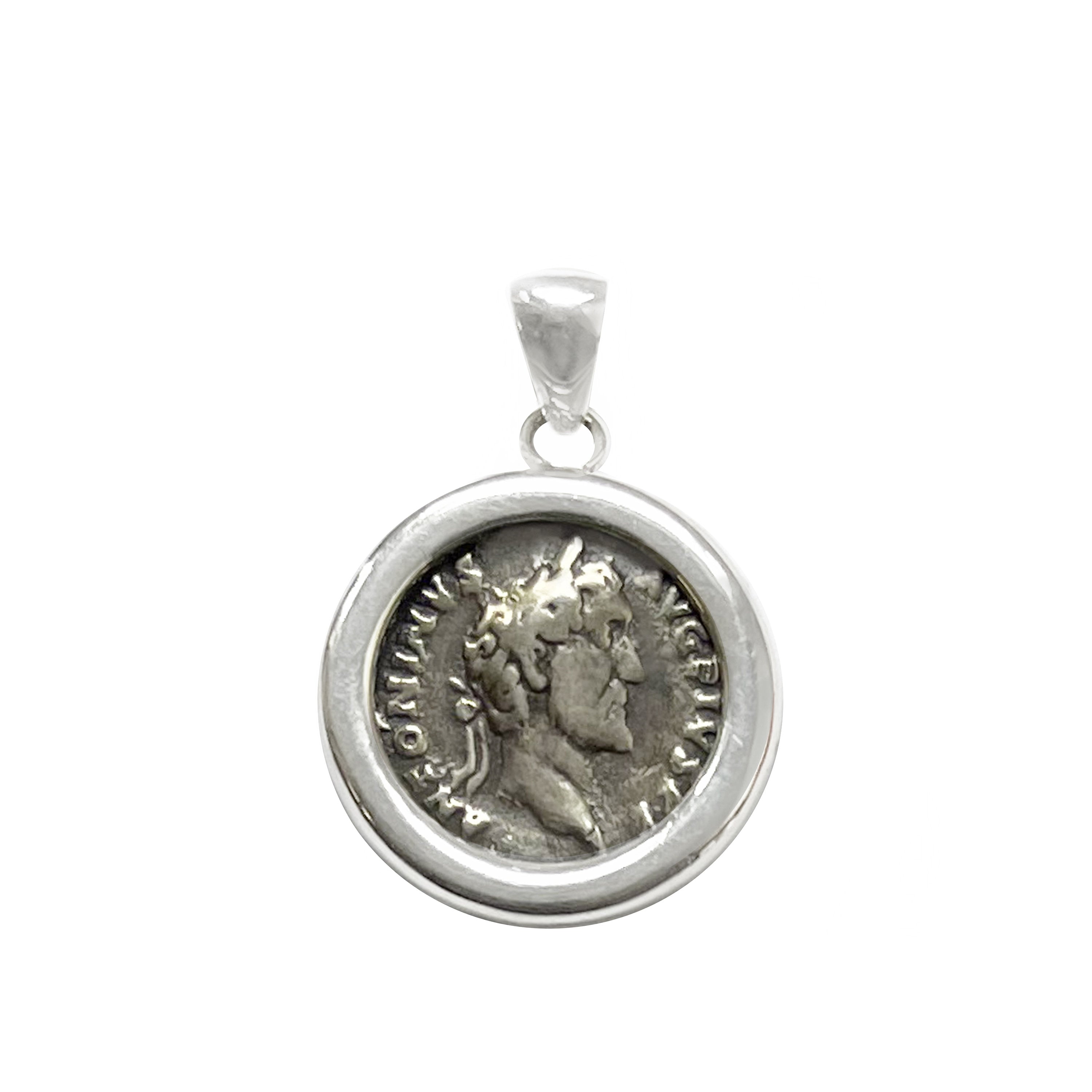 This pendant showcases an original Roman coin from the 2nd century AD featuring the likeness of Emperor Antoninus Pius on one side and Italy on the reverse. Antoninus, born into a senatorial family, held various positions during Emperor Hadrian's rule. Hadrian, who adopted Antoninus as his son and heir shortly before his passing, bestowed the name "Pius" upon him upon ascending the throne. This moniker may have been earned for compelling the Senate to deify his adoptive father or for saving senators condemned to death during Hadrian's later years.