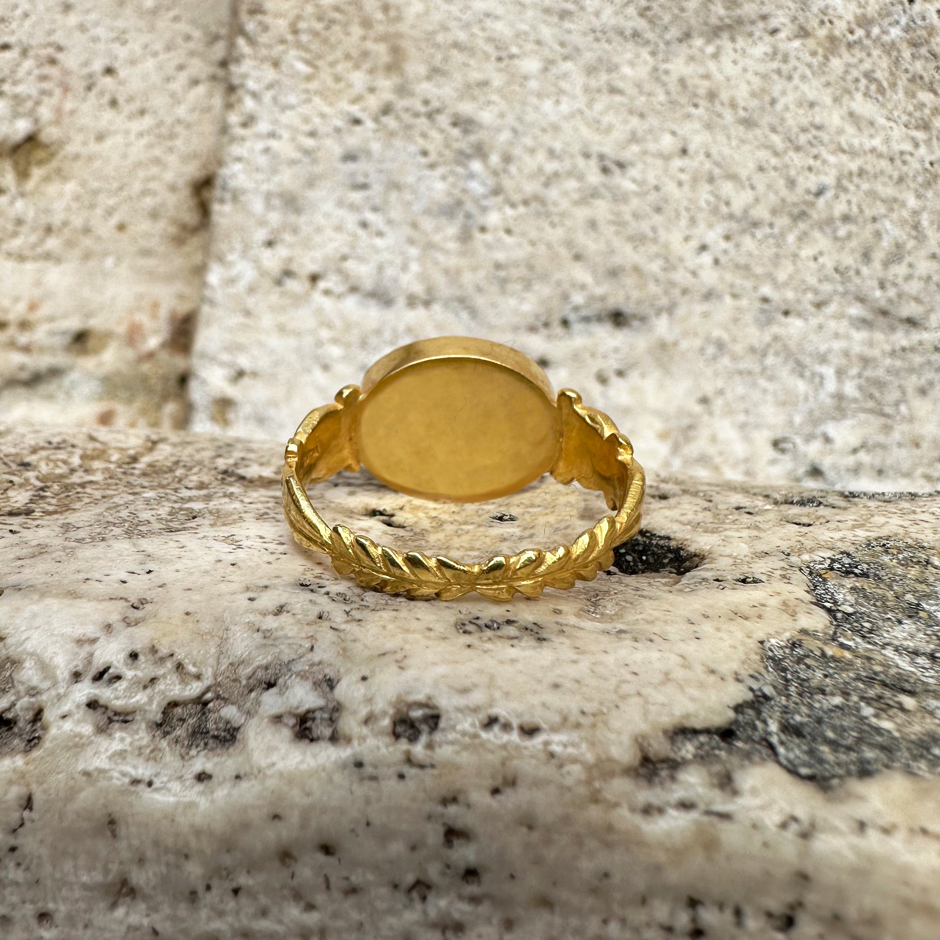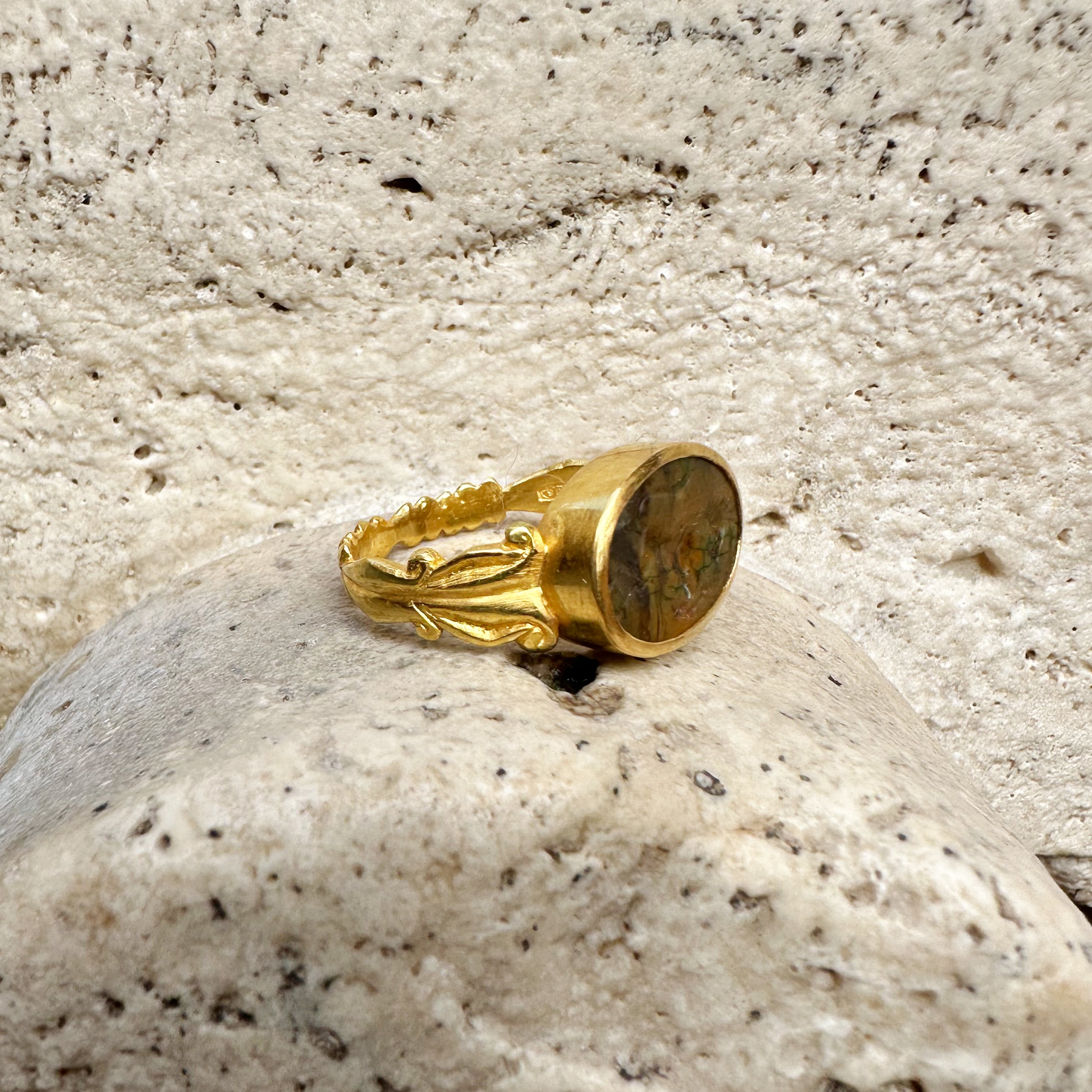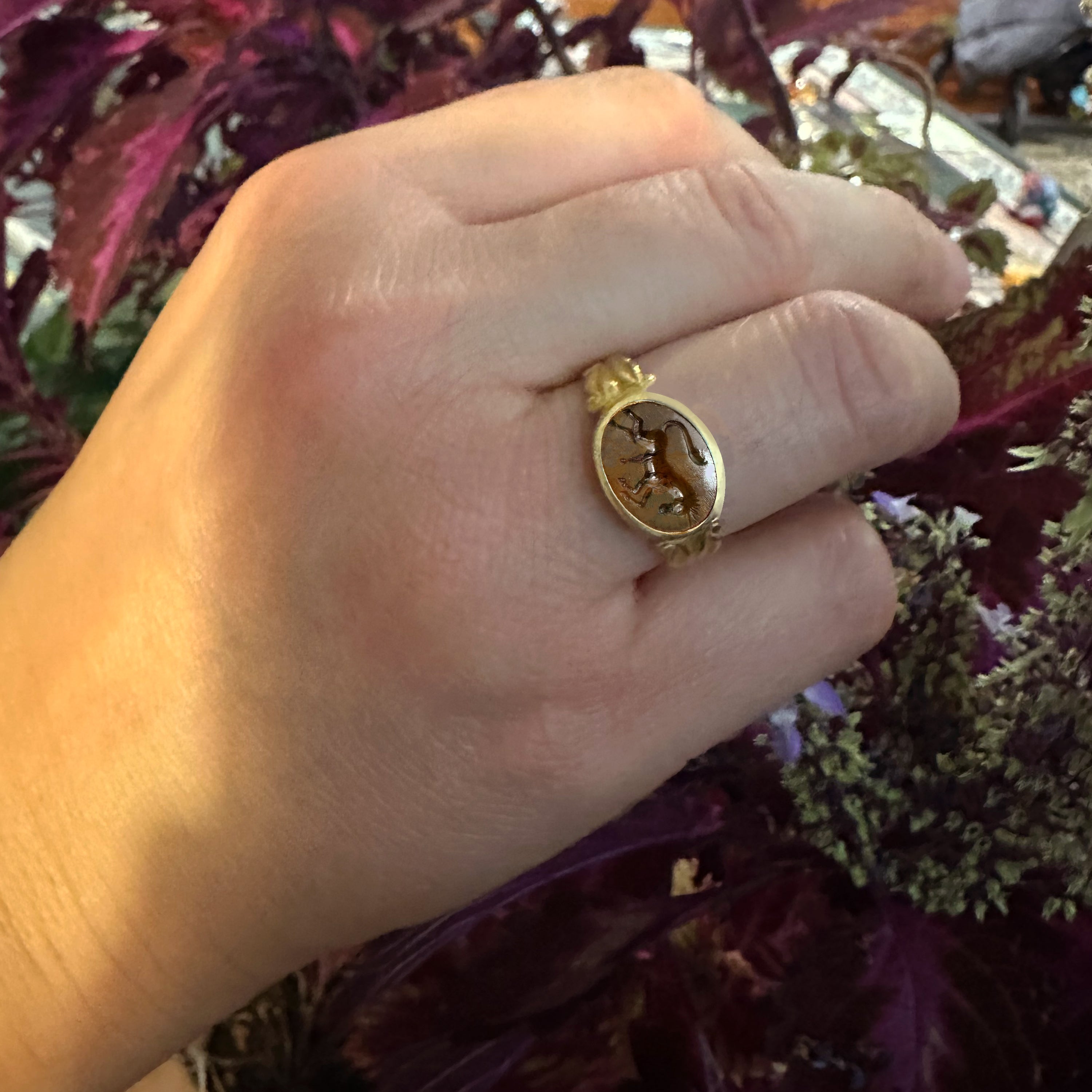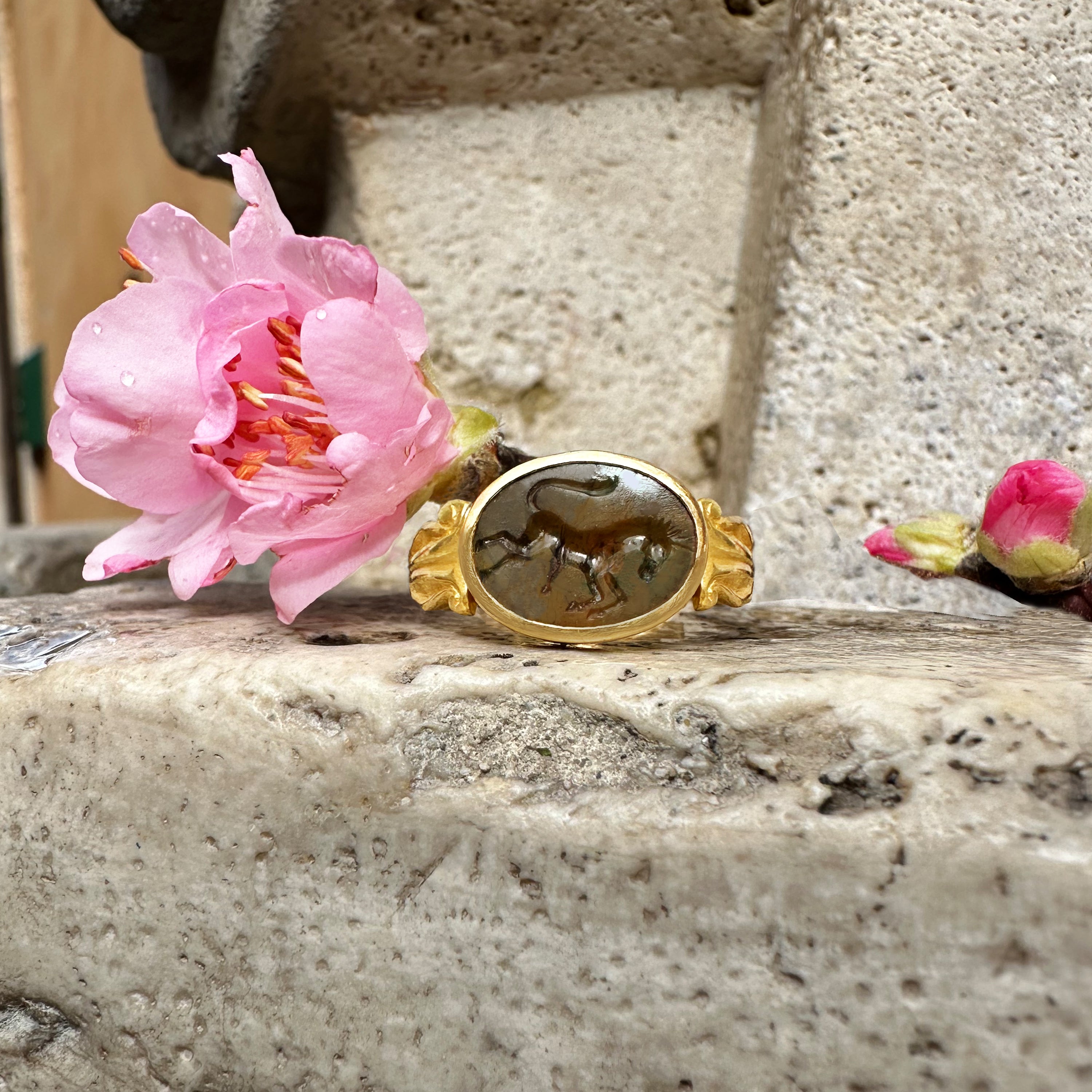 This 18 Kt gold ring features an authentic Roman jasper dating back to the first-second century AD. The jasper depicts a grazing horse, which was highly revered in ancient Roman culture as a symbol of rebirth, fertility, and strength. Horses were considered to be fully intertwined with the myth and origins of the world, and they were often depicted in public art and household items.