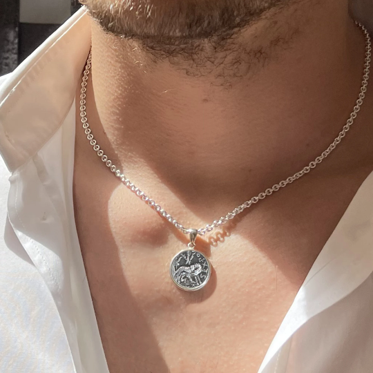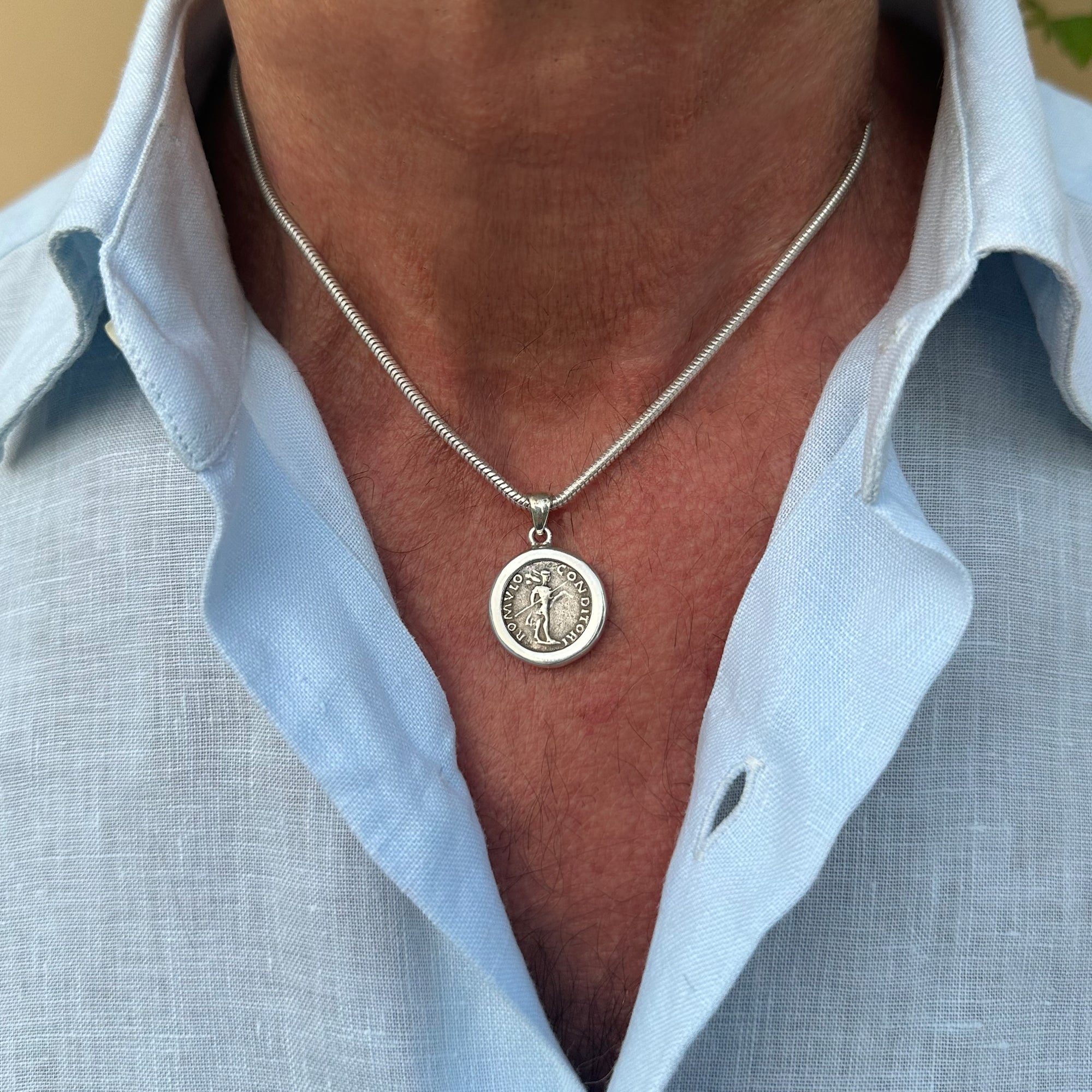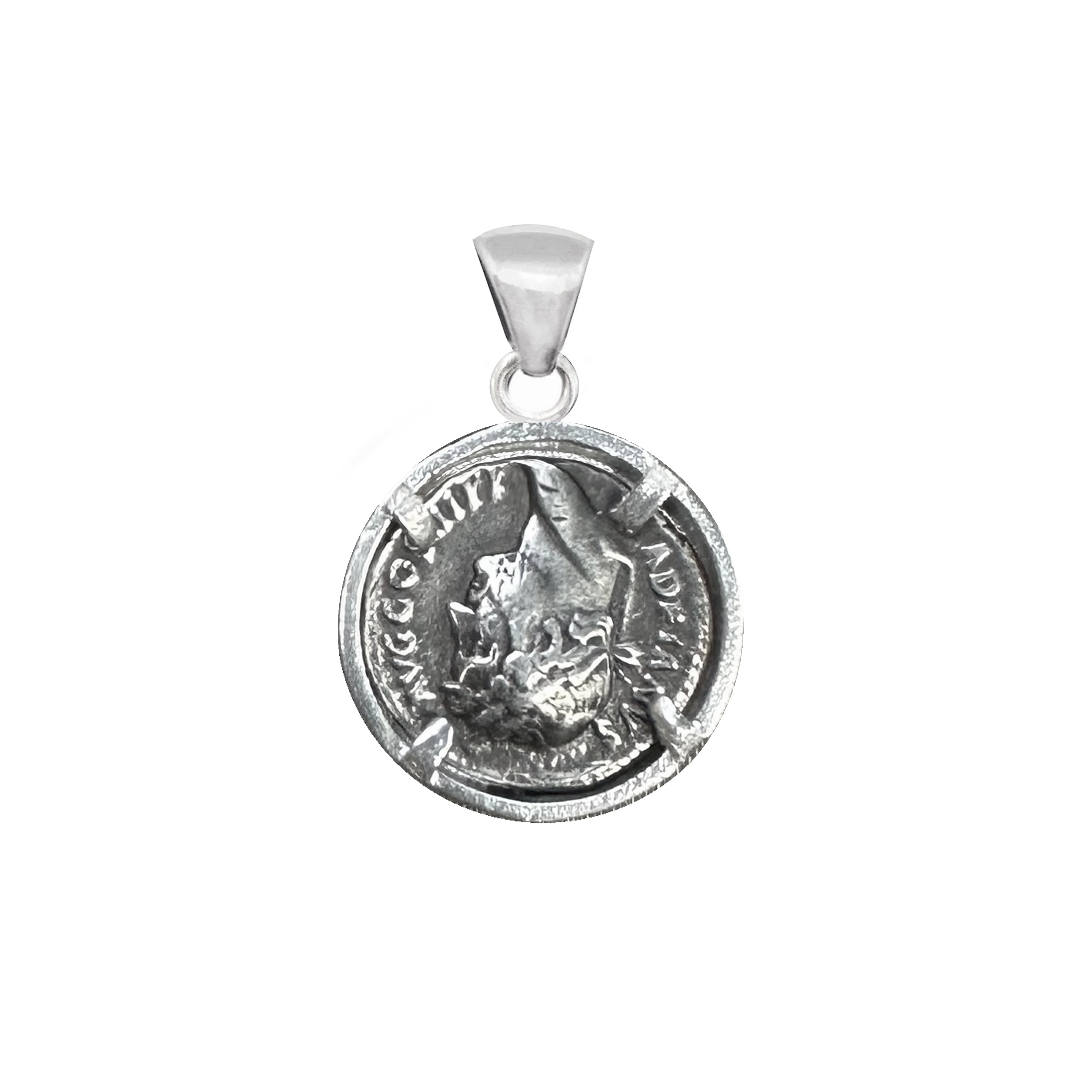 In this exquisite sterling silver pendant, a genuine Roman coin from the 2nd century AD takes center stage. It portrays Romulus, the legendary founder of Rome, on one side, while the reverse features the stately bust of Emperor Hadrian.