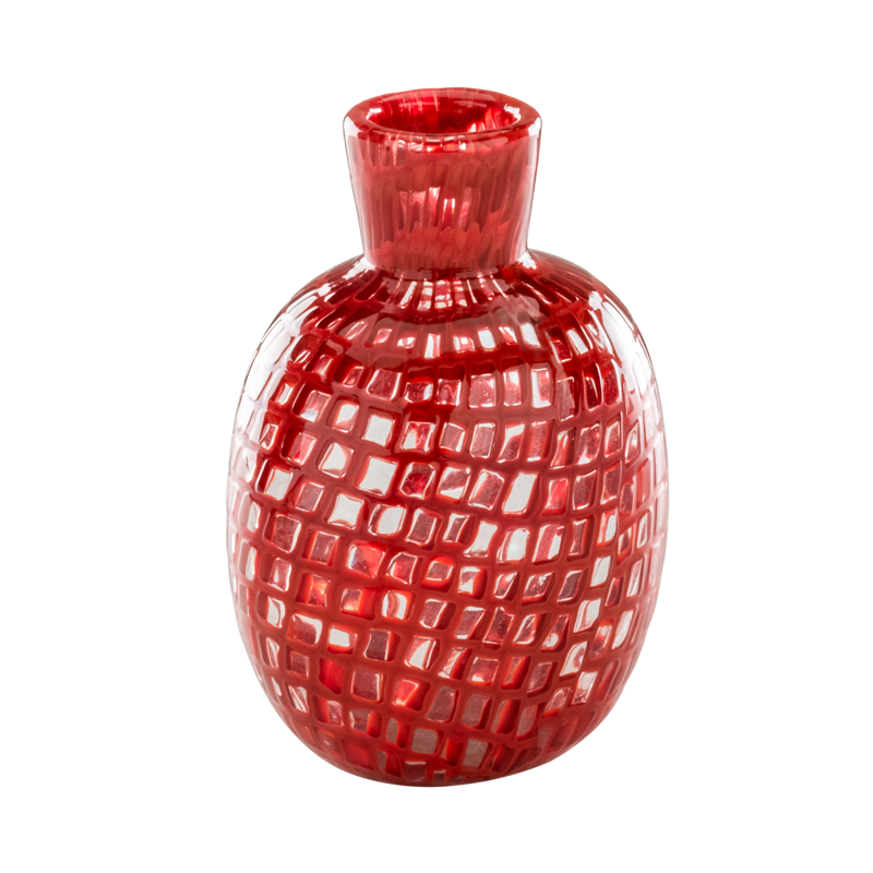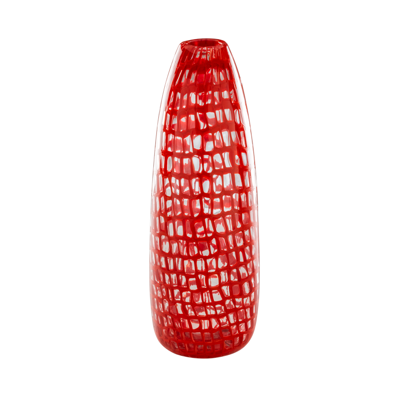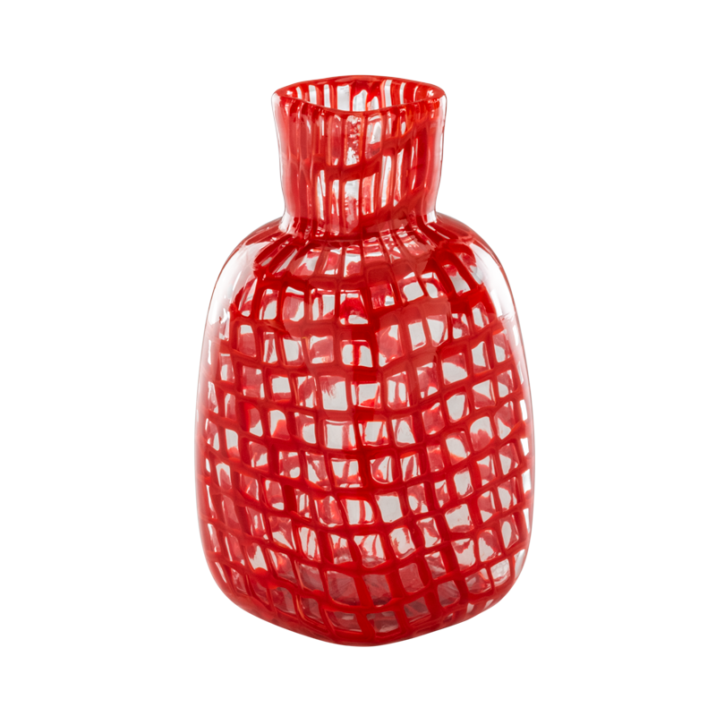 “Tobia Scarpa's is a game of looks, made of glass lenses with very fine colored edges, which form a multitude of soft and rounded volumes. High or low, more or less rounded, this vase never closes its eyes. And it attracts attention with its red.”