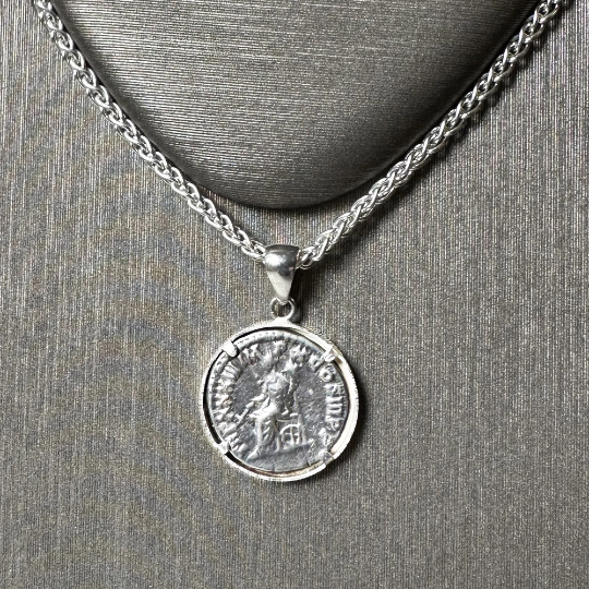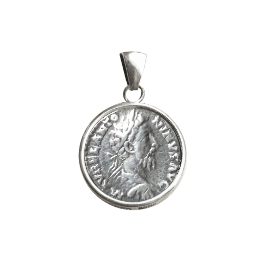 This sterling silver pendant features an authentic 2nd-century AD Roman coin depicting Emperor Marcus Aurelius. On the back, there is an image of Fortuna sitting on a throne with a rudder and cornucopia. Marcus Aurelius, born in AD 121, was betrothed to Aelius Caesar's daughter and later adopted by Antoninus. He became Caesar in AD 139, married Faustina Junior, and smoothly succeeded to the throne in AD 161. Known for his devotion to Stoic philosophy, he died in AD 180 and was deified.