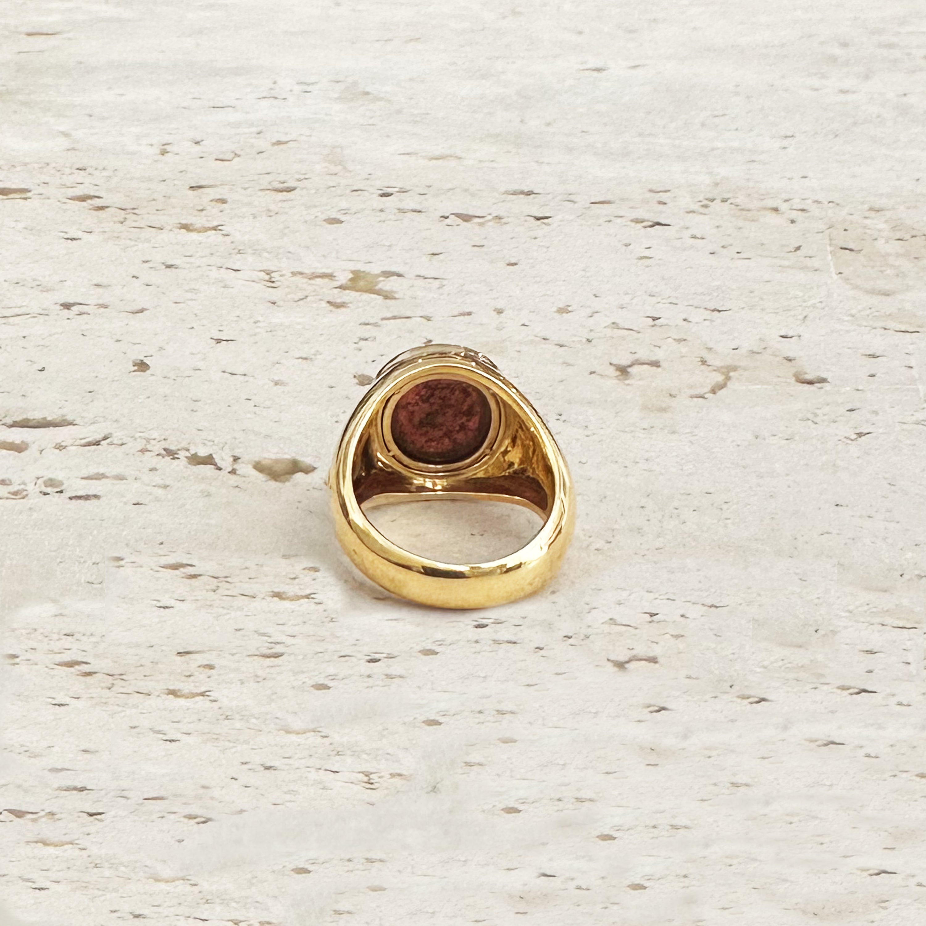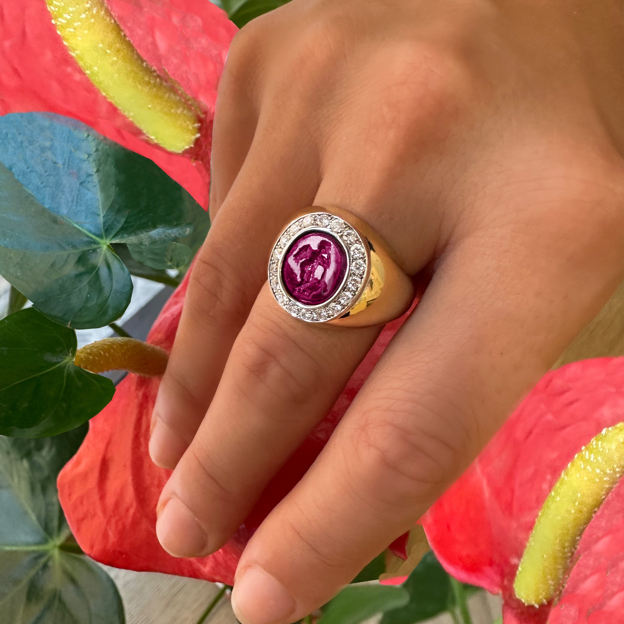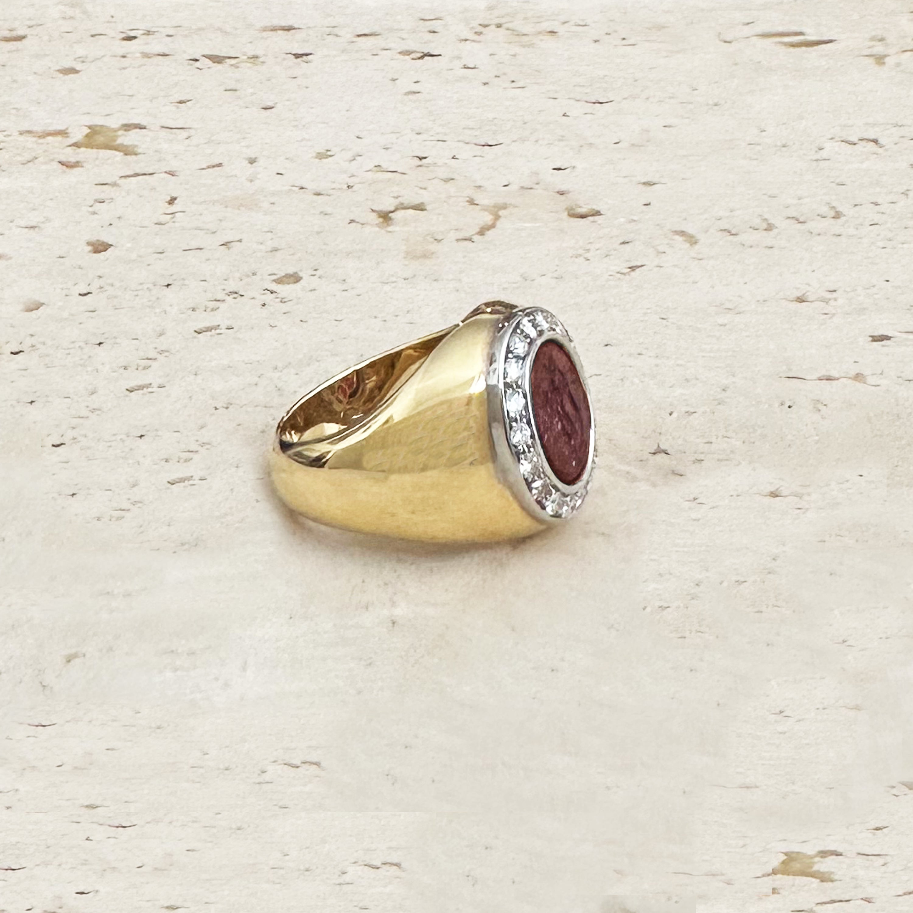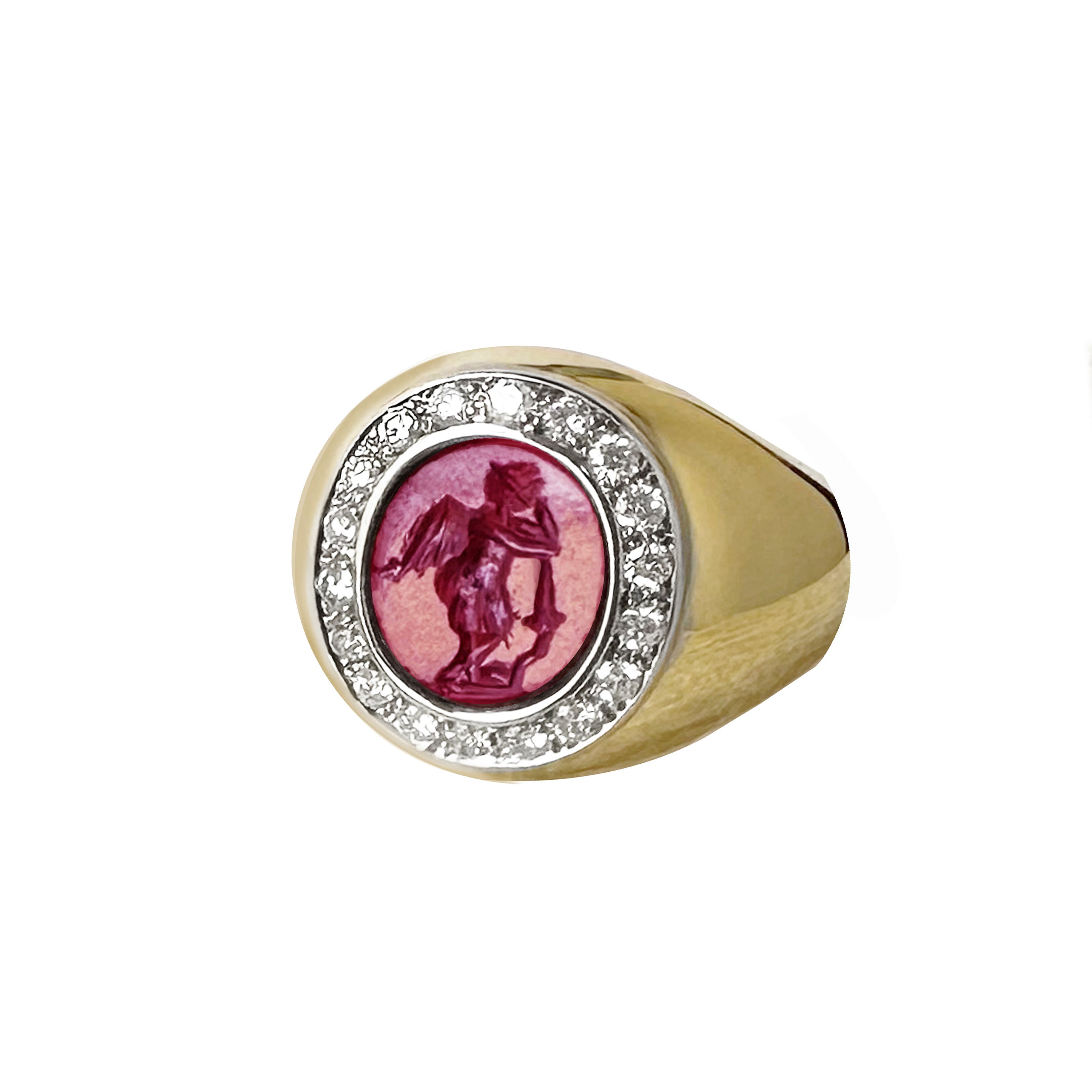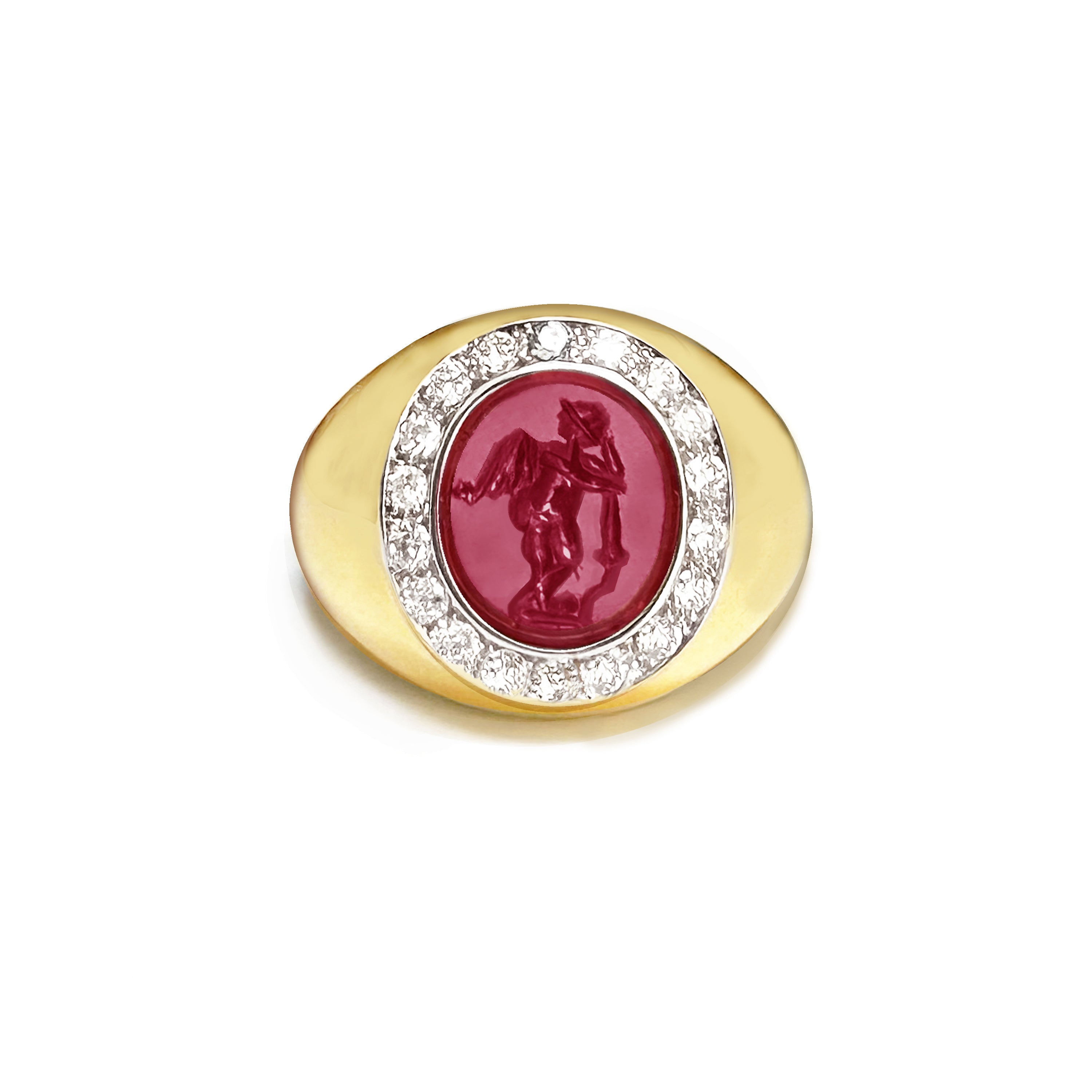 This elegant 18 Kt gold ring showcases a captivating authentic Roman intaglio on a vibrant garnet stone. The intaglio portrays a graceful winged Cupid, leaning tenderly on a torch. Surrounding the central stone, 18 dazzling diamonds add up to a total of 0.70 Cts, enhancing its allure.