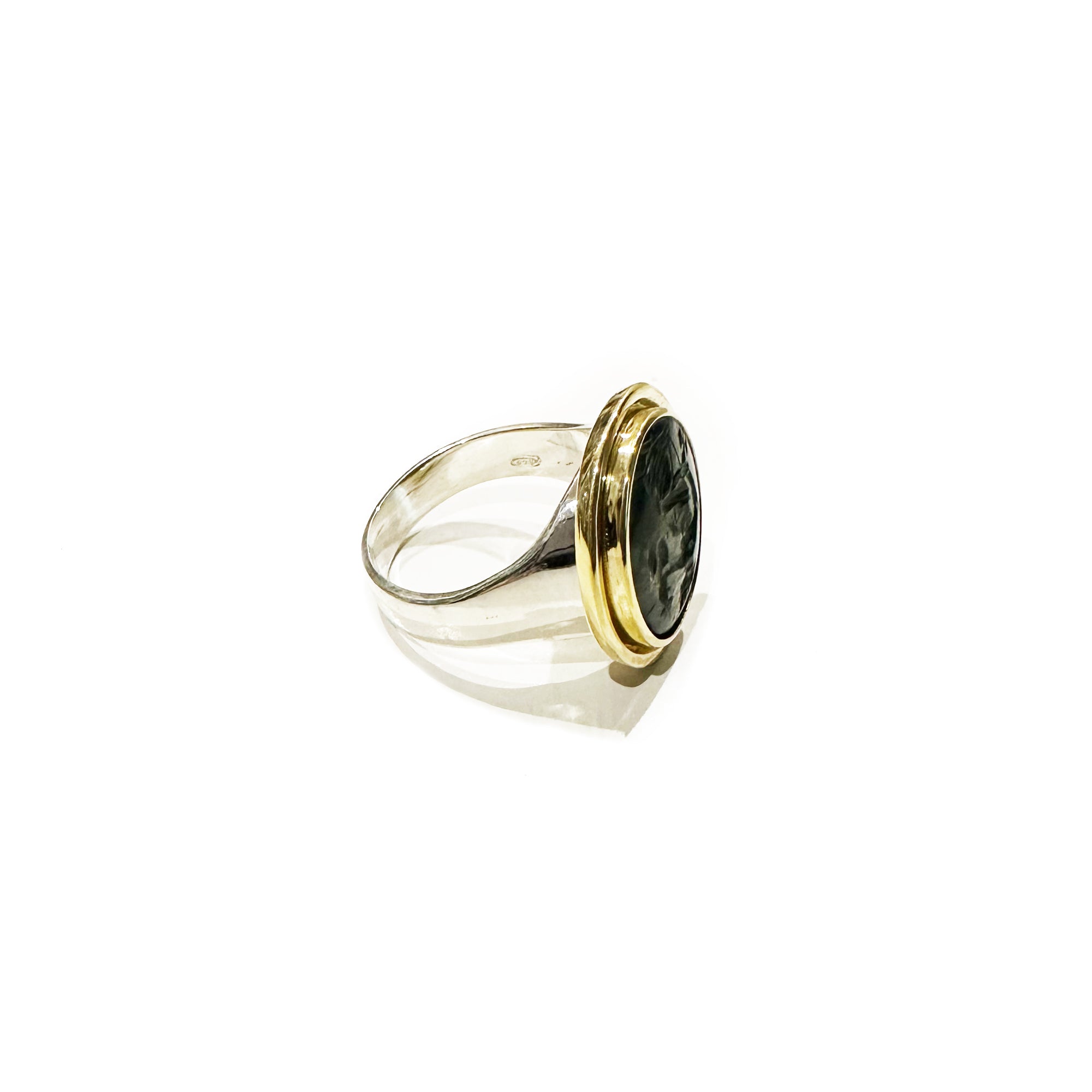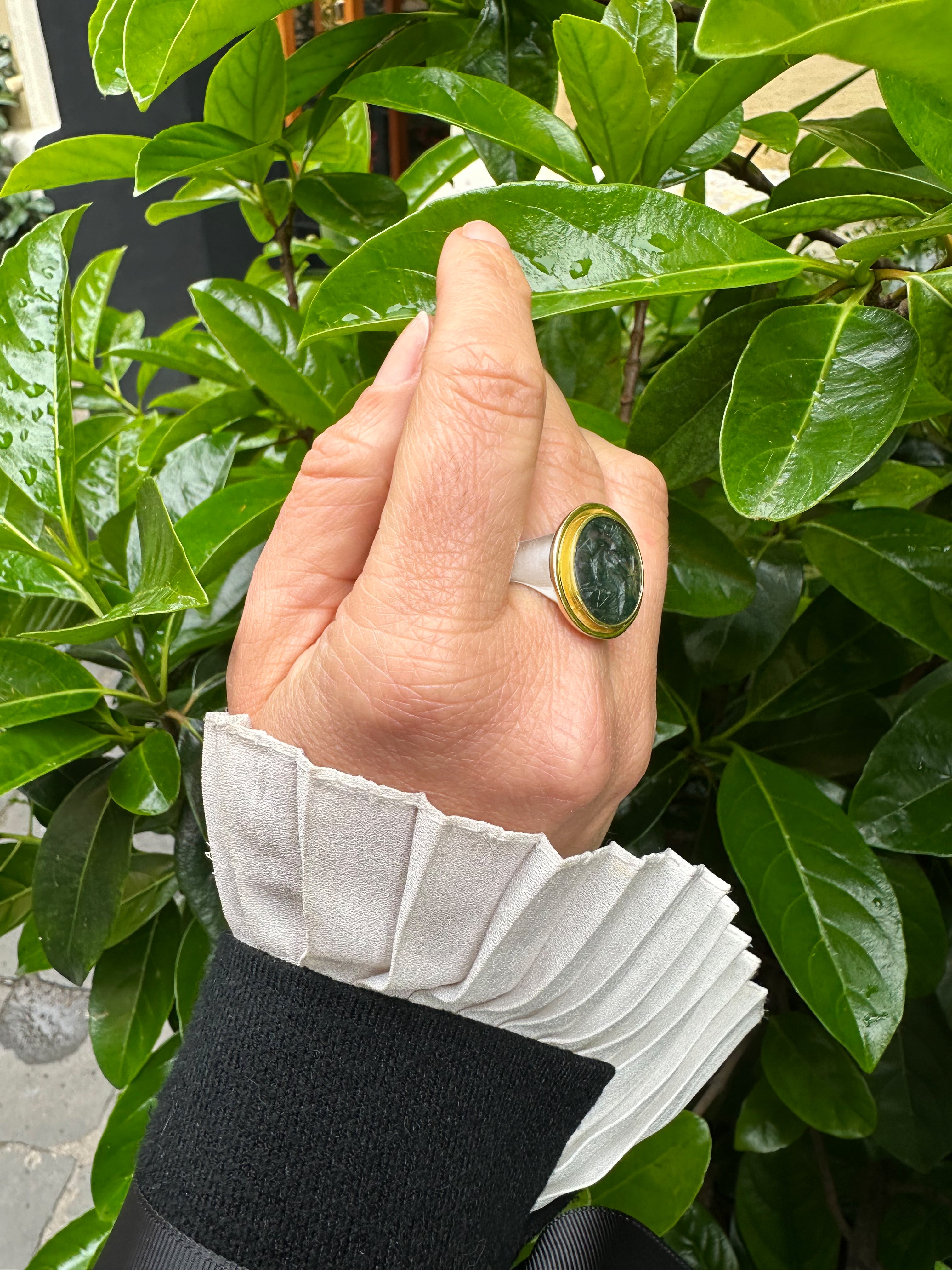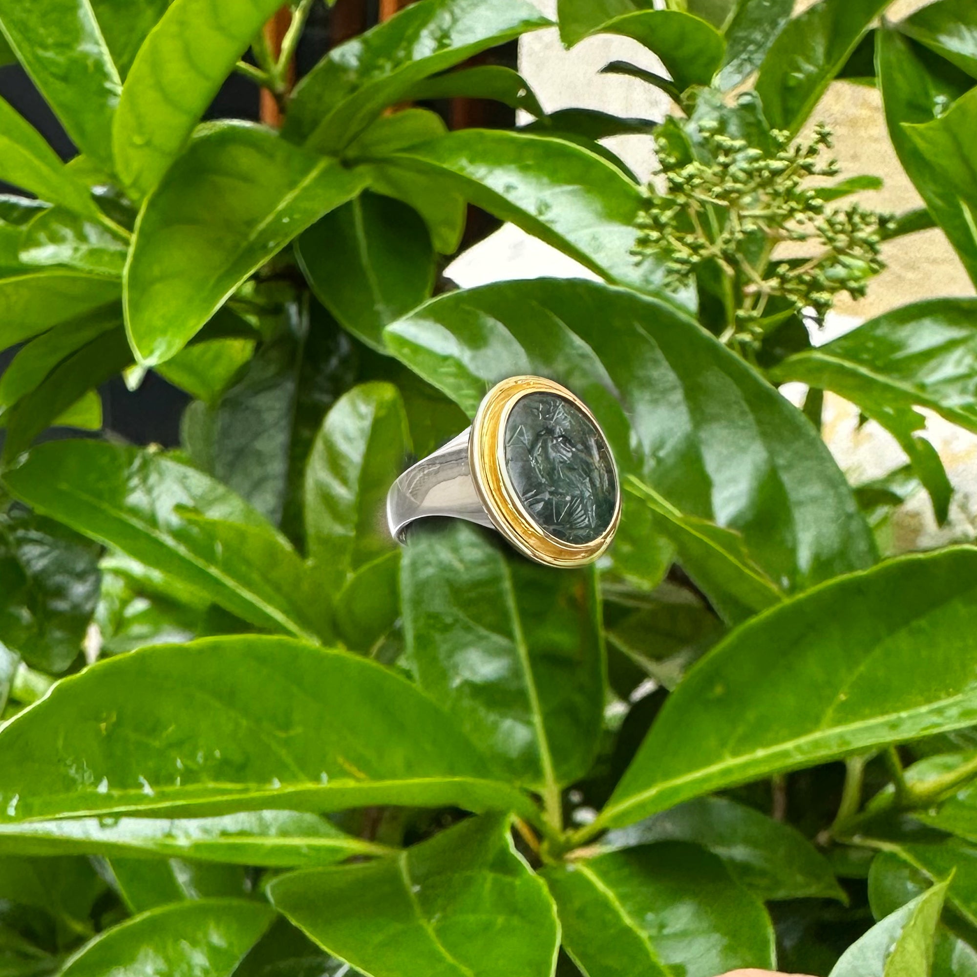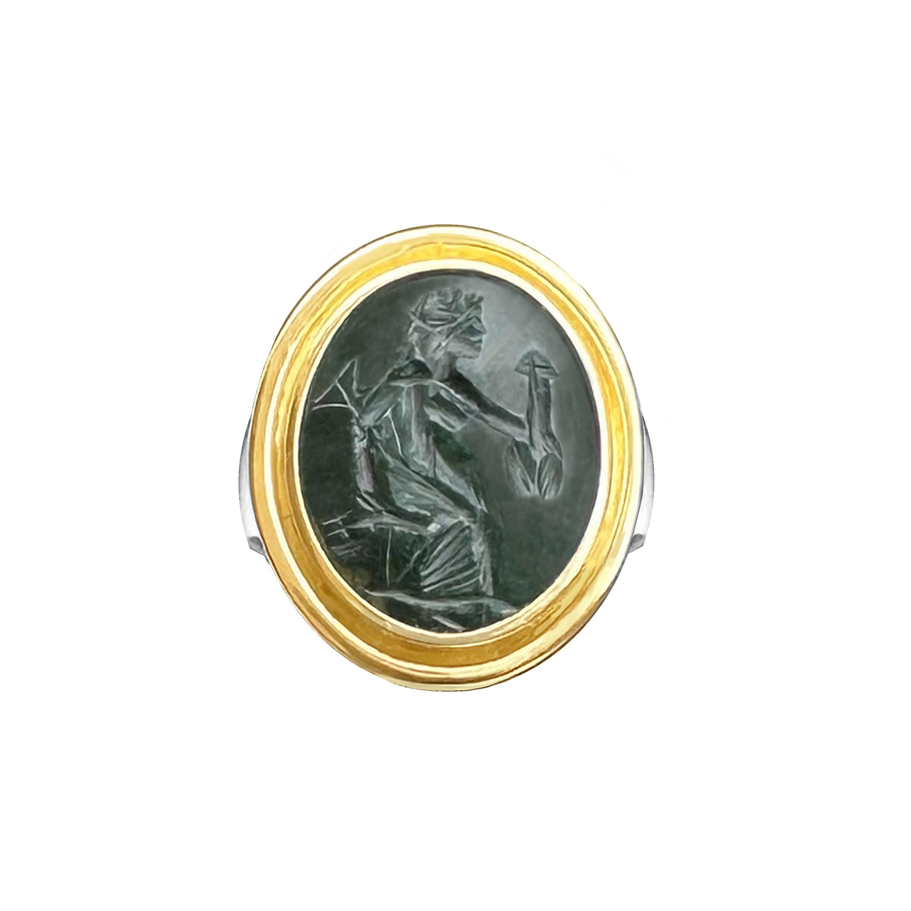 Authentic Ancient Roman intaglio on Prasio depicting Fortune with a phallus 18 kt gold and sterling silver ring