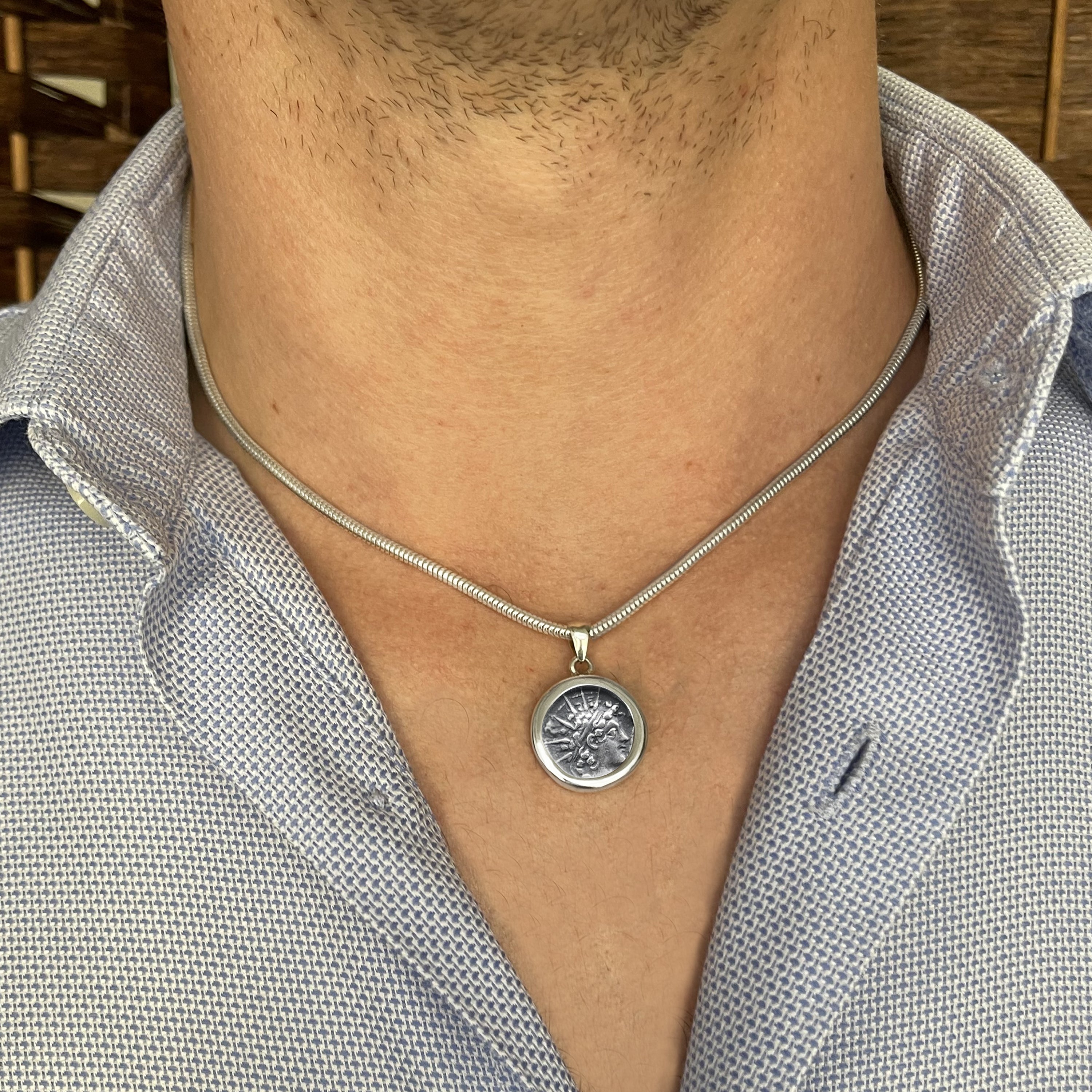 This sterling silver pendant features an authentic silver coin depicting Antiochus VI wearing a radiate crown. On the reverse side, the coin shows the seated god Apollo. Antiochus VI Epiphanes Dionysus (148 BC - 138 BC) was a nominal ruler of the Seleucid Empire from 145 to 140 BC, although he did not wield actual power.
